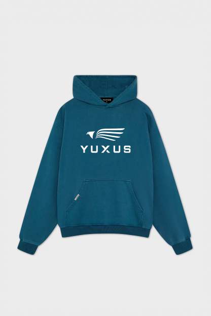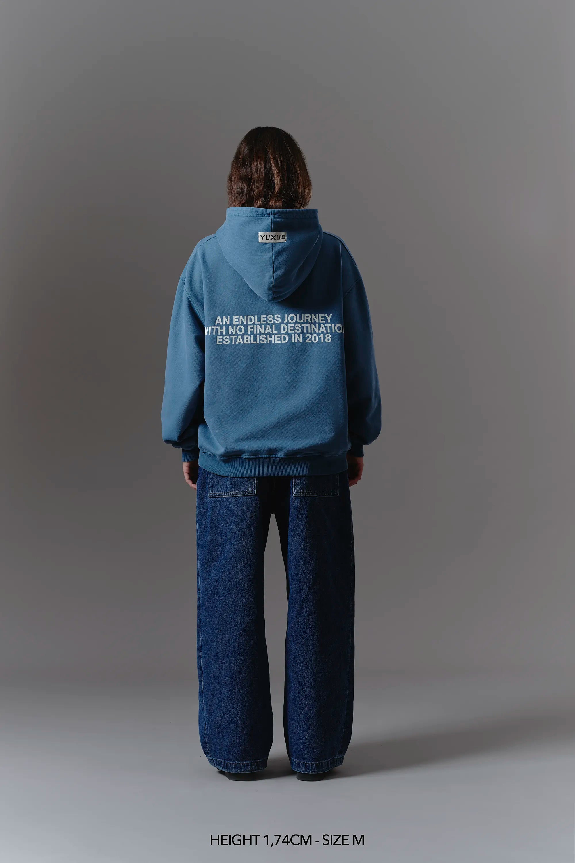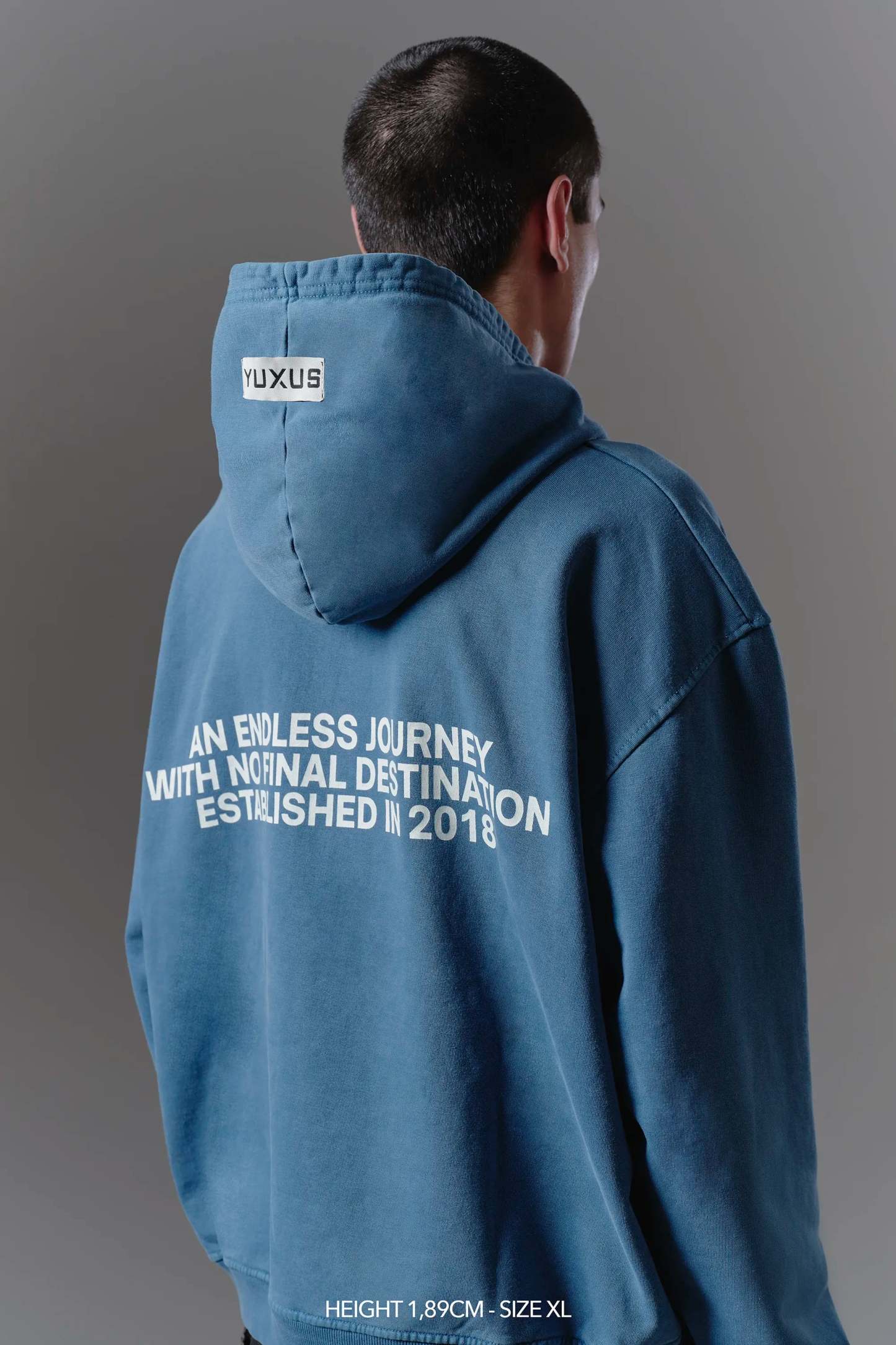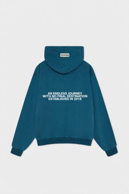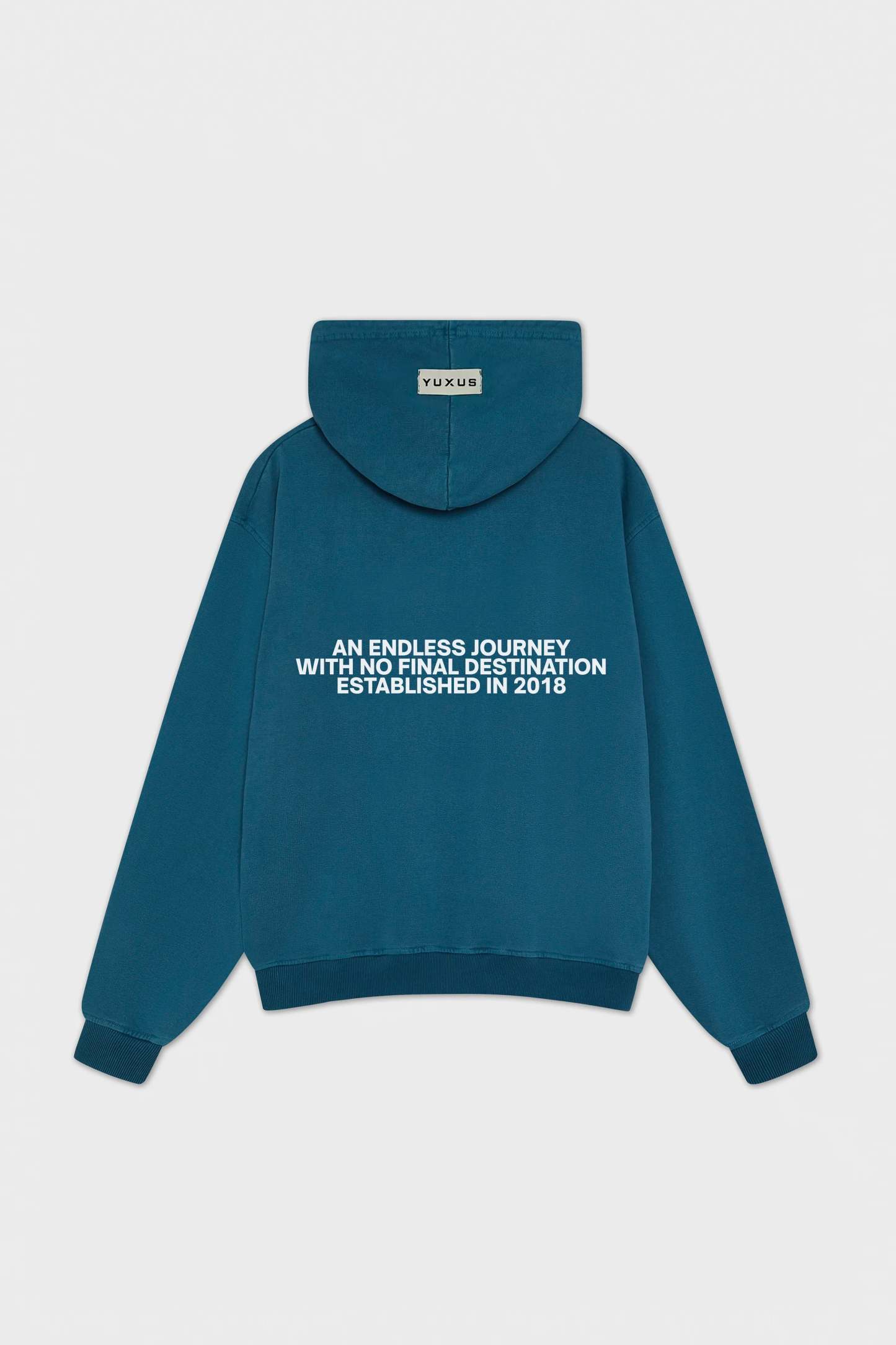 The journey begins here. Introducing the Voyager hoodie in basil blue, designed with a global vision to accompany you anywhere. Crafted from premium materials with oversized embroidered details and vibrant tones, this piece redefines functionality and style.
