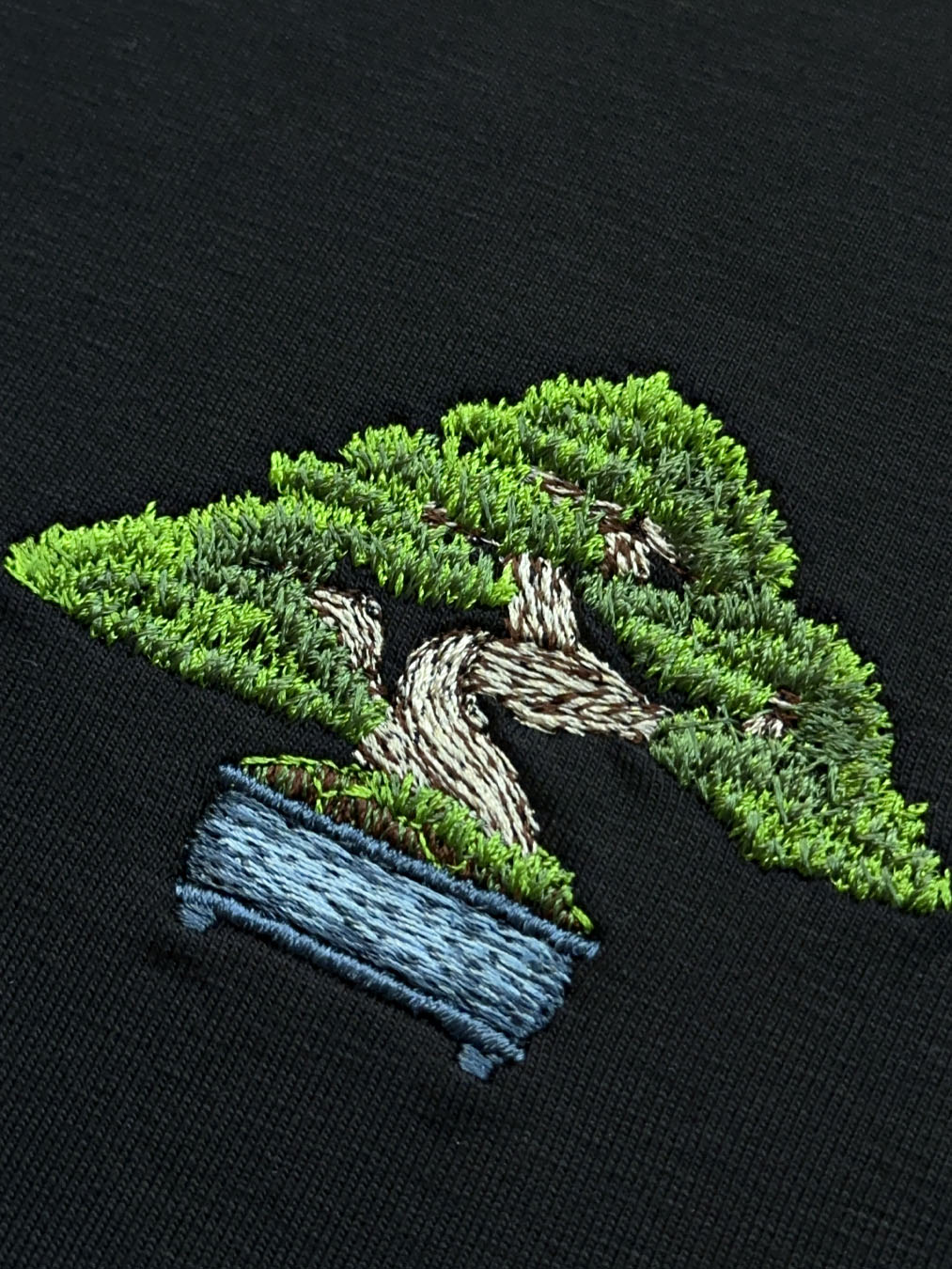 This embroidery design features a detailed mini bonsai tree, ideal for left chest or center placement.