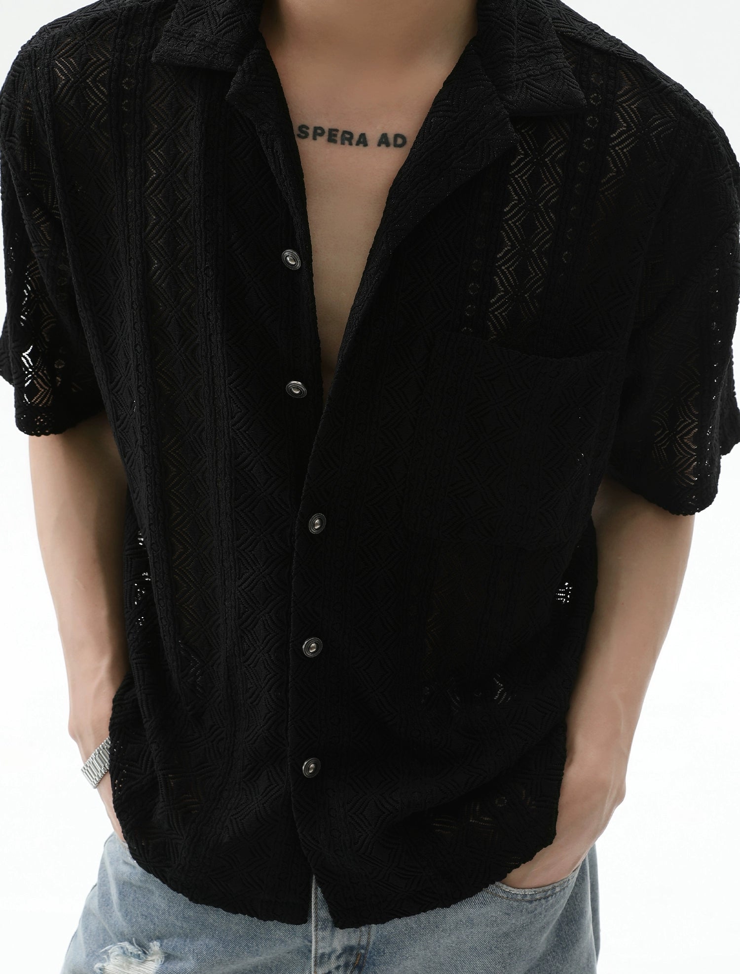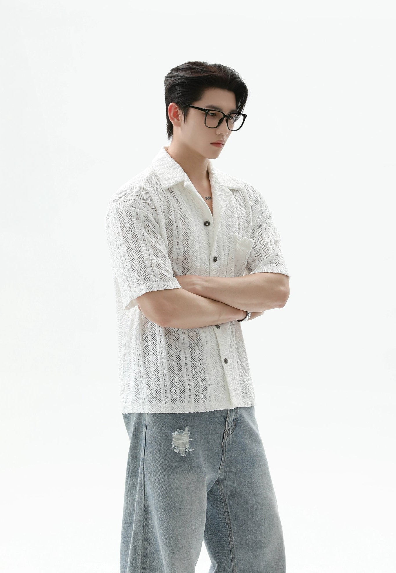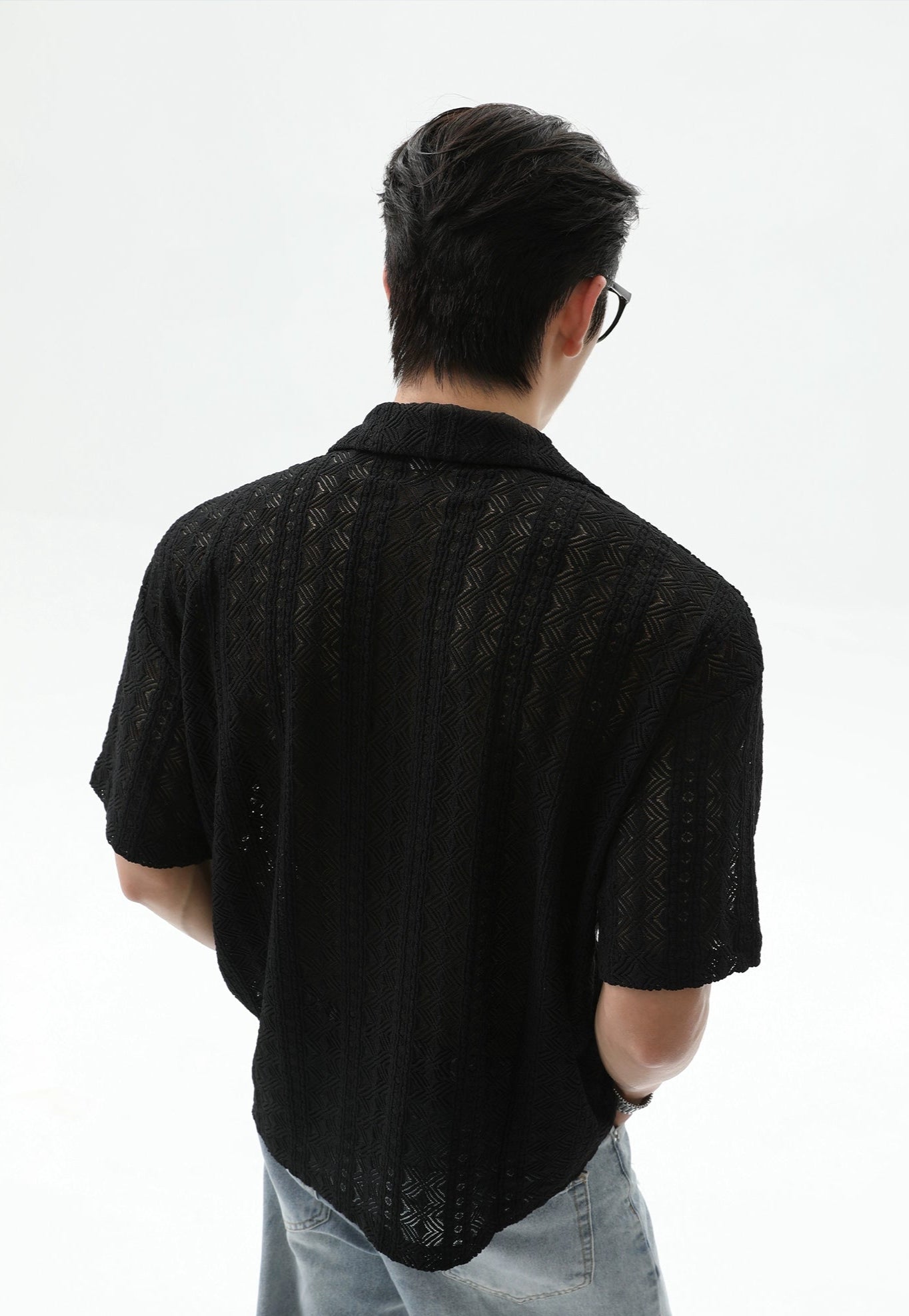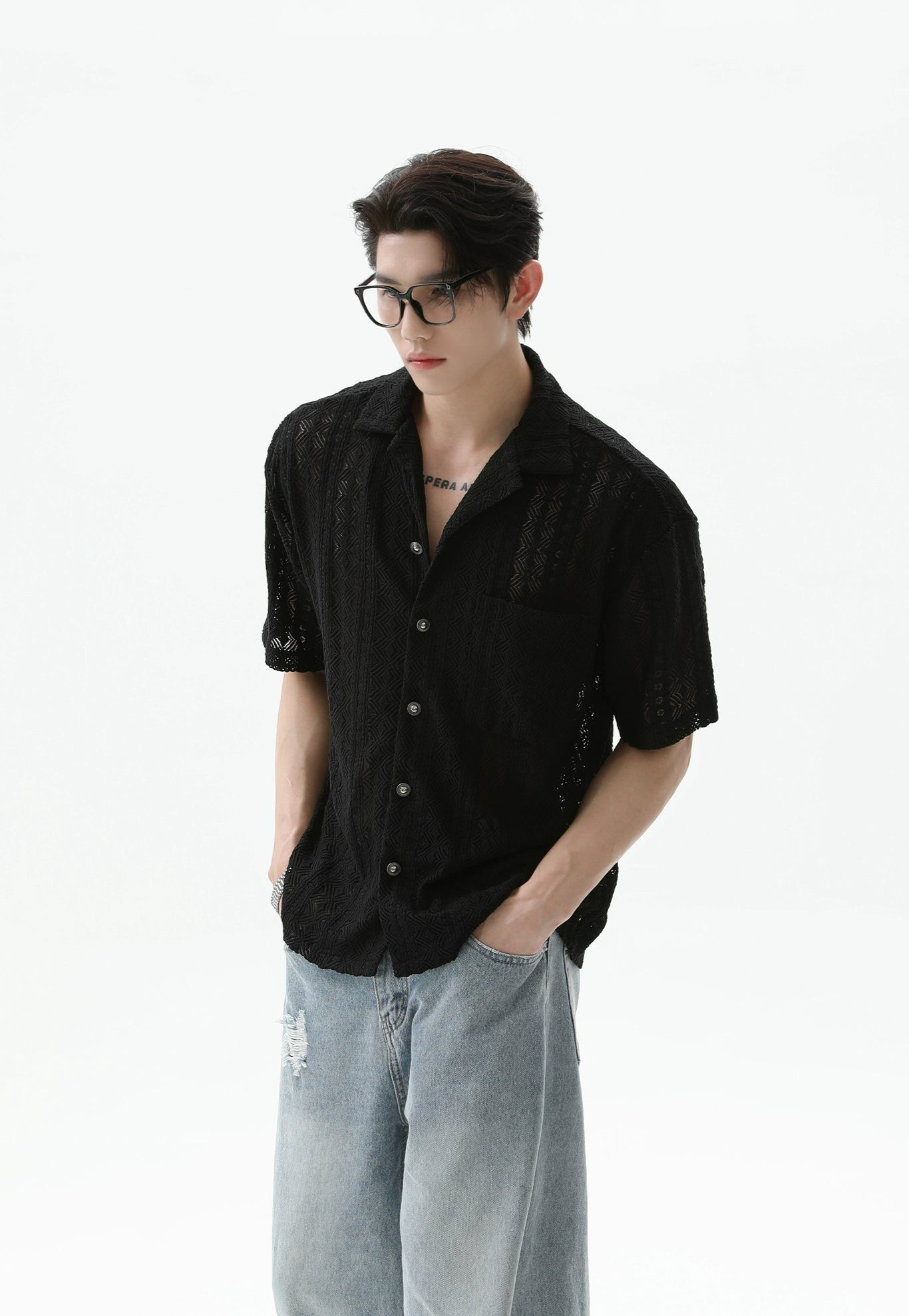 It’s laid-back but intentional, giving you texture, structure, and subtle transparency in all the right ways. Made with a light and breathable lace fabric, the open diamond pattern adds dimension while keeping the shirt easy to wear. The short sleeves, button-up front, and soft drape make it ideal for layering or wearing on its own.