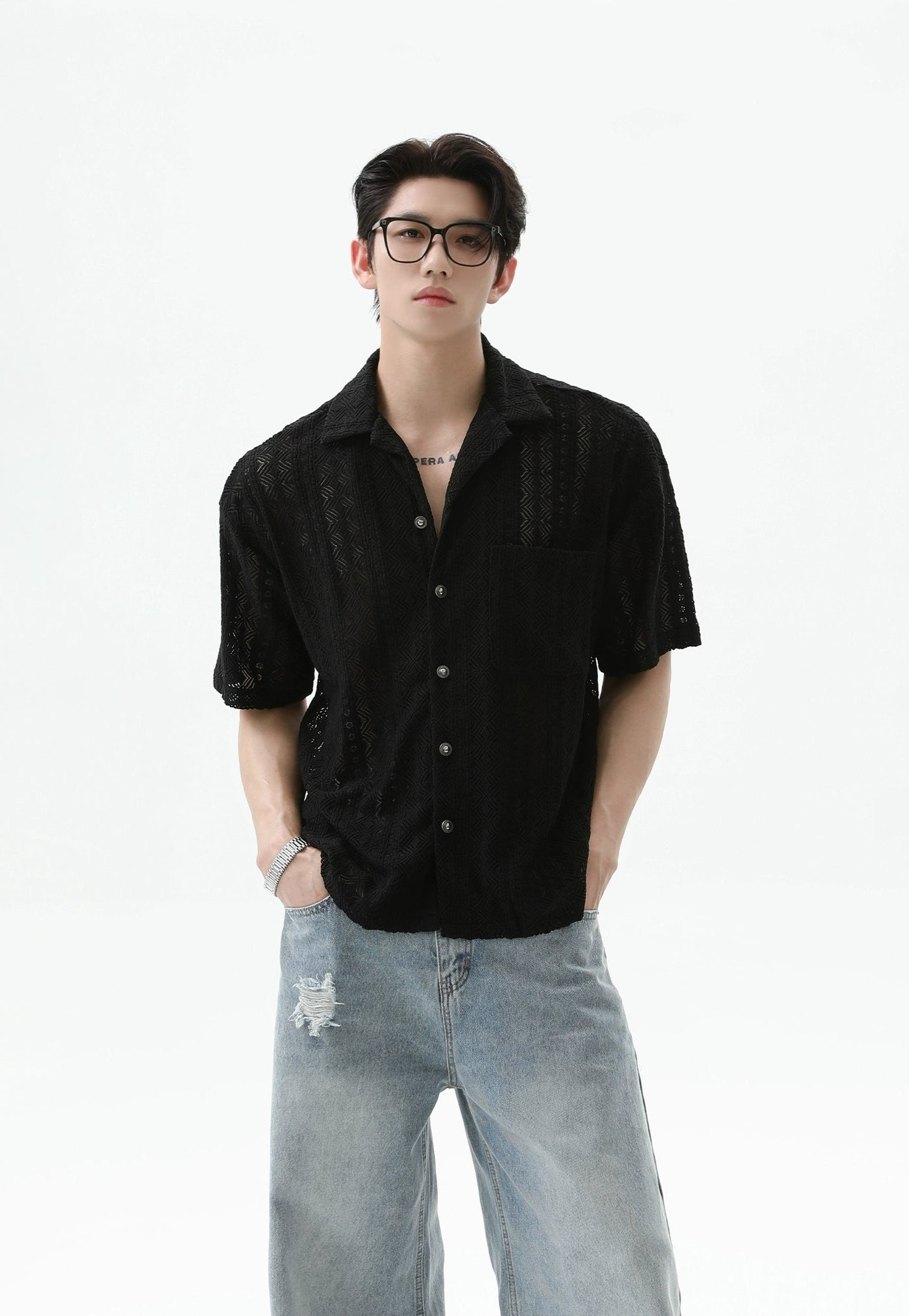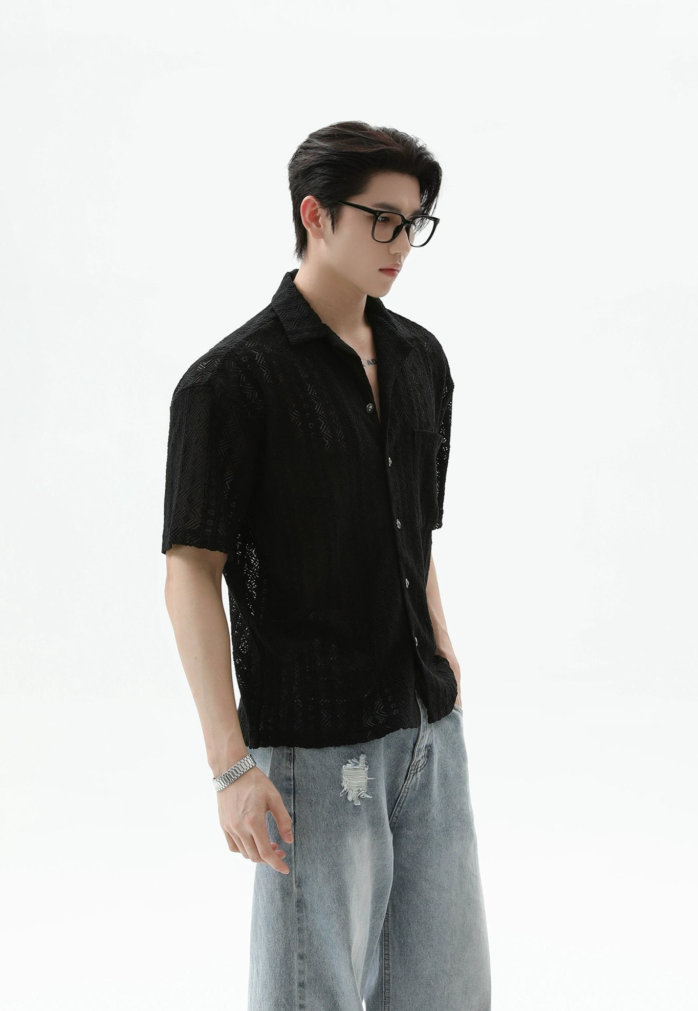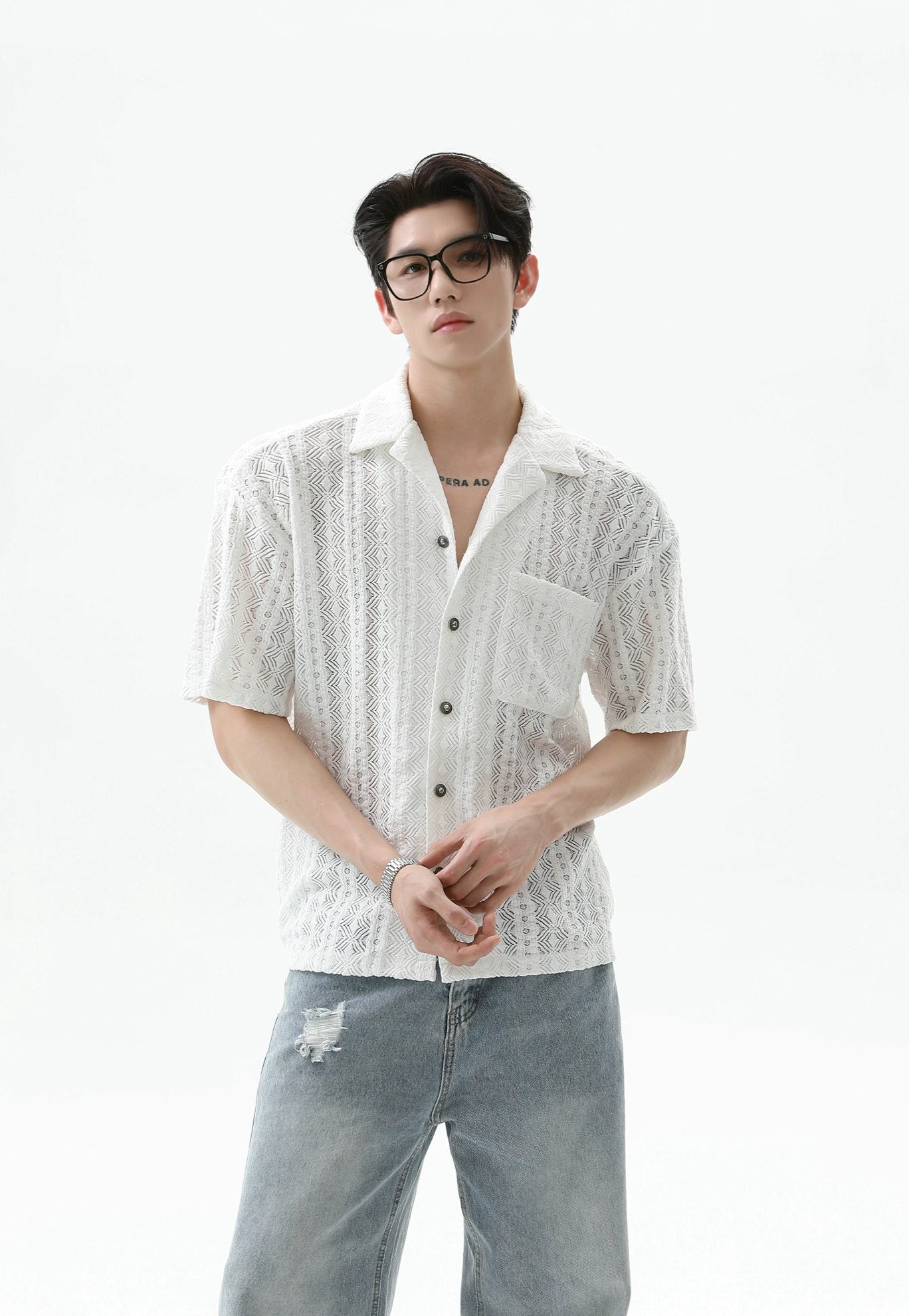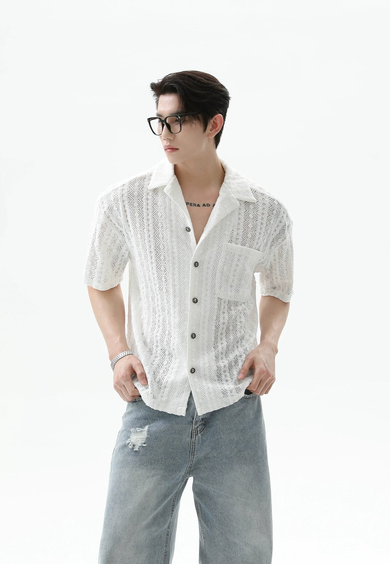 It’s laid-back but intentional, giving you texture, structure, and subtle transparency in all the right ways. Made with a light and breathable lace fabric, the open diamond pattern adds dimension while keeping the shirt easy to wear. The short sleeves, button-up front, and soft drape make it ideal for layering or wearing on its own.