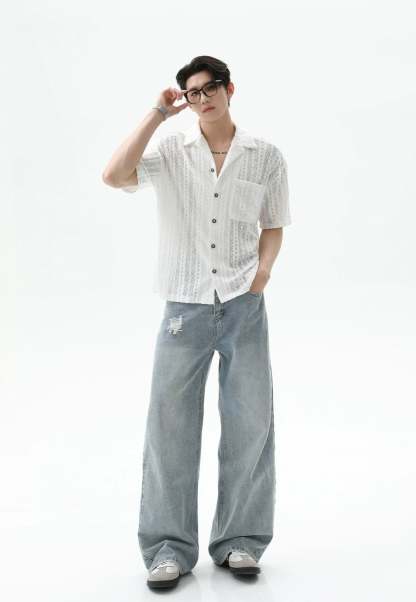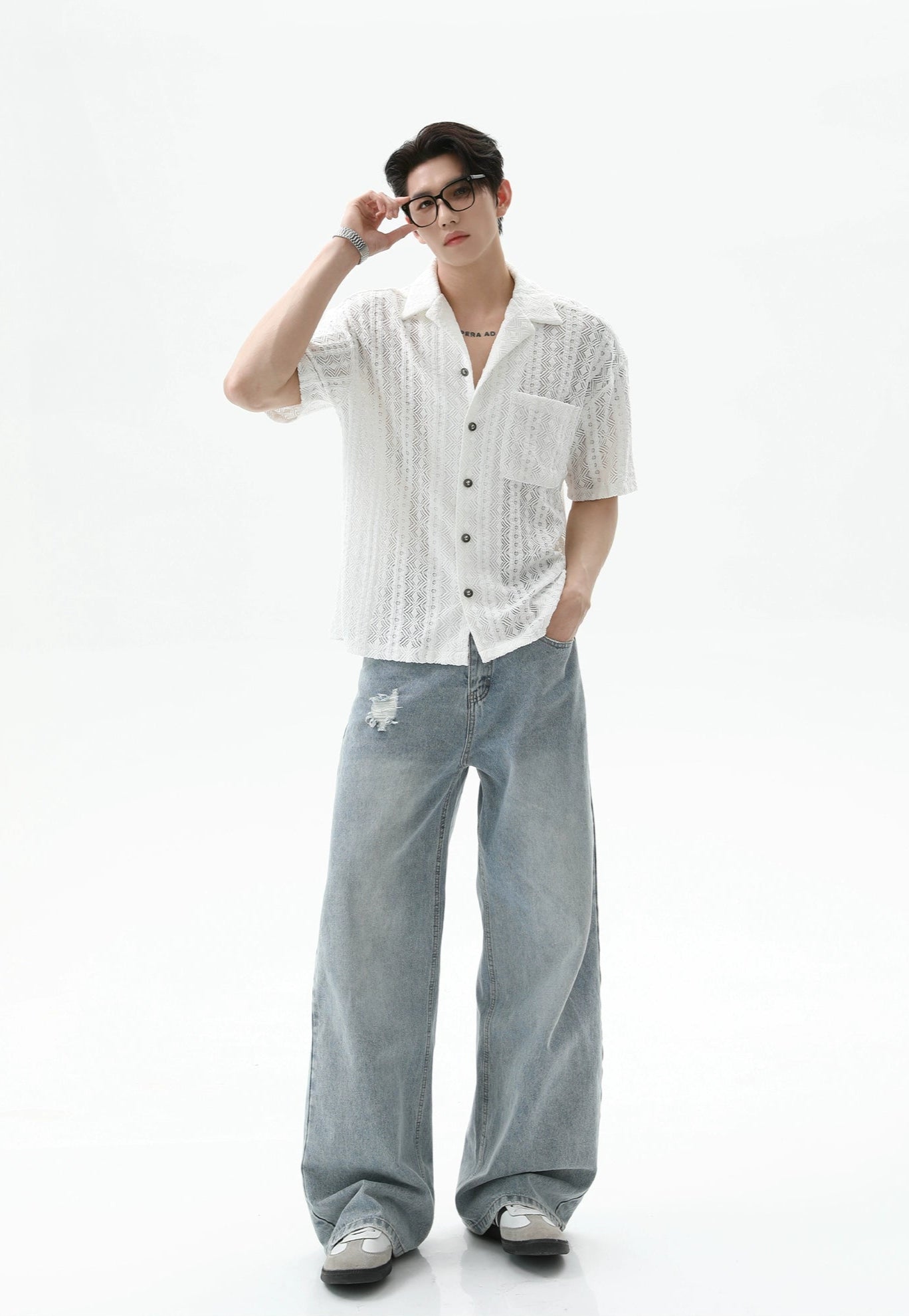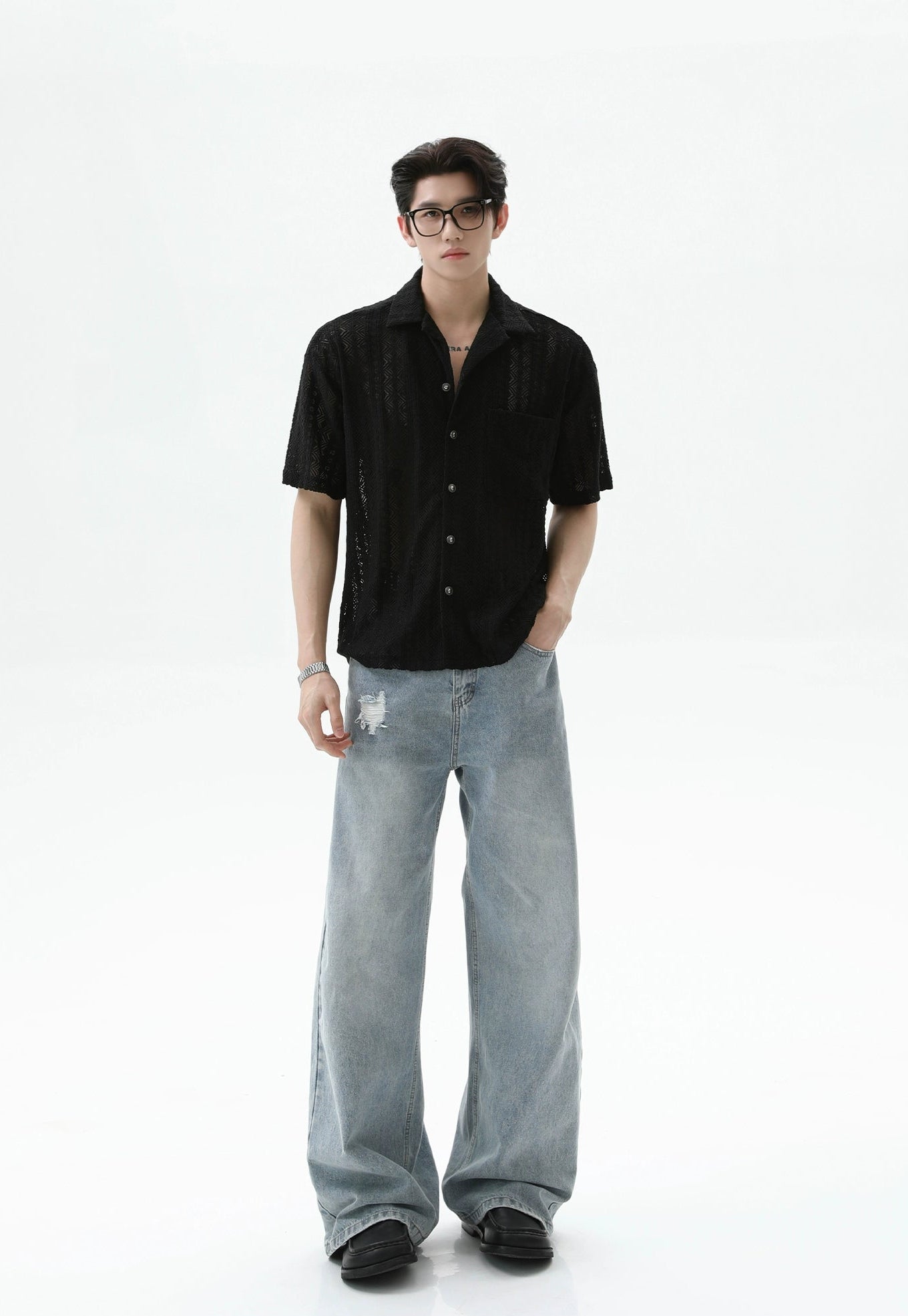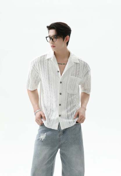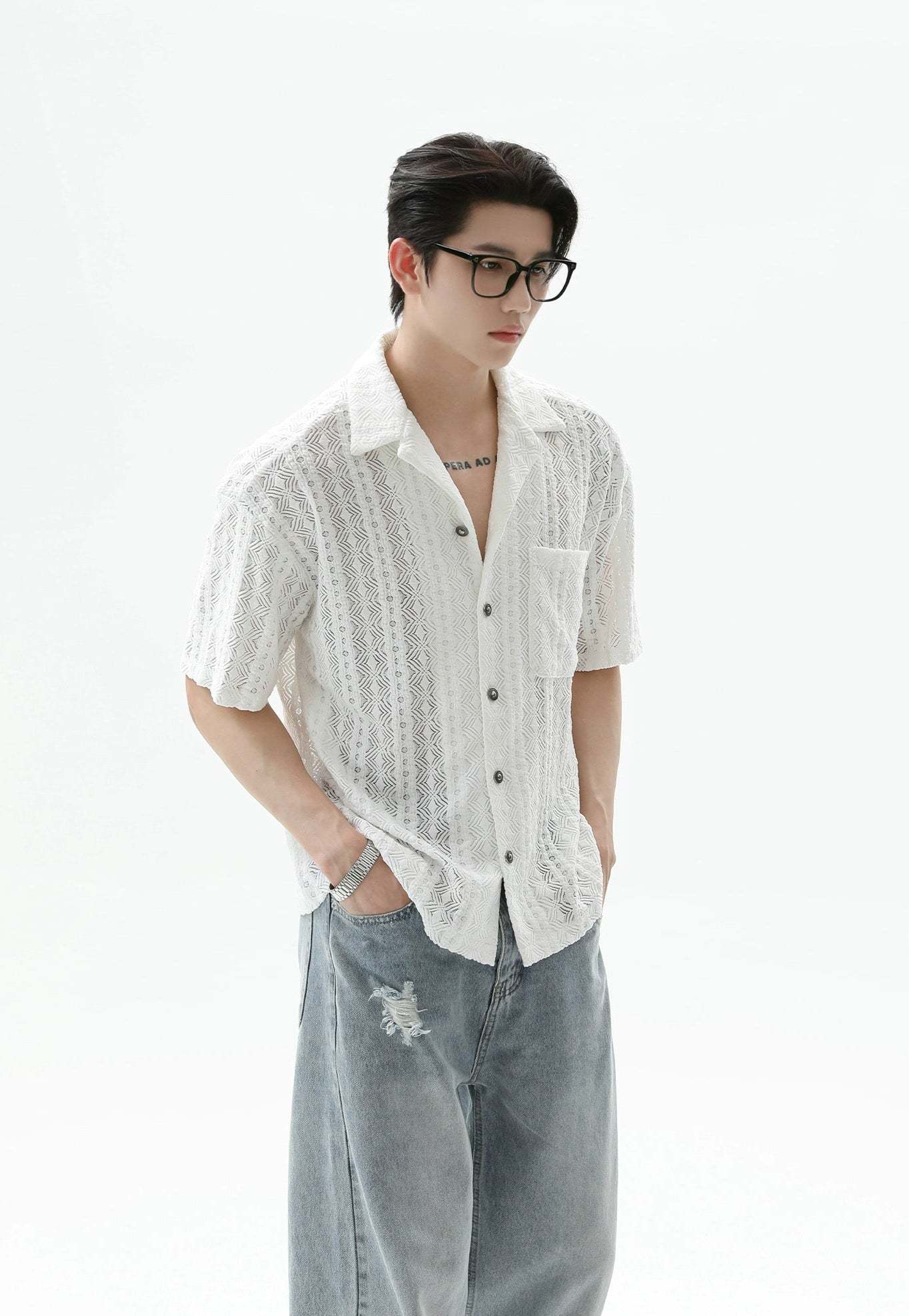 It’s laid-back but intentional, giving you texture, structure, and subtle transparency in all the right ways. Made with a light and breathable lace fabric, the open diamond pattern adds dimension while keeping the shirt easy to wear. The short sleeves, button-up front, and soft drape make it ideal for layering or wearing on its own.