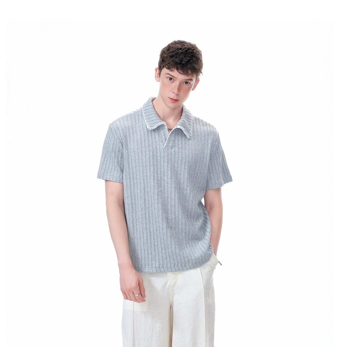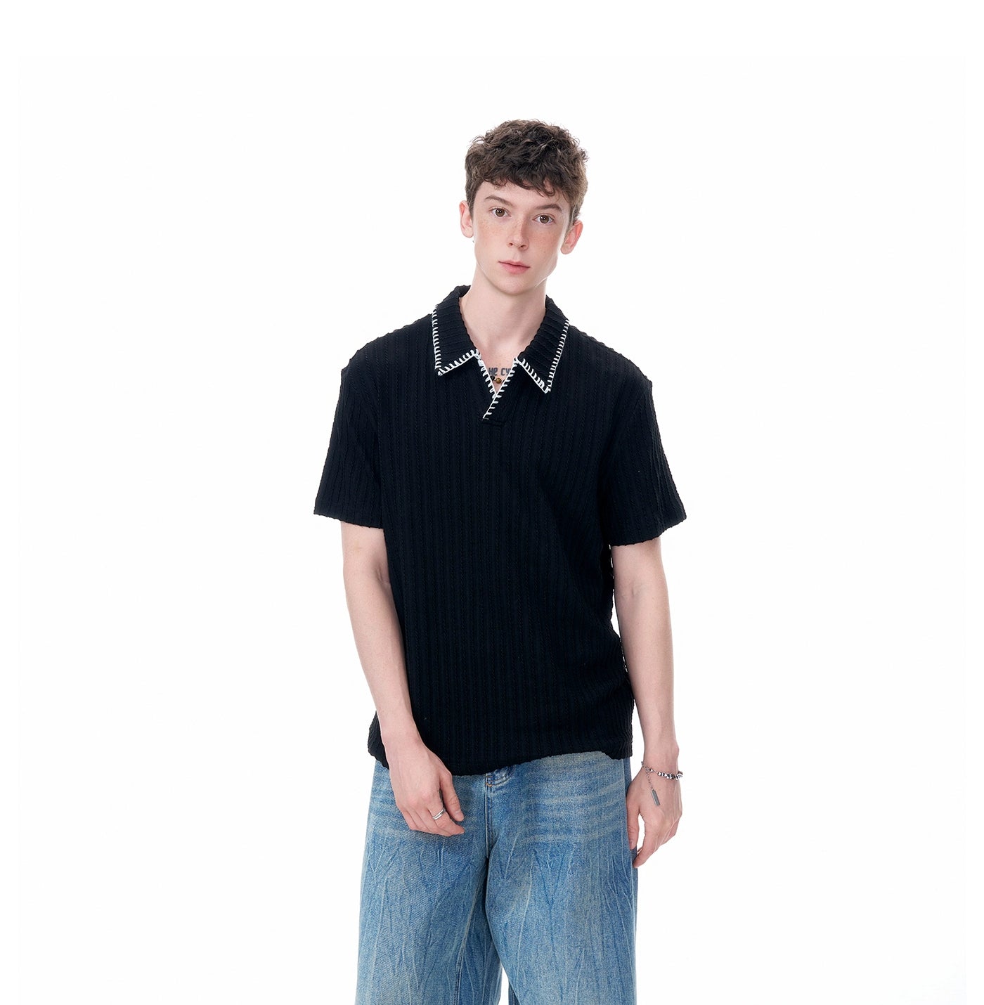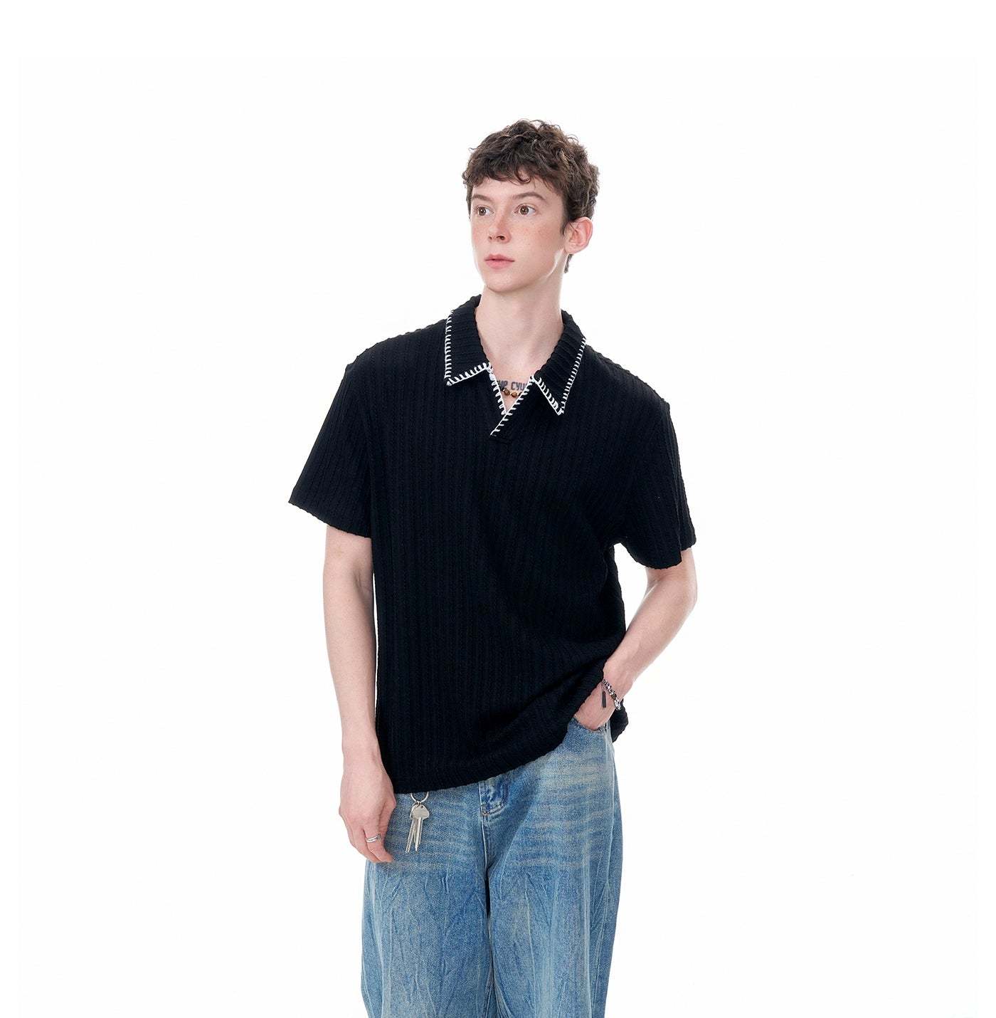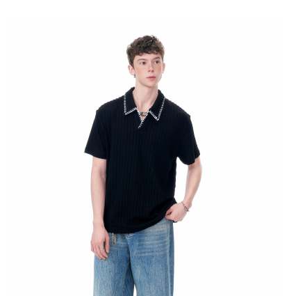 The Cable Knit Short Sleeve Polo Shirt with Contrast Trim Collar delivers texture and visual edge with a laid-back attitude.