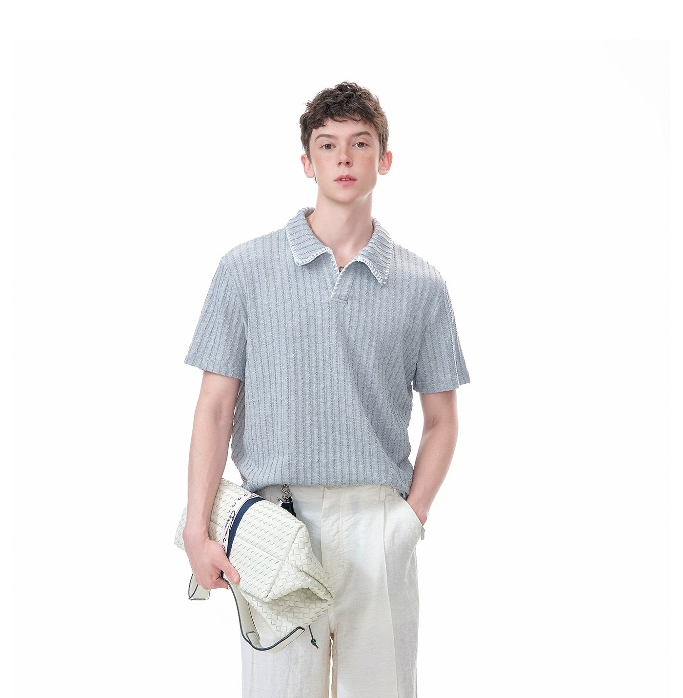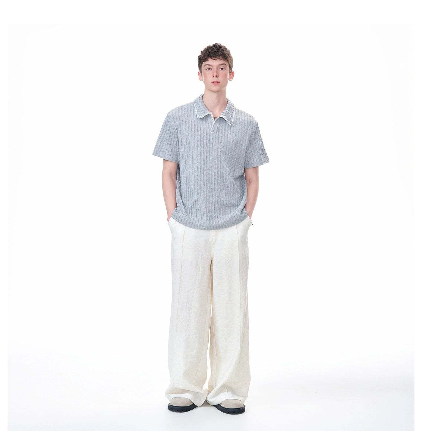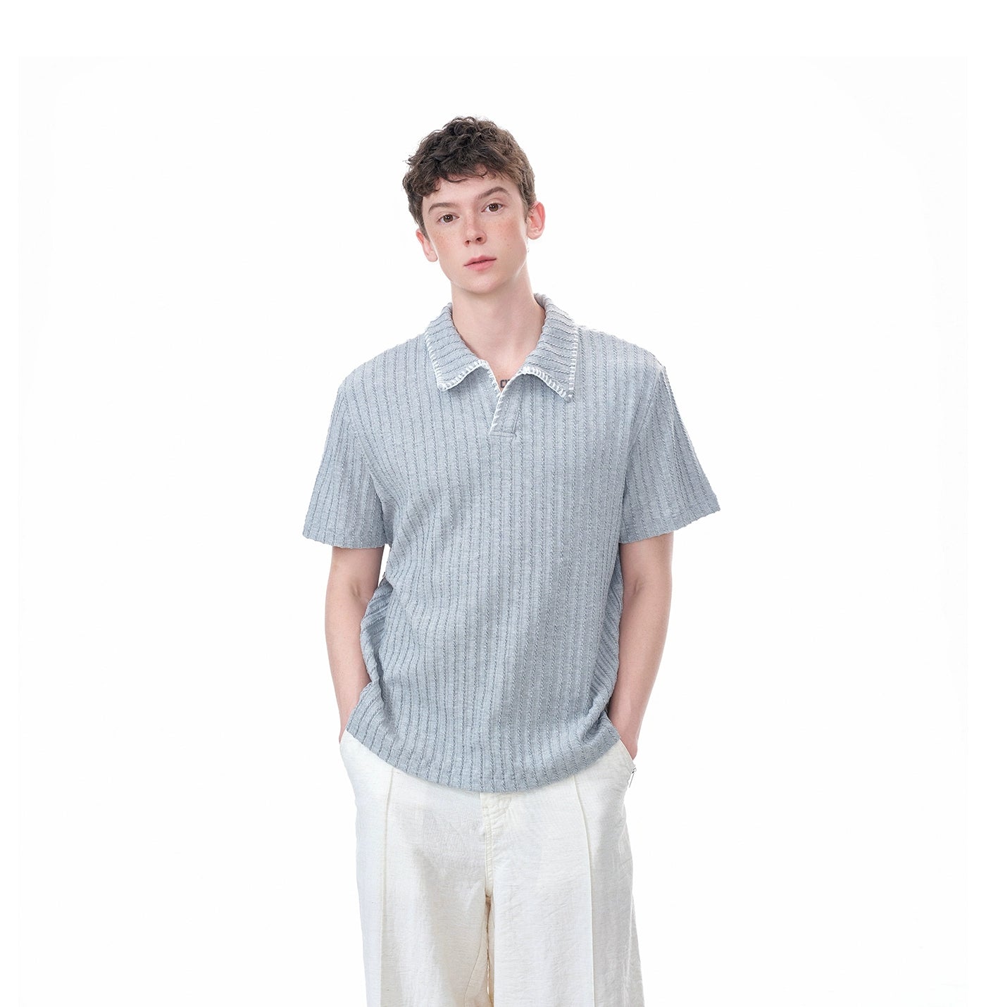 The Cable Knit Short Sleeve Polo Shirt with Contrast Trim Collar delivers texture and visual edge with a laid-back attitude.