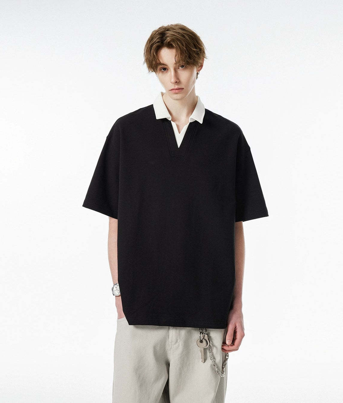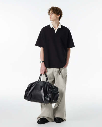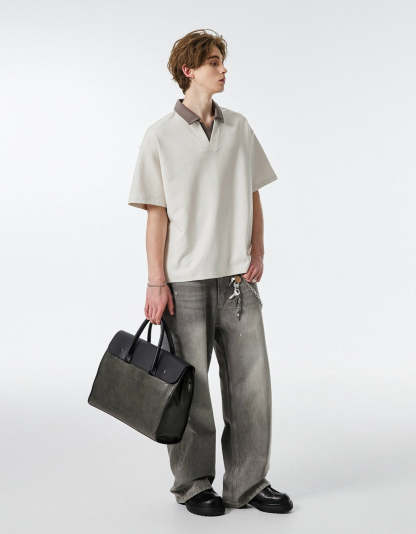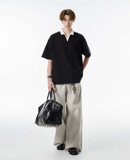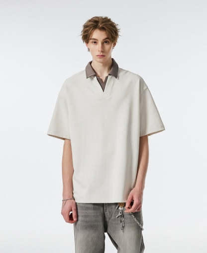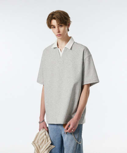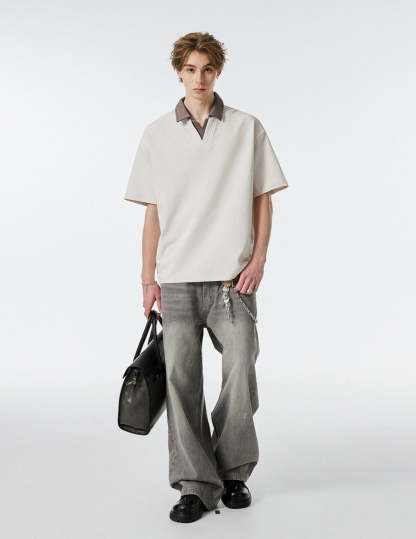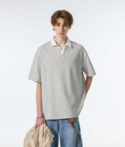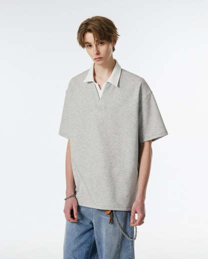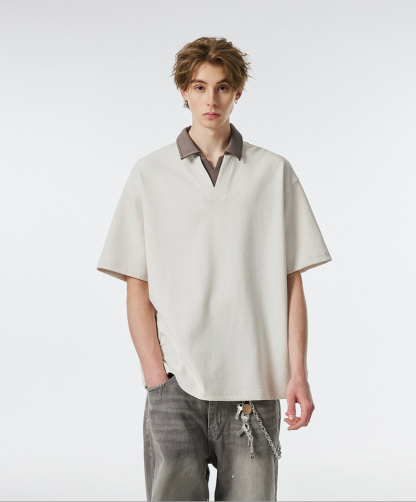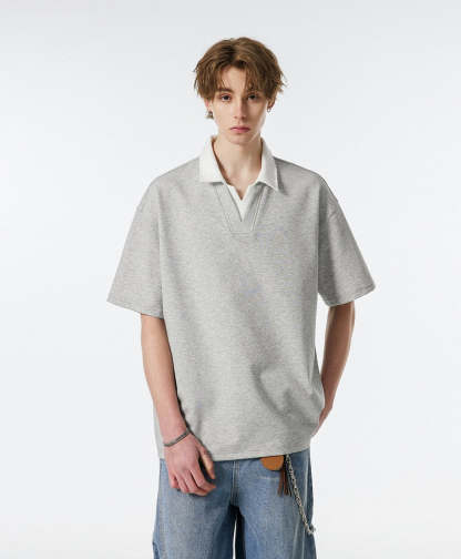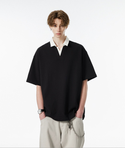Product specifications: Material: 56% cotton, 37.9% polyester, 6.1% spandex Fit: Relaxed Collar: V-neck with contrast lapel Texture: Soft, medium-weight knit Sleeve Length: Short Pattern: Solid color Care Instructions: Machine wash cold, tumble dry low or hang dry