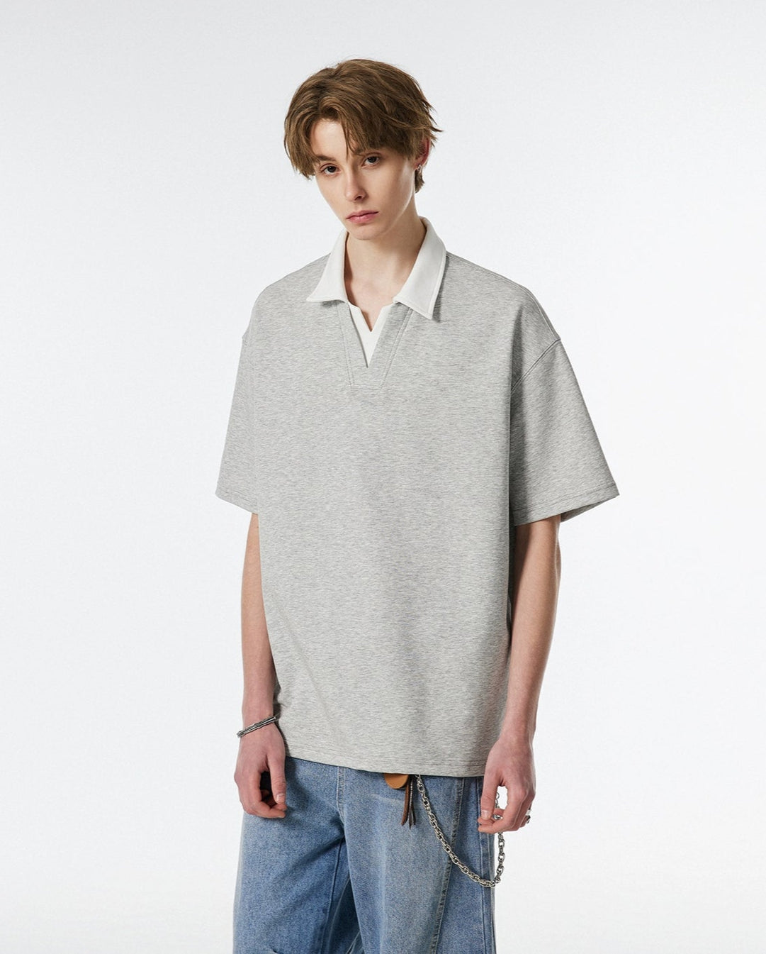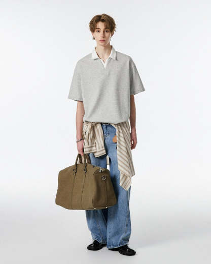 Its laid-back shape delivers comfort without losing structure, making it easy to wear without feeling overdone. Crafted from a soft and durable cotton-blend knit, it combines breathable comfort with a slightly structured weight to keep its form. The wide lapel-inspired collar and V-neck opening give it a layered look without the extra bulk—designed to nod at preppy elements while keeping things modern and unfussy. Style it loose over straight-leg trousers or tuck it into jeans with minimal effort.