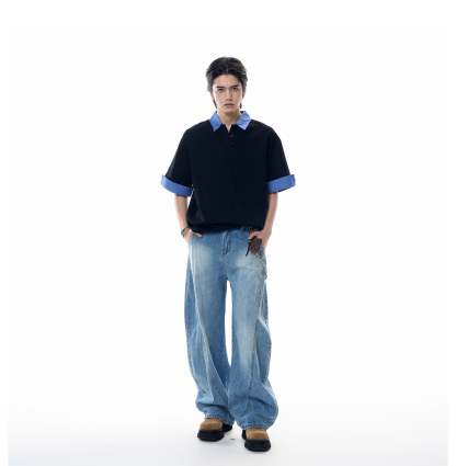 Product specifications: Material: 53% cotton, 47% polyester Fit: Relaxed/loose fit Collar: Lapel with contrast plaid detail Closure: Three-button placket Thickness: Lightweight Care instructions: Machine wash cold, tumble dry low