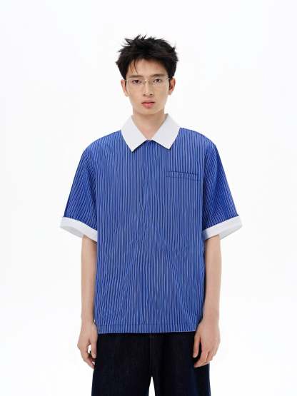 The Contrast Trim Stripe Short Sleeve Shirt stands out with its bold striped texture and clean white accents on the collar and sleeves, offering a sharp take on laid-back menswear.