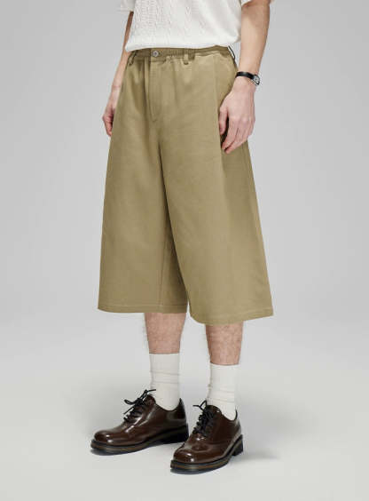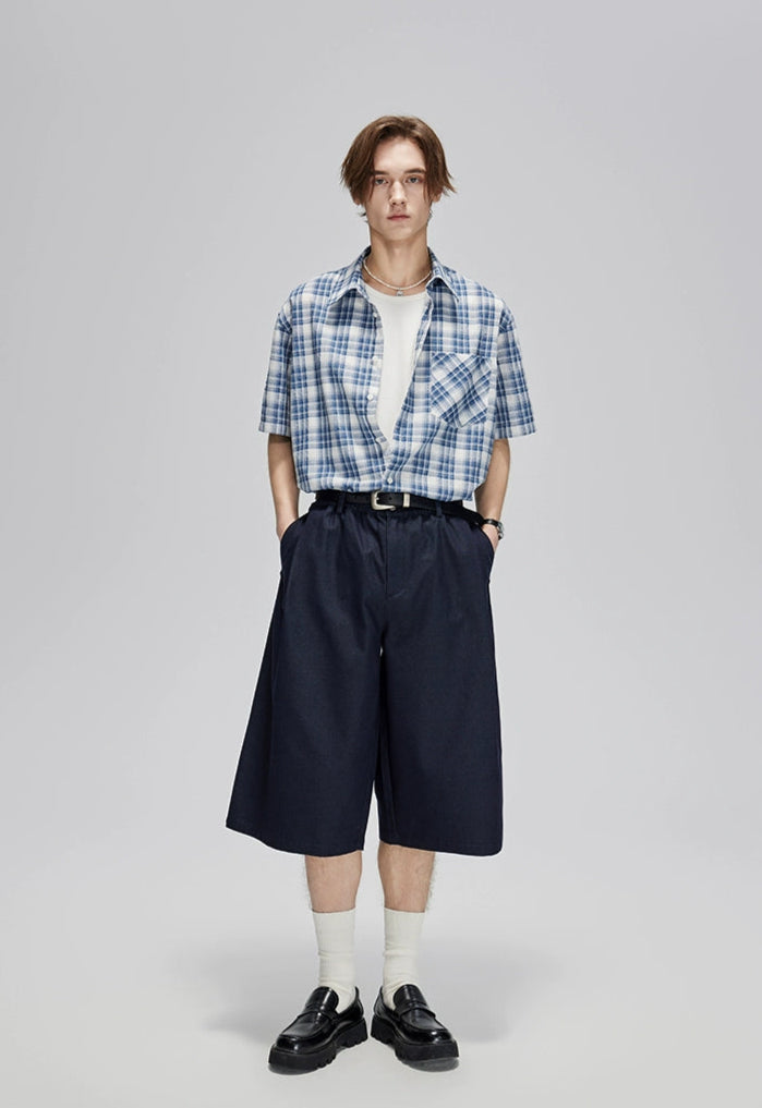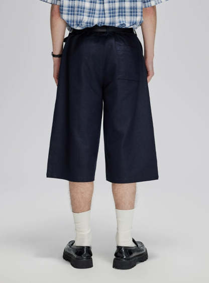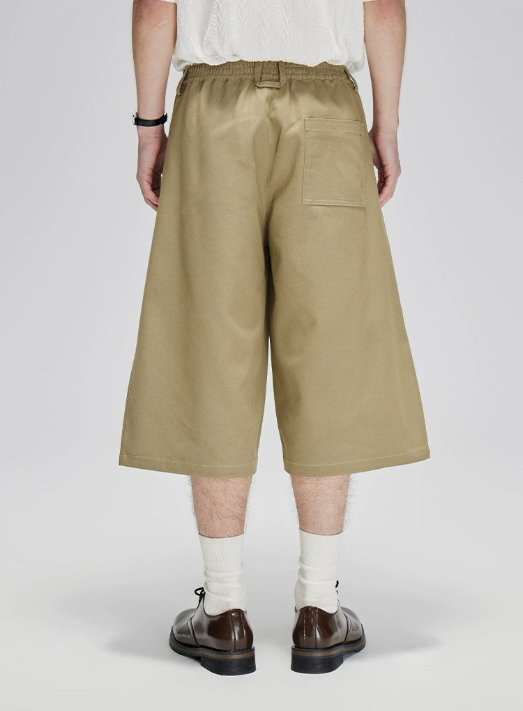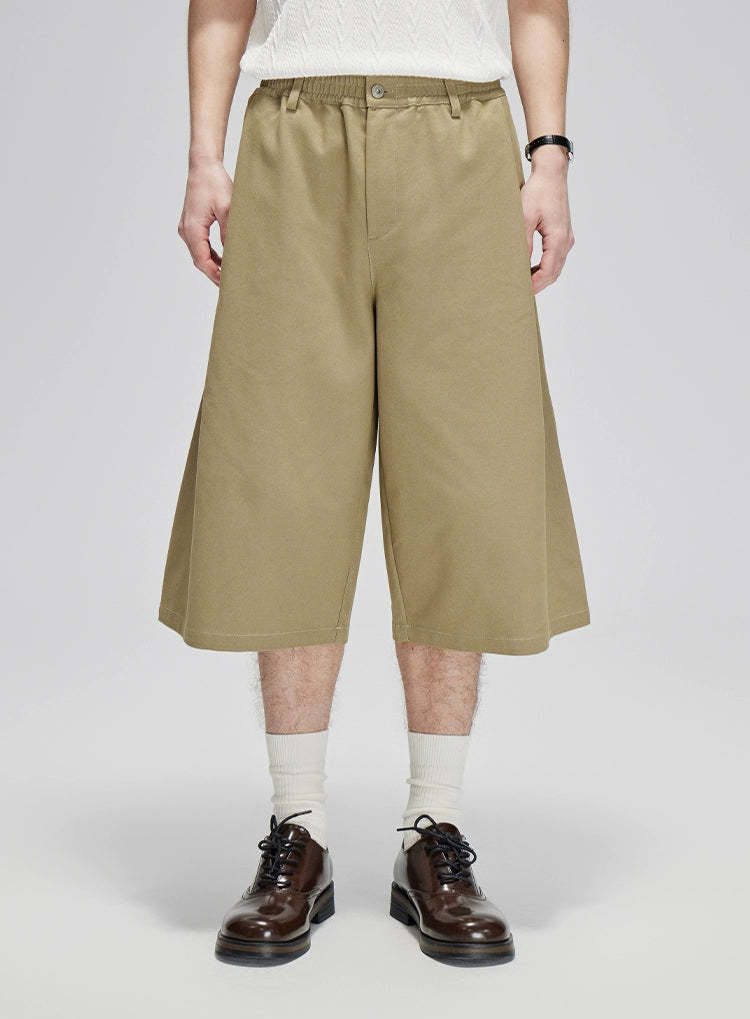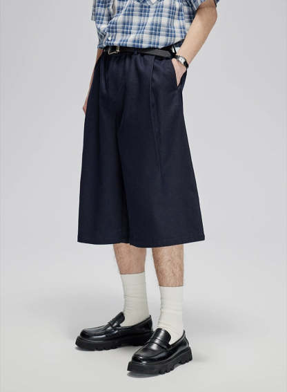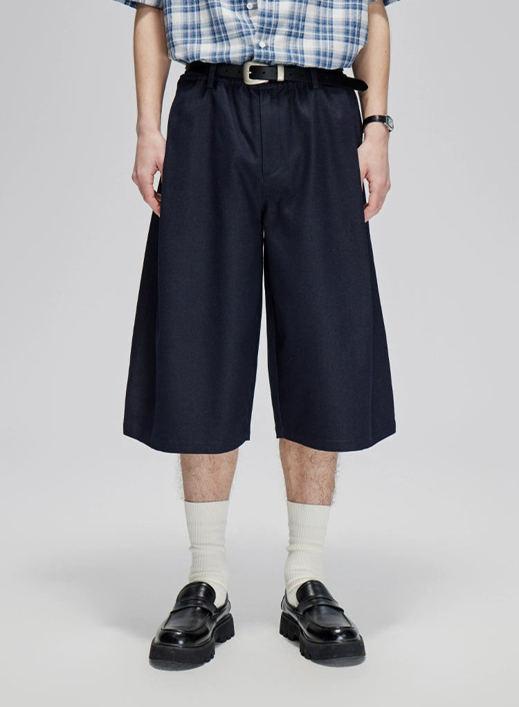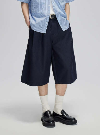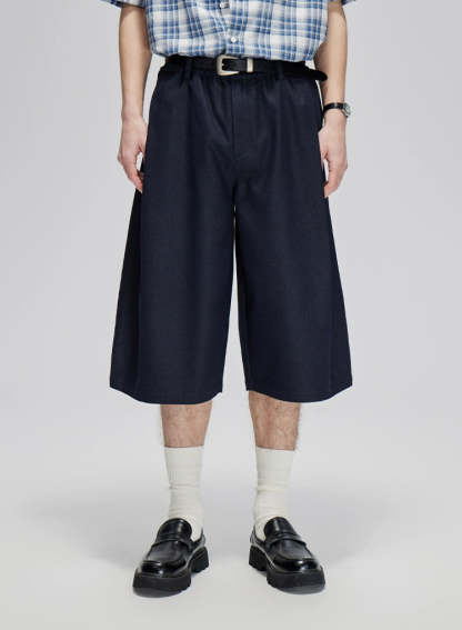 Crafted from a customized imitation denim fabric that feels soft, drapes well, and has a clean matte texture, these shorts feature a wide-leg straight cut with deep-set pleats that add movement without feeling oversized. The elastic waistband keeps the fit comfortable without sacrificing structure, and the solid color makes them easy to pair with everything from boxy tees to crisp button-ups.