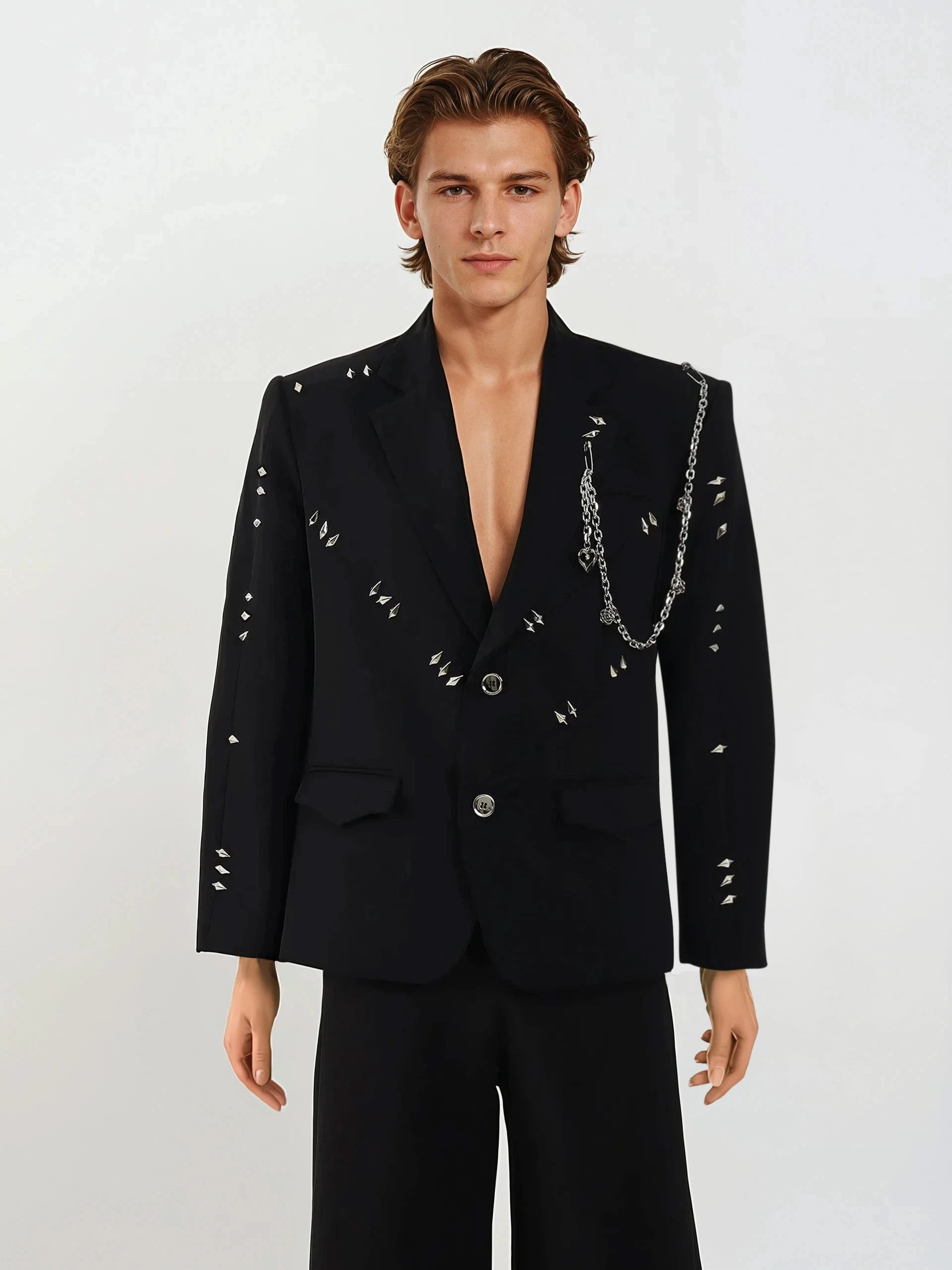 A sharp statement piece with real edge—this embellished blazer stands out with metallic stud details and a removable chain accent that brings just the right amount of attitude.