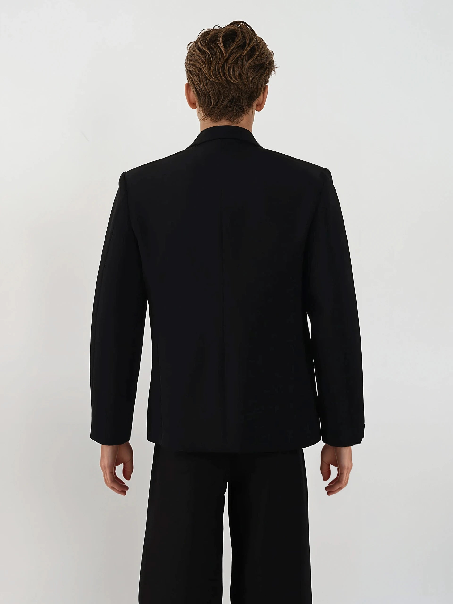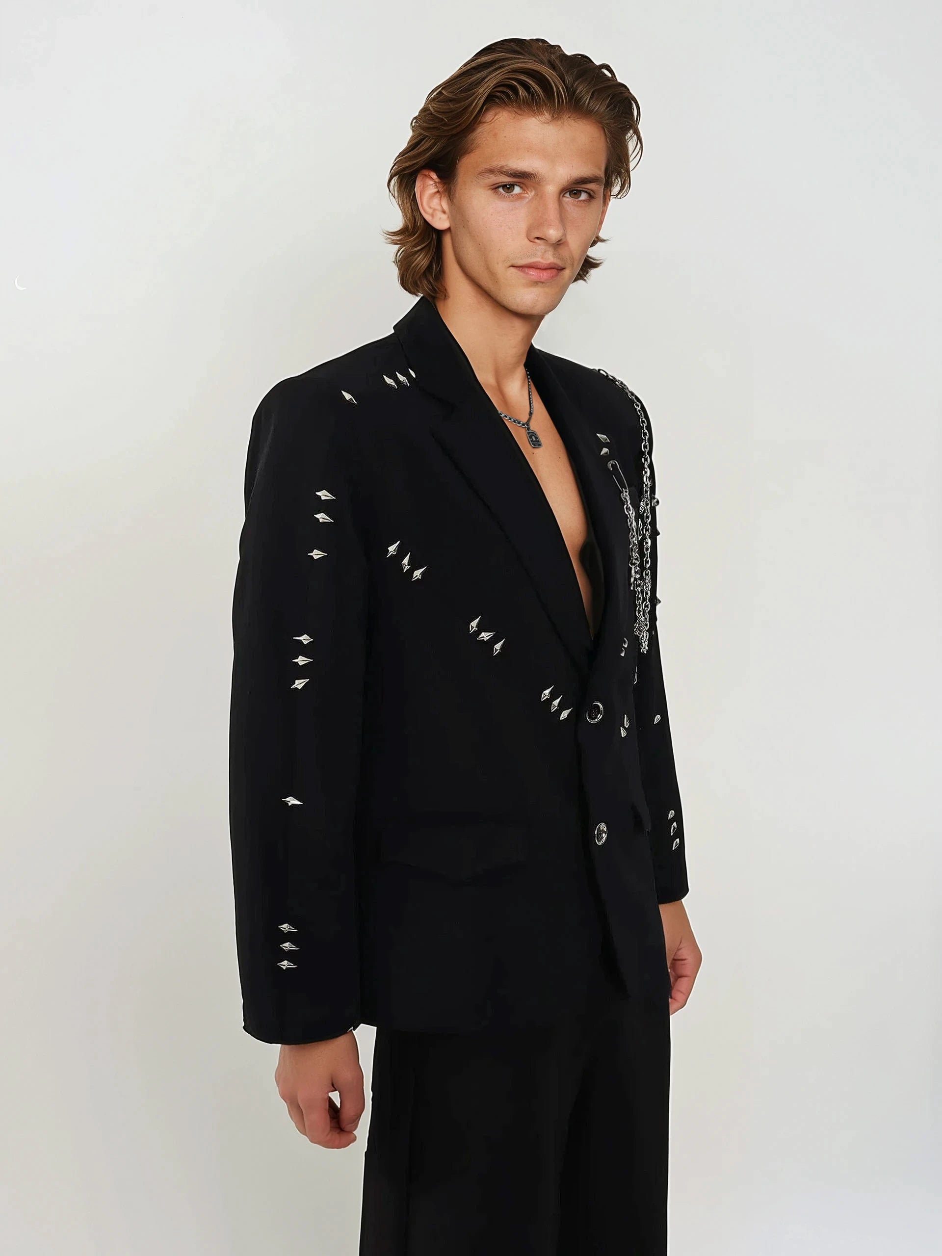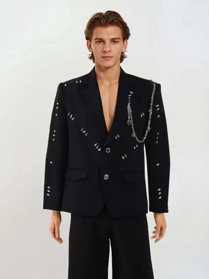 Whether styled up or dressed down, it adds dimension without trying too hard. Crafted from a smooth suiting fabric, the blazer is tailored with defined shoulders, structured lines, and an overall clean silhouette. The minimalist black base contrasts with carefully placed studs for visual impact, while the inner is fully lined for comfort and shape retention. This is a go-to layer for nightlife, creative workspaces, or anytime you want to elevate your outfit without losing your cool.