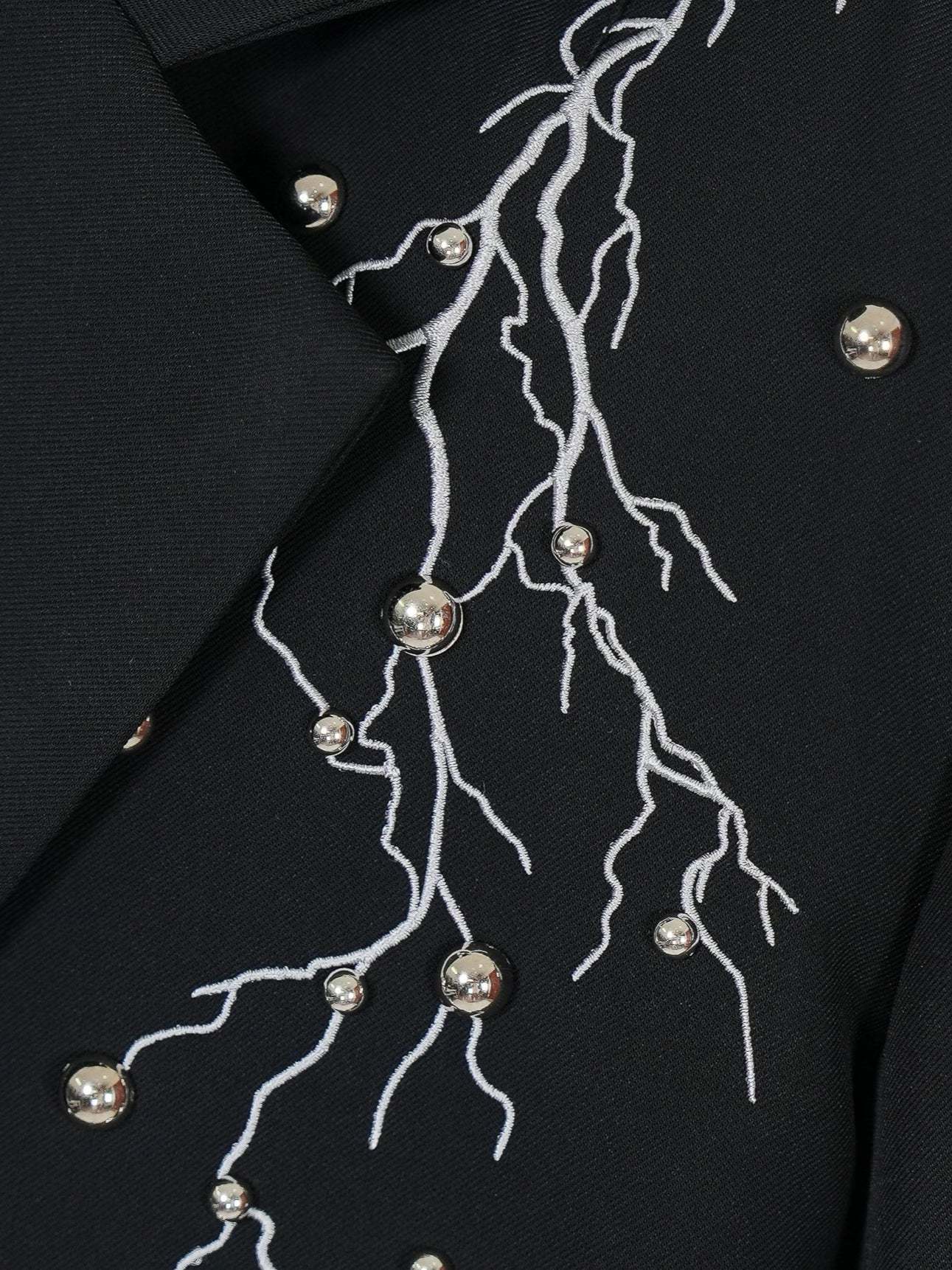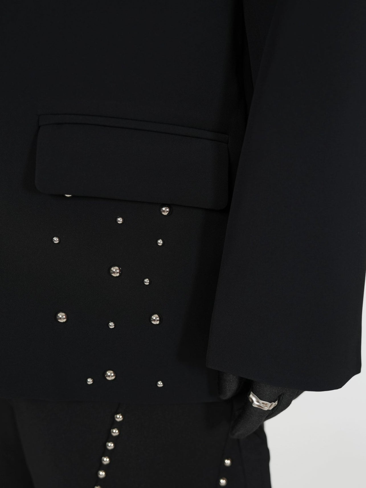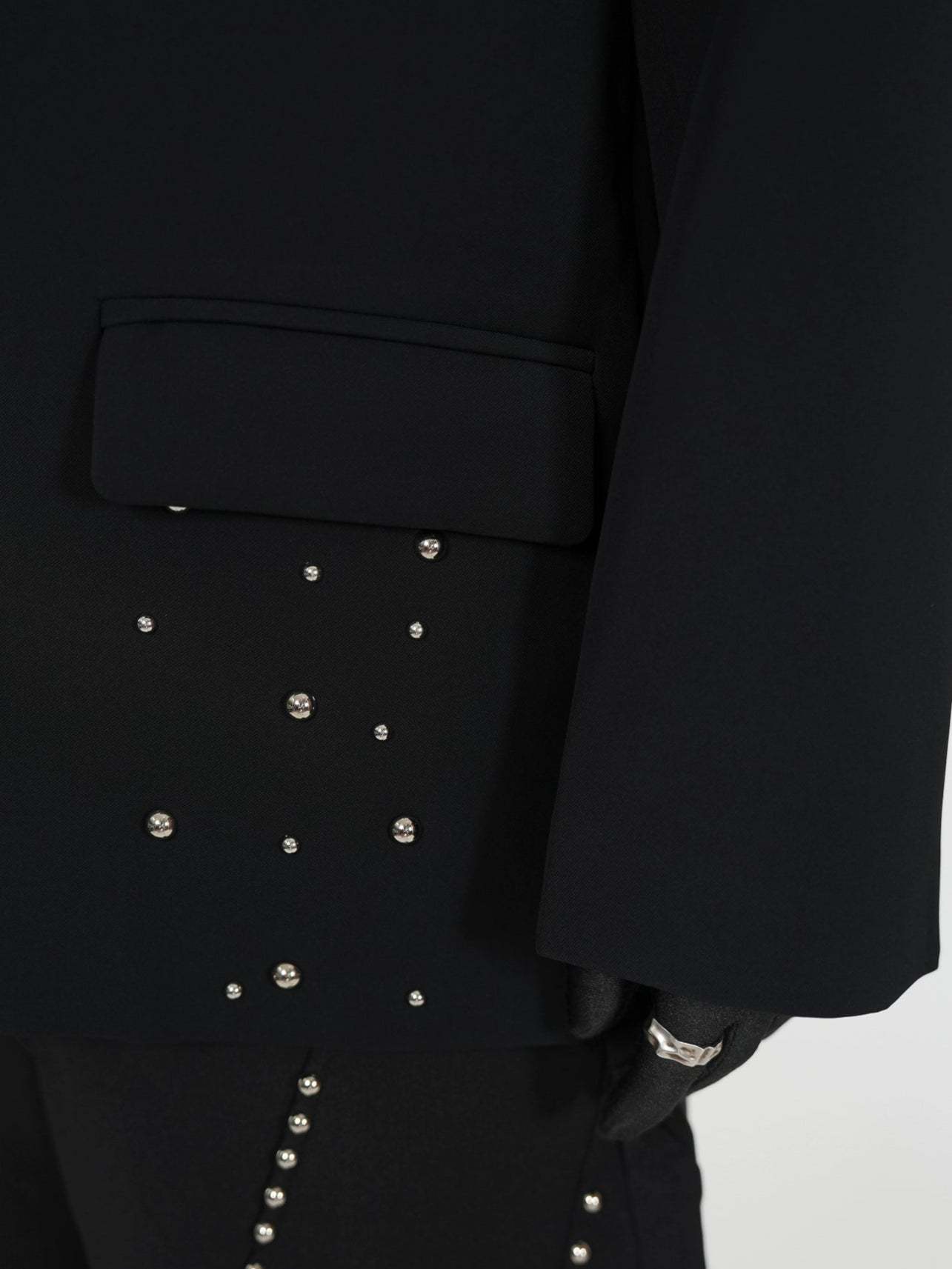 Crafted from smooth 100% polyester, the structured single-breasted blazer is designed with padded shoulders and metal embellishments across the lapels and cuffs, adding a bold yet polished finish. The wide-leg trousers balance the top with evenly aligned studded accents down the legs, creating a clean and confident silhouette made for impact.