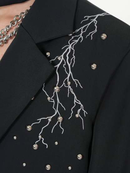 This embellished blazer and wide-leg trouser set stands out with sharp tailoring and studded details that nod to a sleek, rebellious edge.