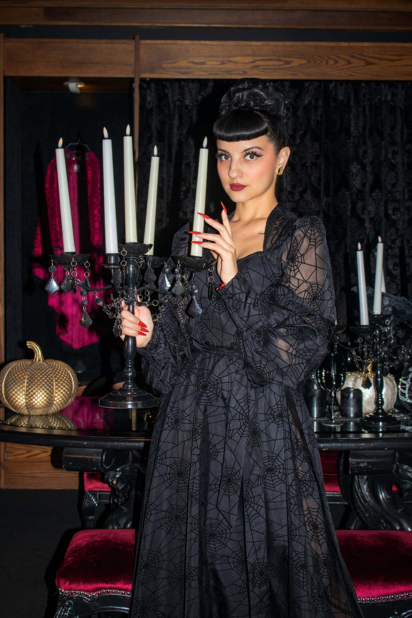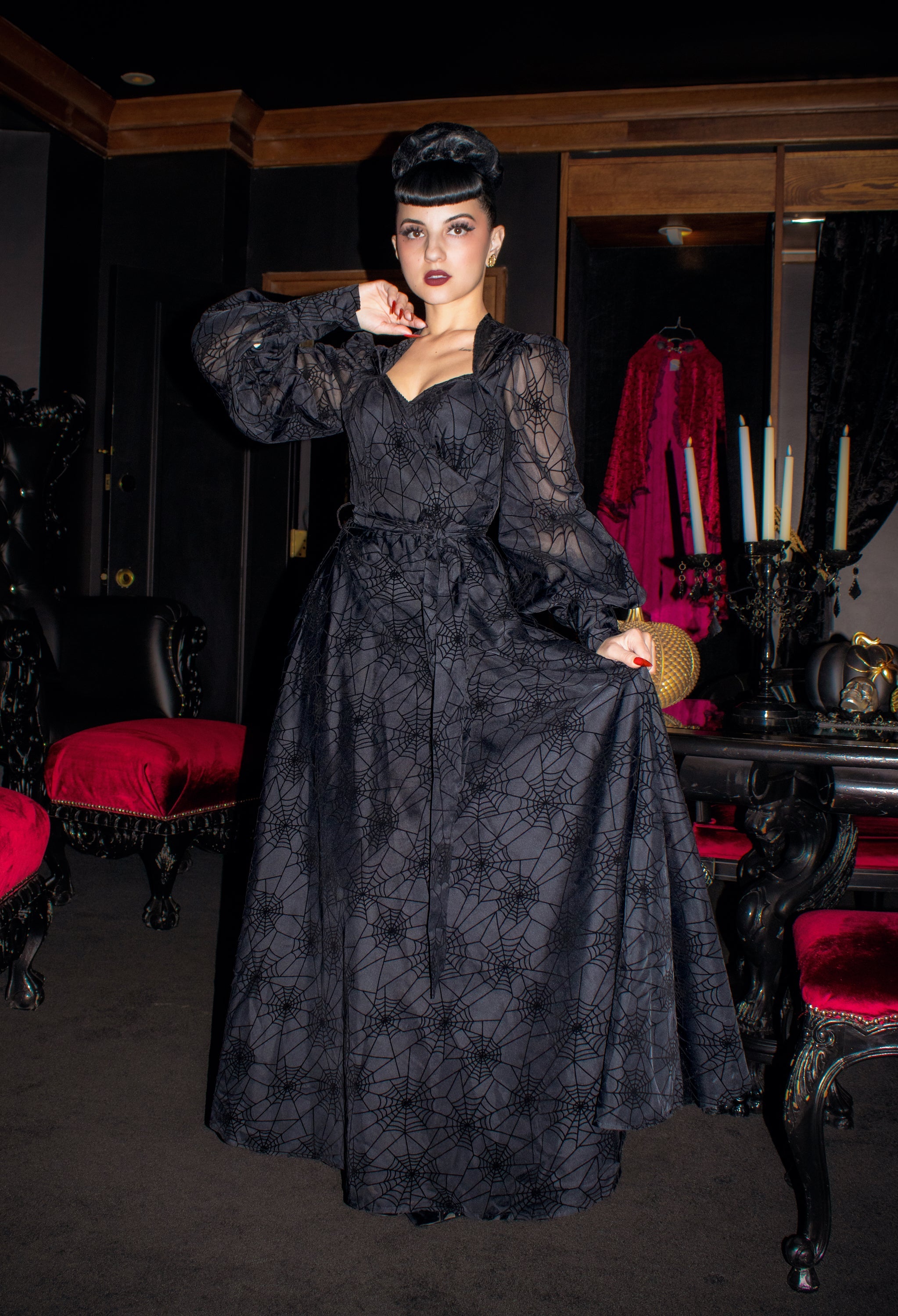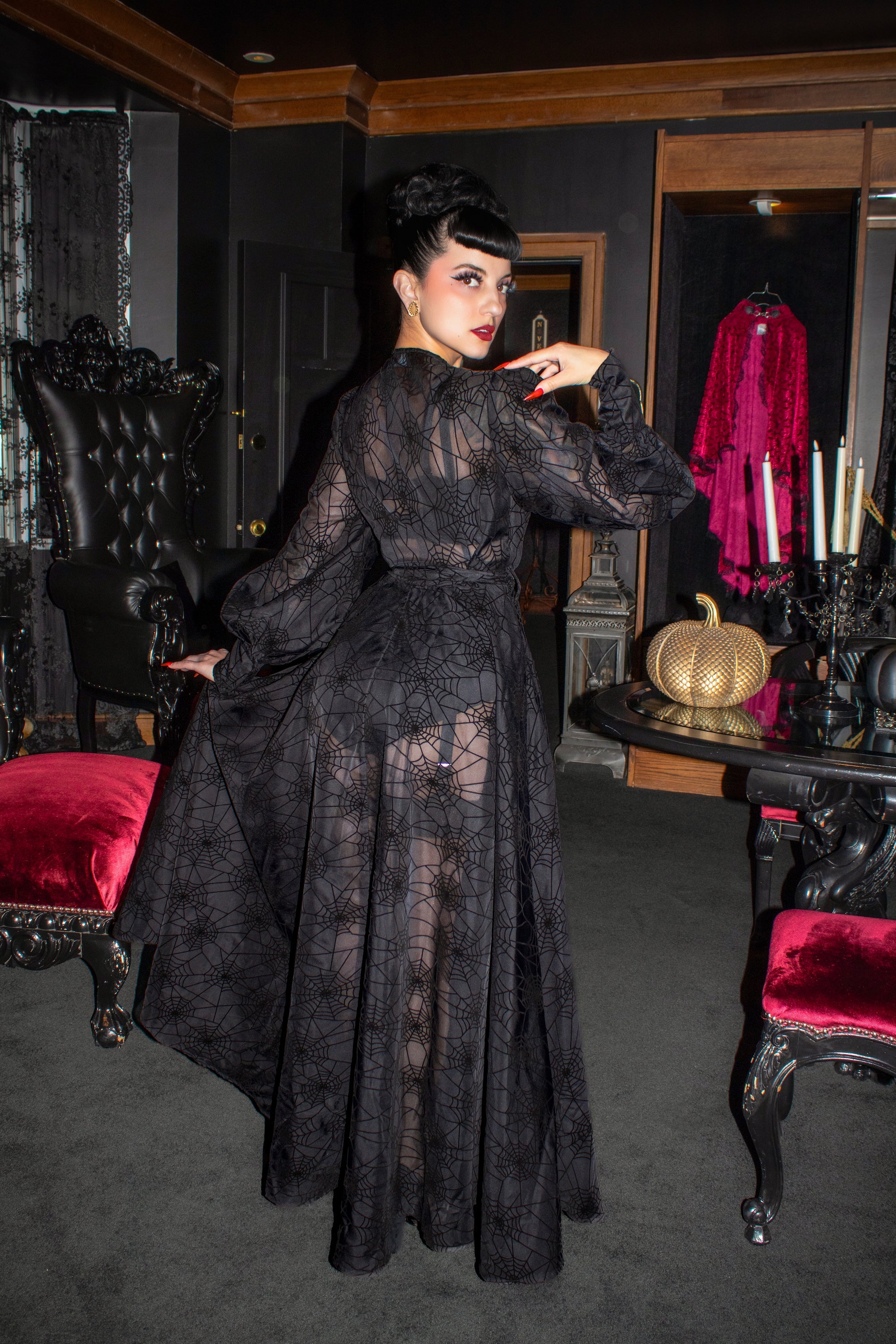 For the Glamour Ghoul Who Always Leaves Them Dying for More…The Fatally Yours Webbed Dress—a bewitching masterpiece dripping in vintage inspired elegance and gothic allure. Crafted from a structured sheer poly chiffon and adorned with black velvet spiderwebs.
