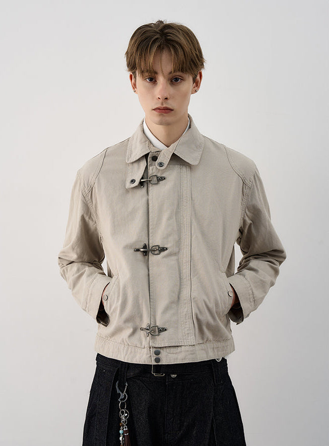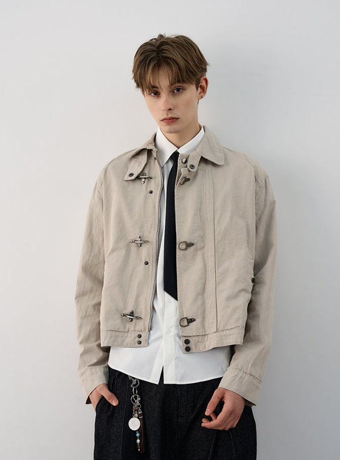 The fireman clasp mid-crop high collar worker jacket combines utility and modern streetwear appeal in a clean, structured design. Its cropped cut and distinctive clasp closure make it a standout outerwear piece that balances functionality with style.