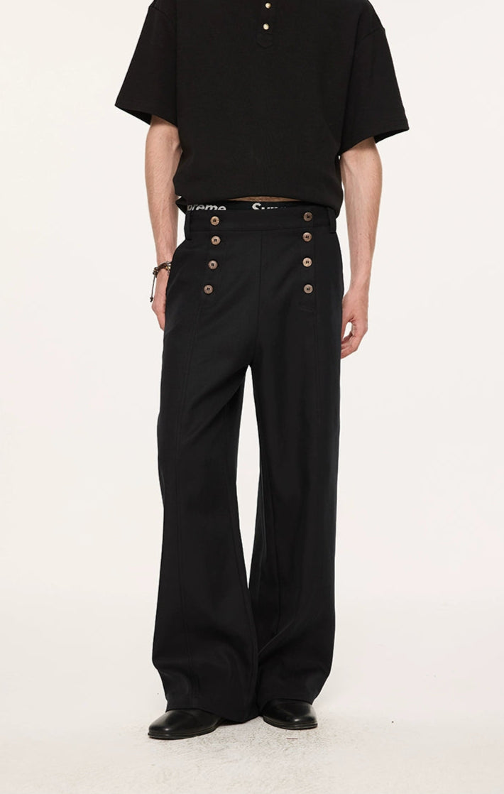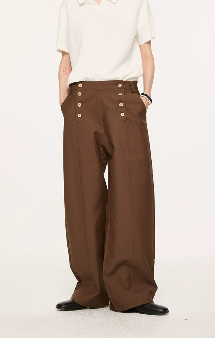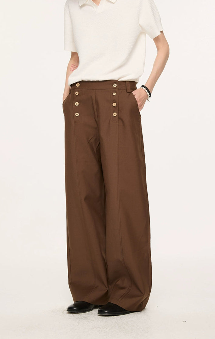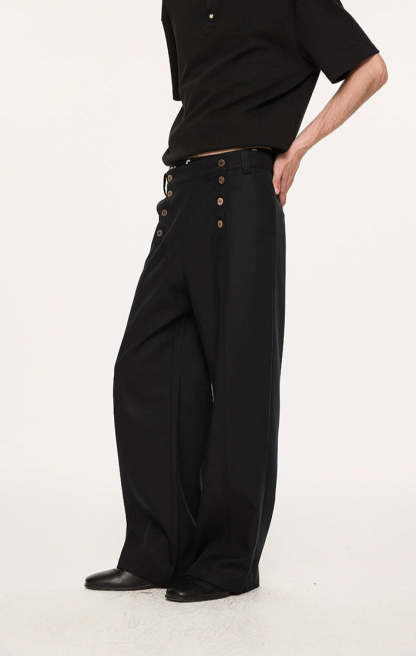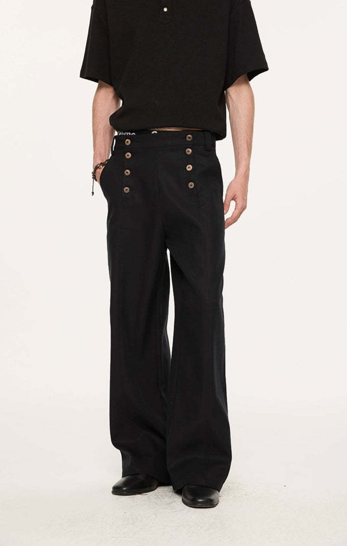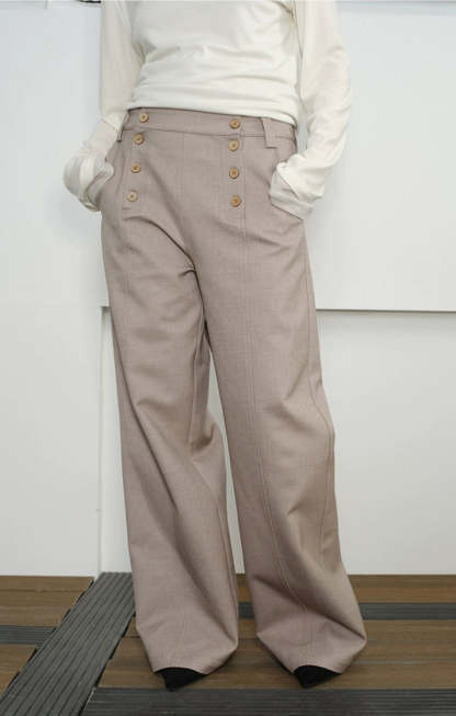 Designed with a double-breasted waistline and wide, straight-leg shape, they deliver a balanced mix of vintage edge and modern ease. Crafted from a premium Lyocell-polyester blend, the fabric has a natural drape with a soft, smooth feel against the skin. A slight texture and body in the material give these trousers a tailored finish without feeling stiff—ideal for day-to-night transitions. The paneled waist and custom woodgrain buttons subtly elevate the overall look, making these a reliable staple with a thoughtful difference.