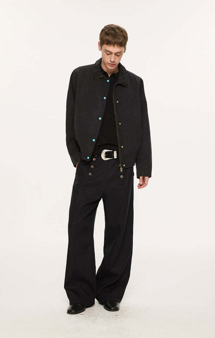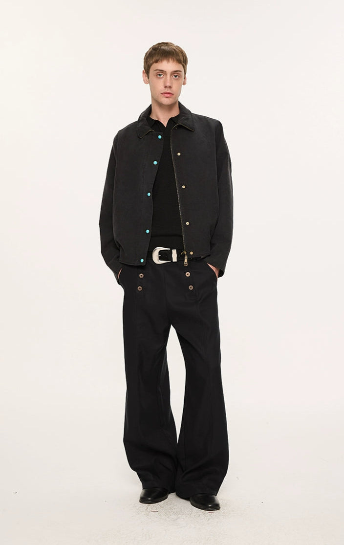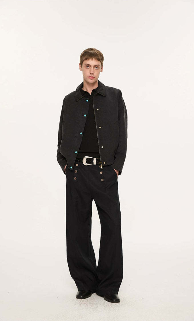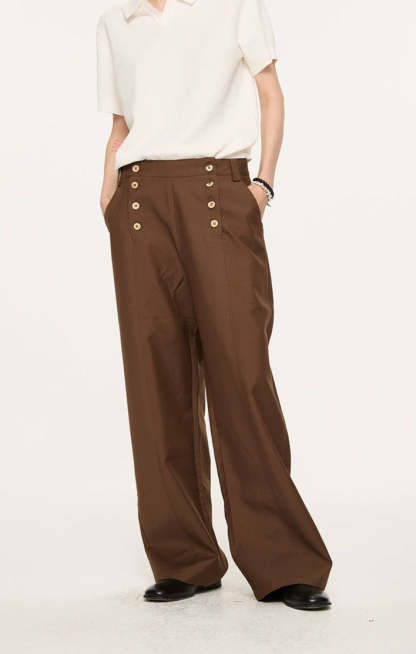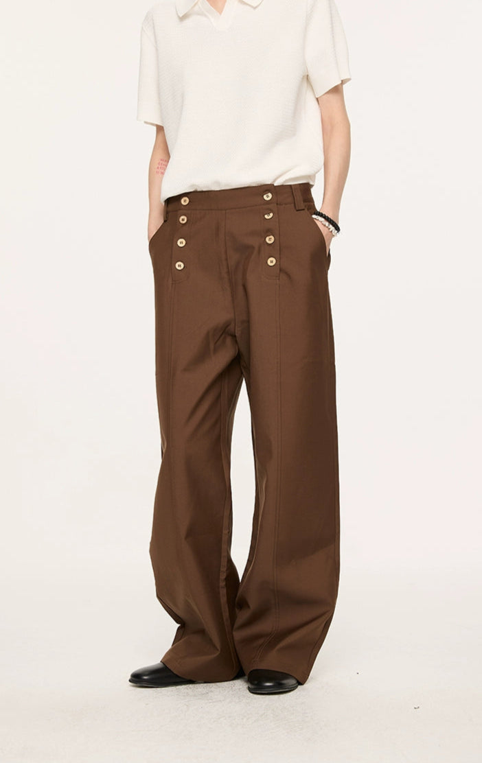 Designed with a double-breasted waistline and wide, straight-leg shape, they deliver a balanced mix of vintage edge and modern ease. Crafted from a premium Lyocell-polyester blend, the fabric has a natural drape with a soft, smooth feel against the skin. A slight texture and body in the material give these trousers a tailored finish without feeling stiff—ideal for day-to-night transitions. The paneled waist and custom woodgrain buttons subtly elevate the overall look, making these a reliable staple with a thoughtful difference.