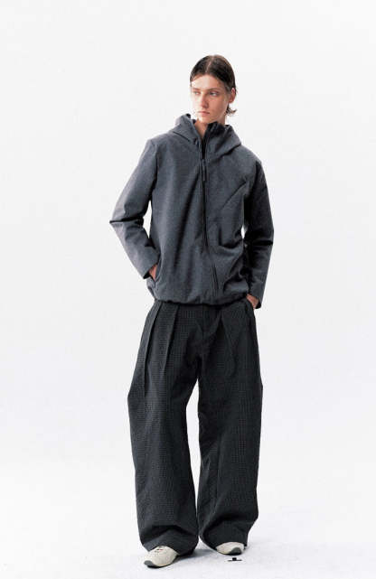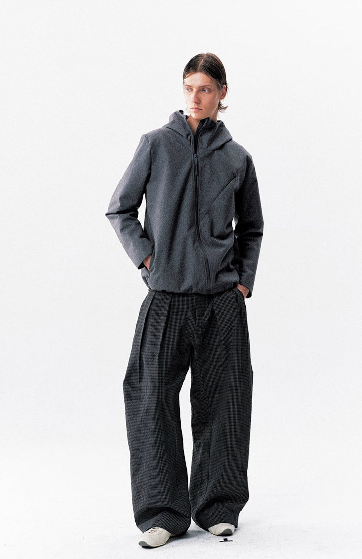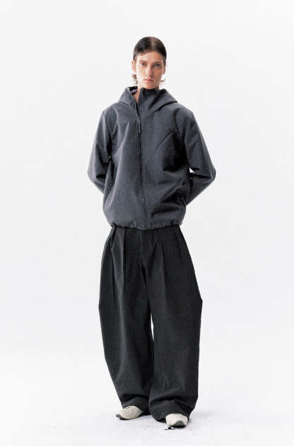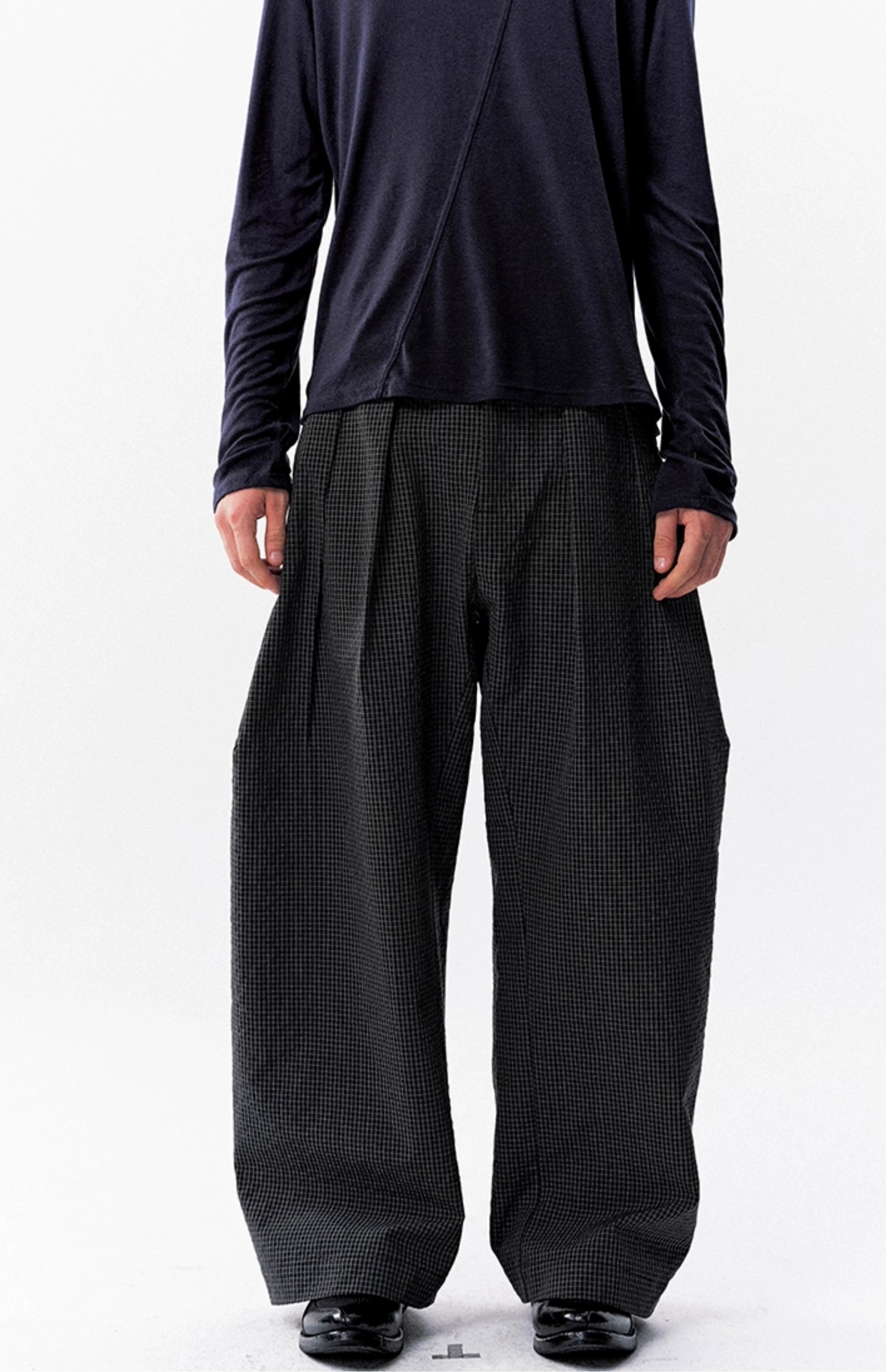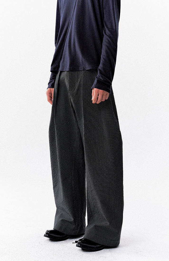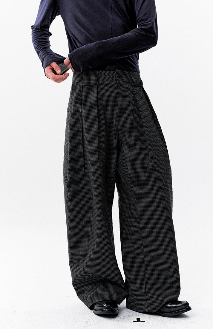 The High-Waist Micro-Check Pattern Wide Leg Pants stand out with a sharp pleated structure and textured micro-check design that adds depth without trying too hard.