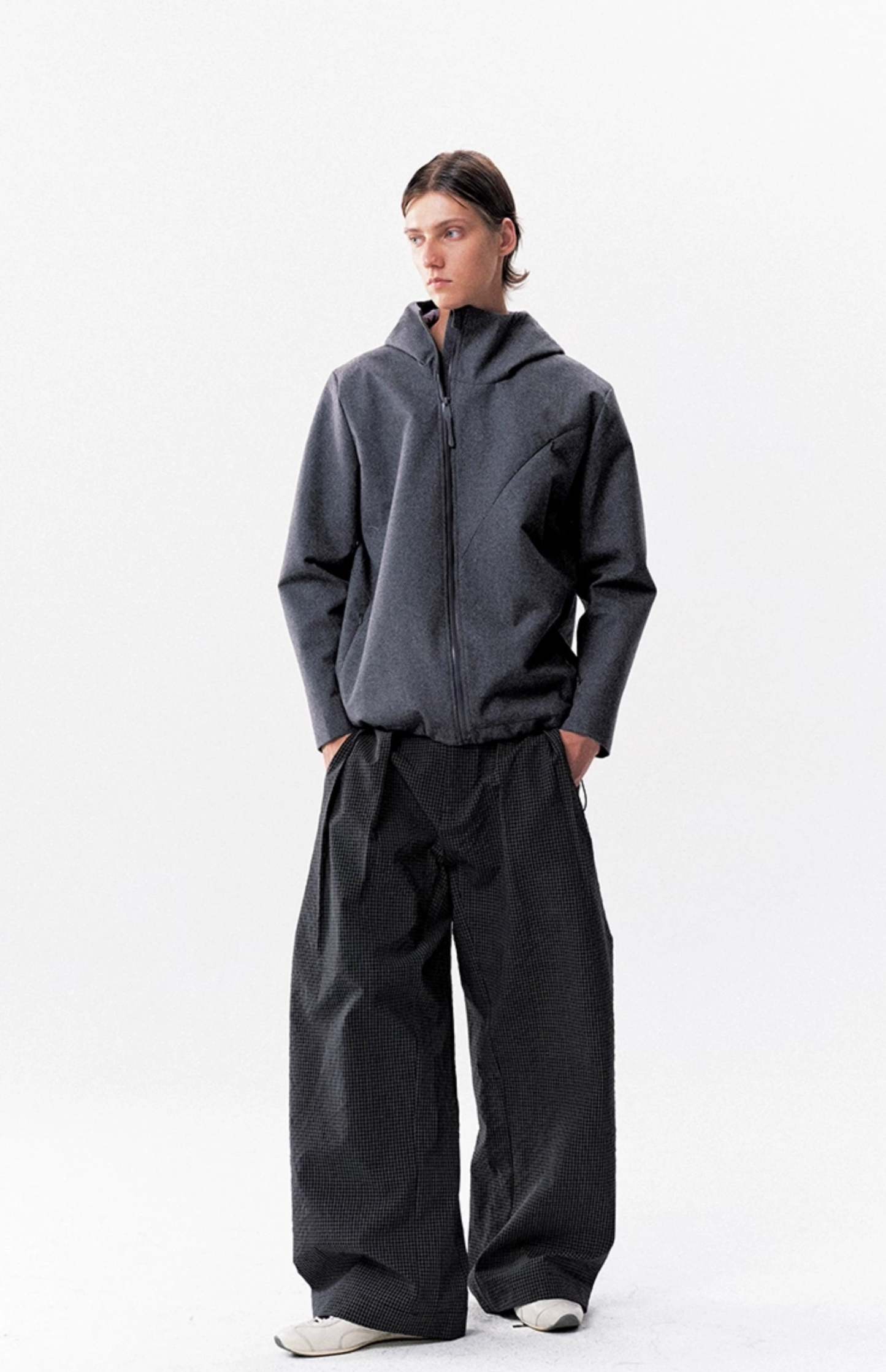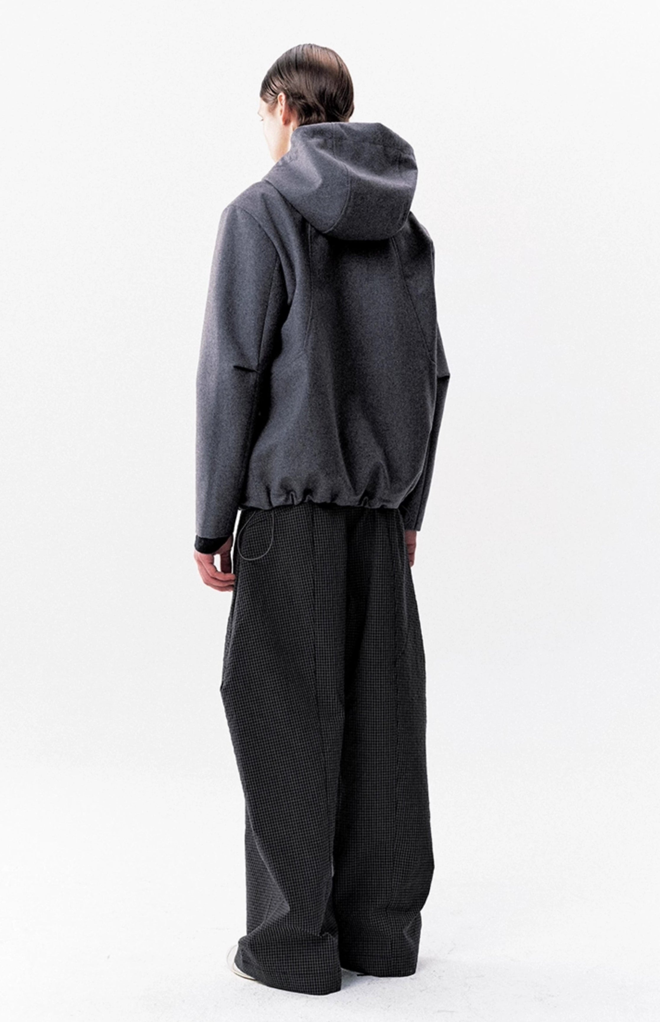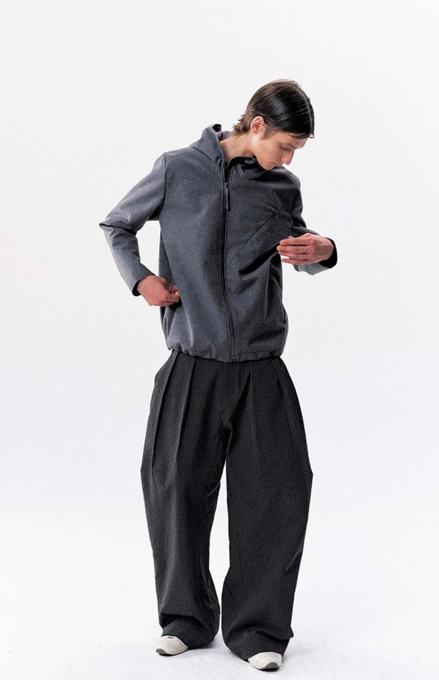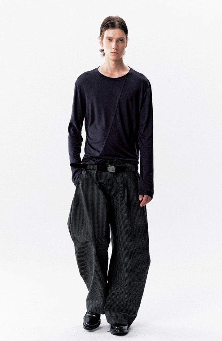 The High-Waist Micro-Check Pattern Wide Leg Pants stand out with a sharp pleated structure and textured micro-check design that adds depth without trying too hard.