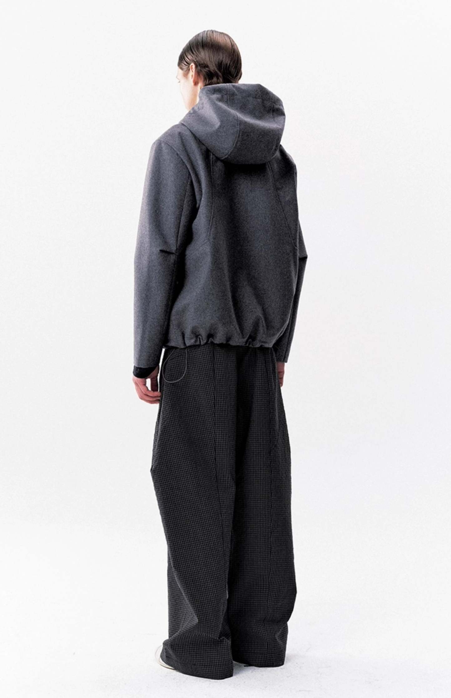 Designed with intent, these pants blend elevated tailoring with a relaxed silhouette that moves effortlessly through whatever the day holds. Crafted from a crinkled seersucker-like fabric with a dry hand feel, the trousers hold their shape while maintaining comfort. The subtle check pattern and structured A-line wide leg cut make these ideal for dressing up with a button-up or keeping it low-key with a sweatshirt.