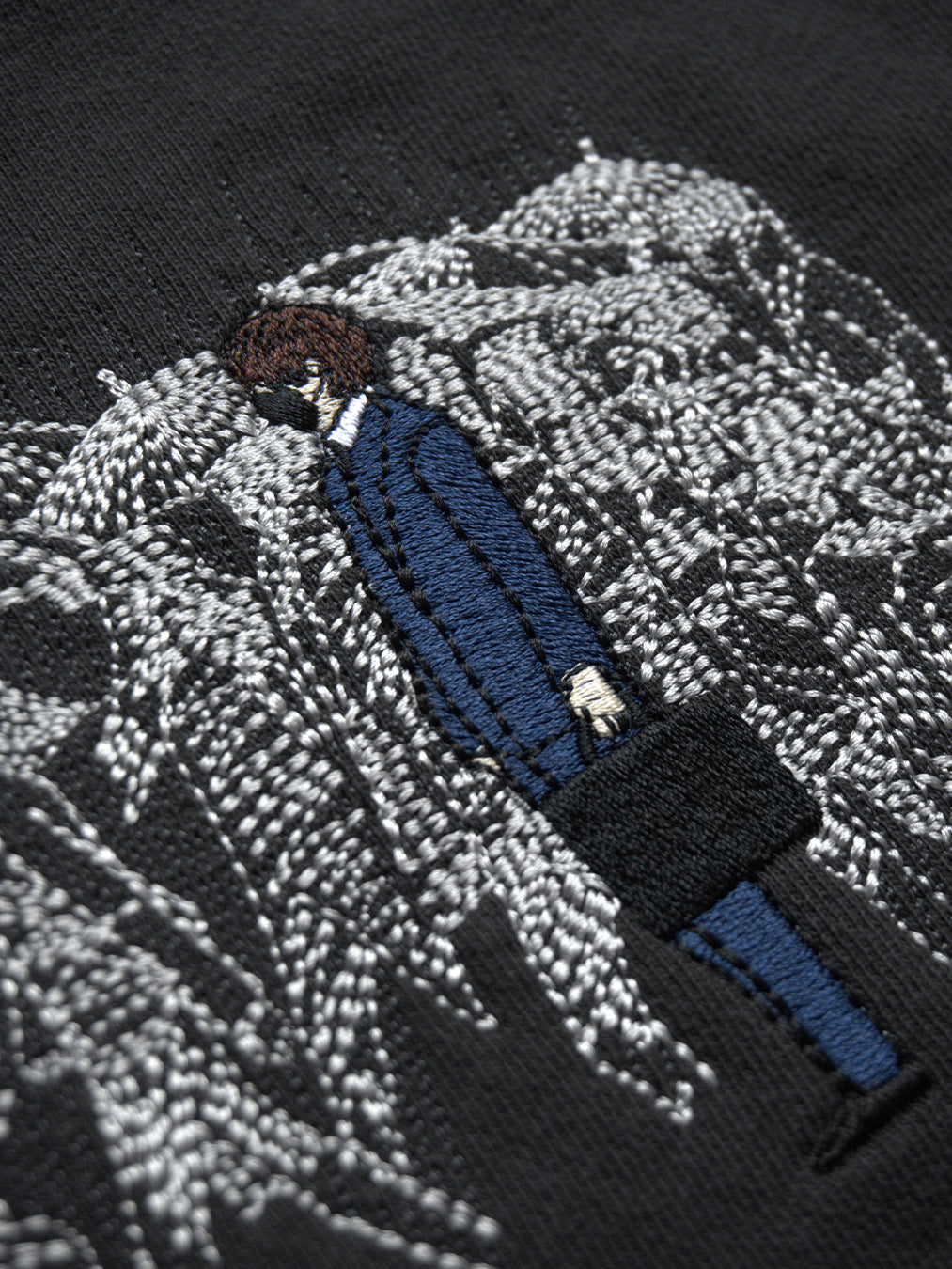 The "Karoshi" embroidery design shows a Japanese worker pausing for reflection amid a busy crowd. Rich in fine detail, it's ideal for T-shirts, sweatshirts, hoodies. Its large size highlights every intricate element — a bold piece for expressing your unique street style.
