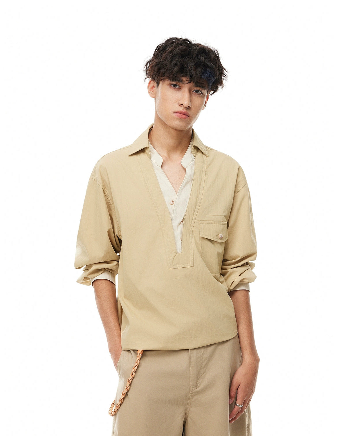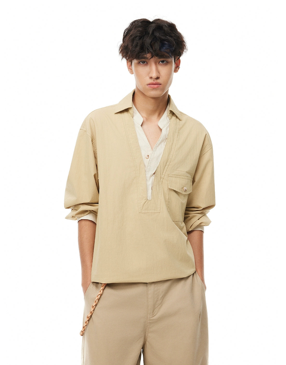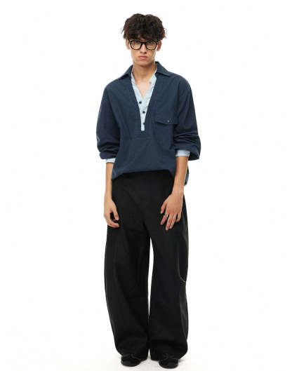 With a clean V-neck and tonal contrast details, it’s built for those who want something simple but distinctly put-together. Cut in a relaxed fit from a breathable blend of cotton and nylon, this design mixes structure with comfort. The mock inner layer adds depth without additional weight, while the buttoned popover neckline brings a casual edge.
