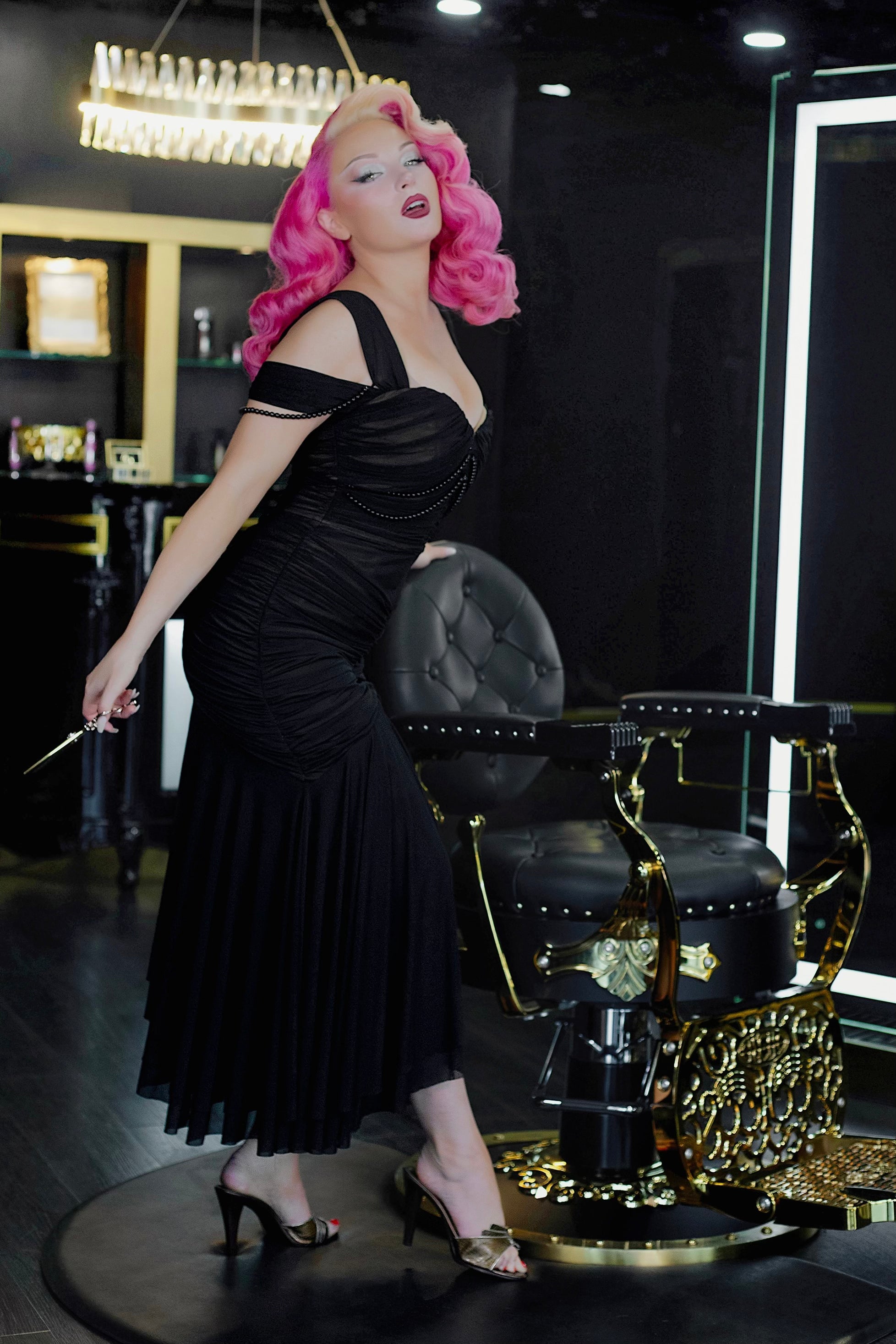 An epic tale of tainted love, our Mummy-inspired dress captures the romantic spirit of cursed Imhotep. This illusion dress is comprised of ultra stretchy, nude bengaline, which is then covered by ruched and ruffled black mesh to create a bandaged effect. It possesses a sweetheart neckline, with both regular straps and off-the-shoulder straps—the latter of which are adorned by black beads. More black beads hang from the bodice to represent the many treasures of our haunting royal. A hidden zipper in back completes the dress.