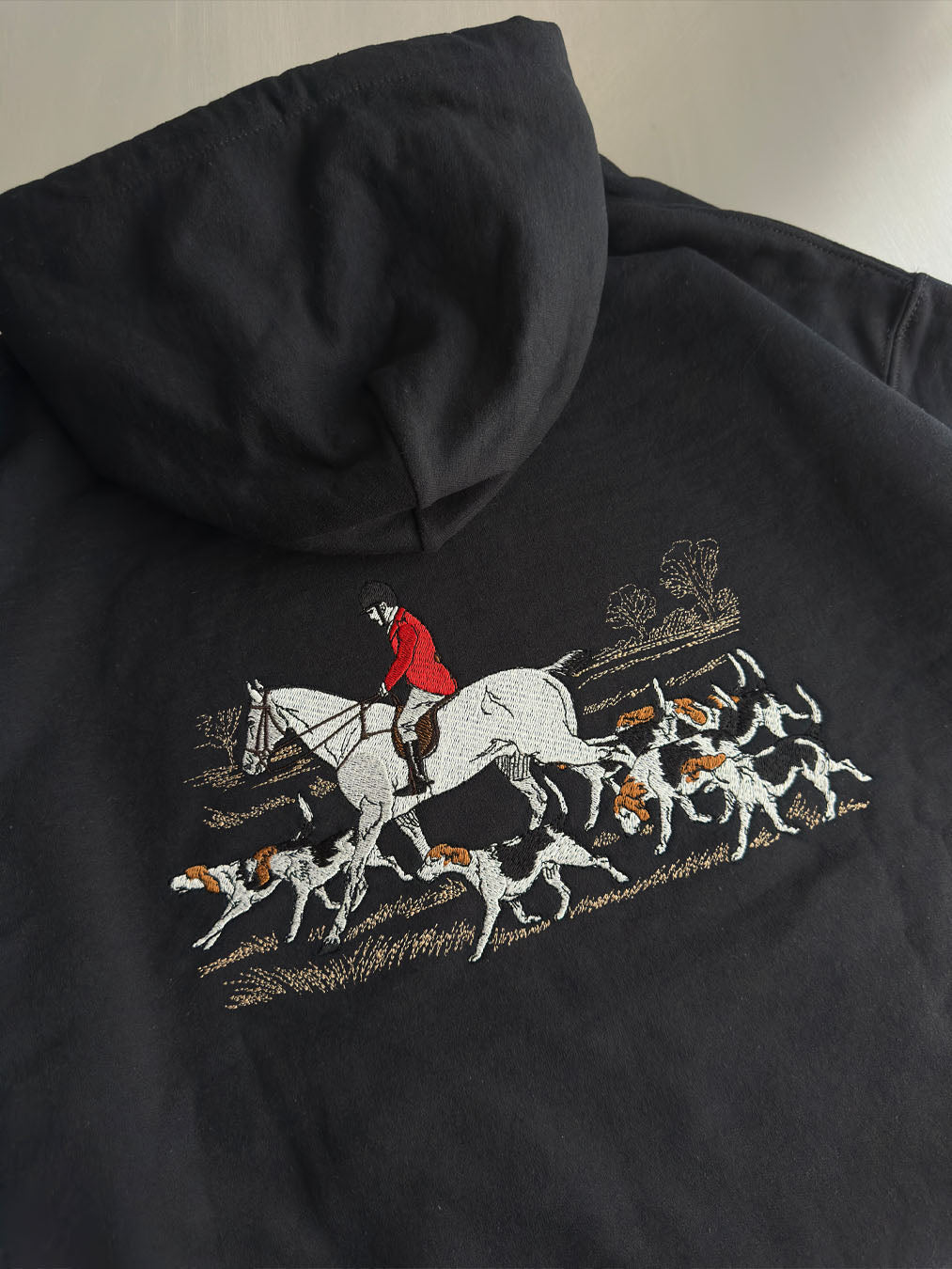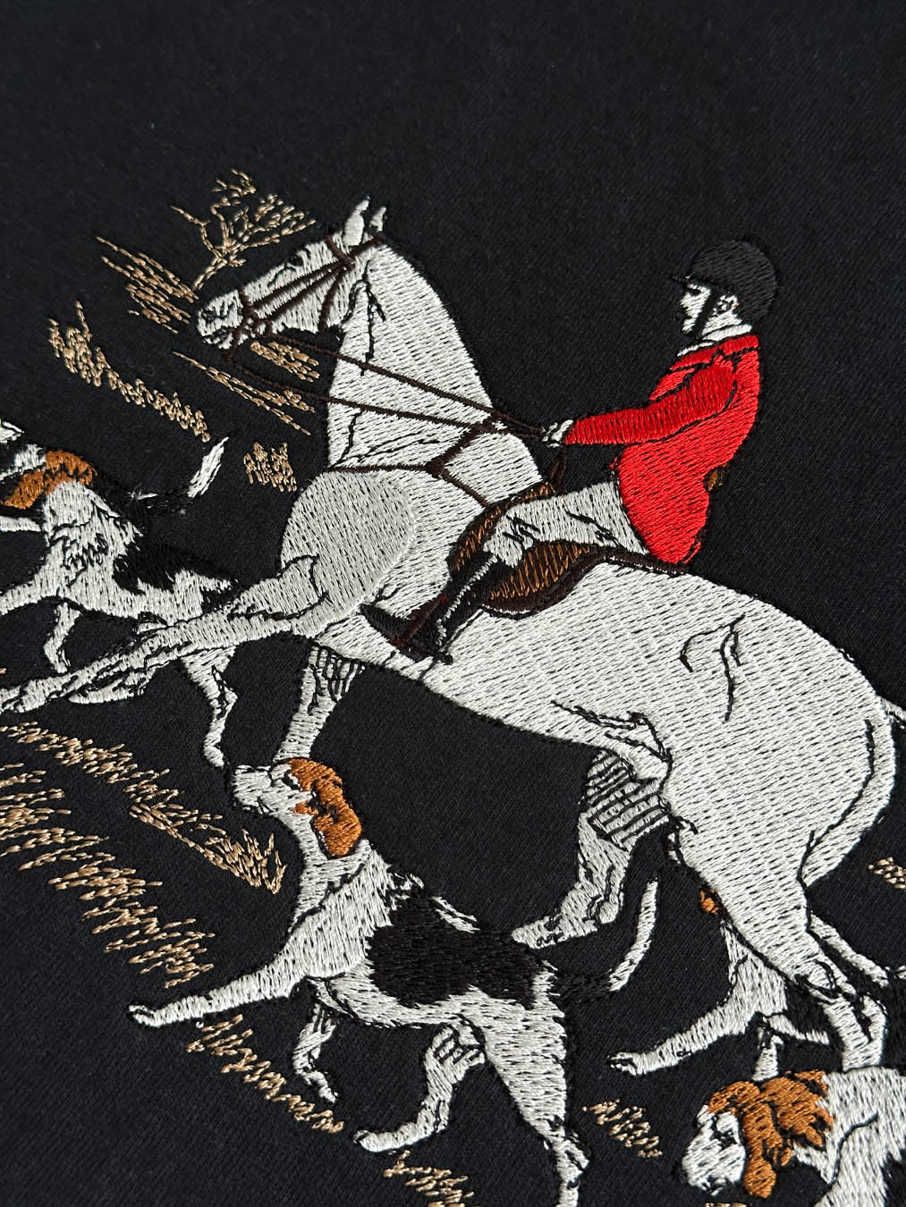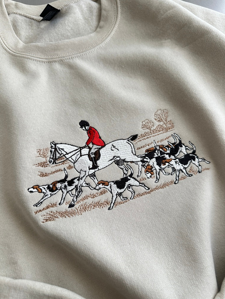 On the Trail The scene captures a quiet morning in the English countryside: a rider in red charges forward on a white horse, followed closely by a focused pack of hounds. Every movement is stretched, every figure caught mid-stride. The background is only lightly sketched—dry grass, shrubs, a hint of wind—just enough to frame the momentum and silent intensity of the chase.
