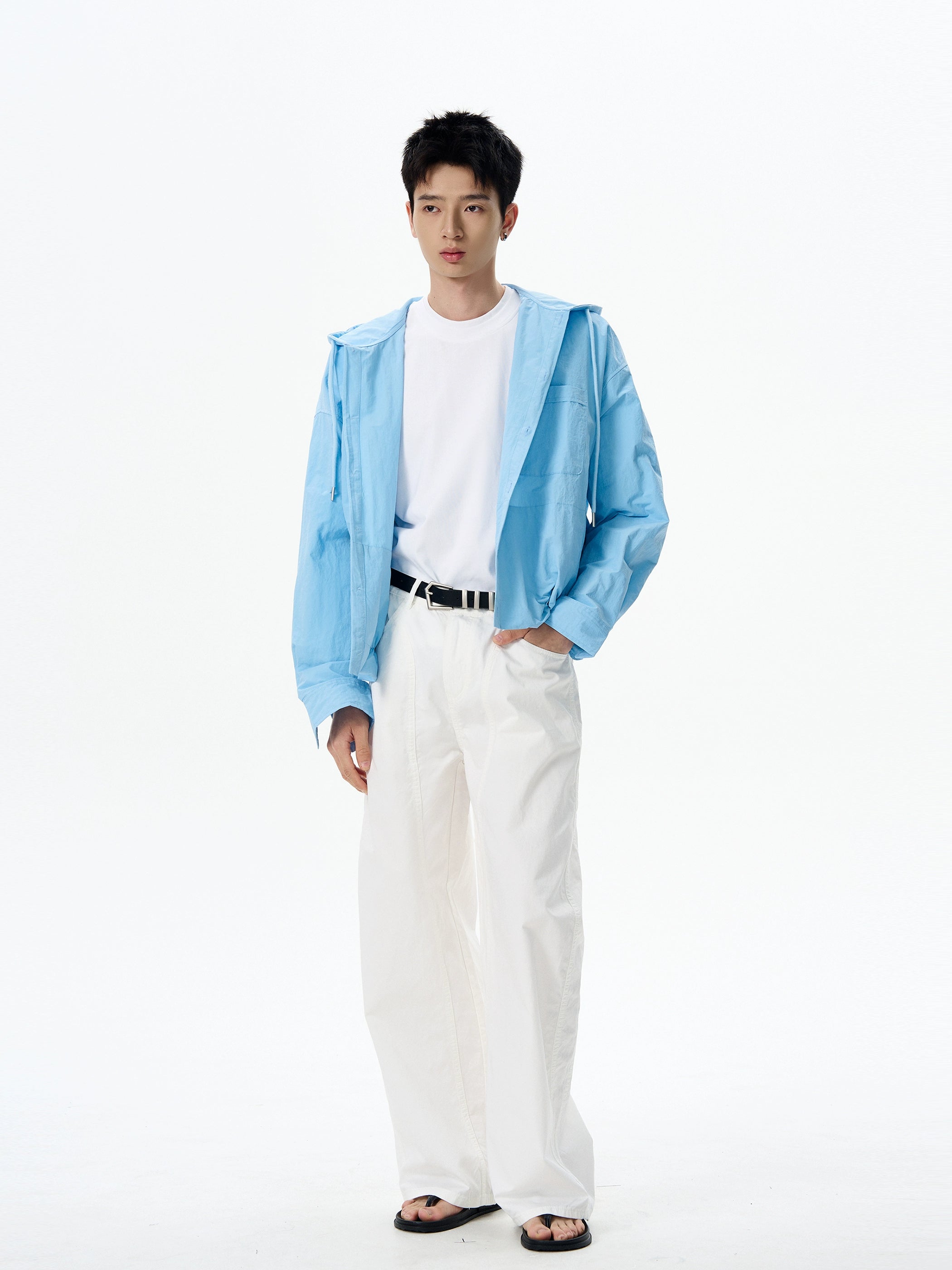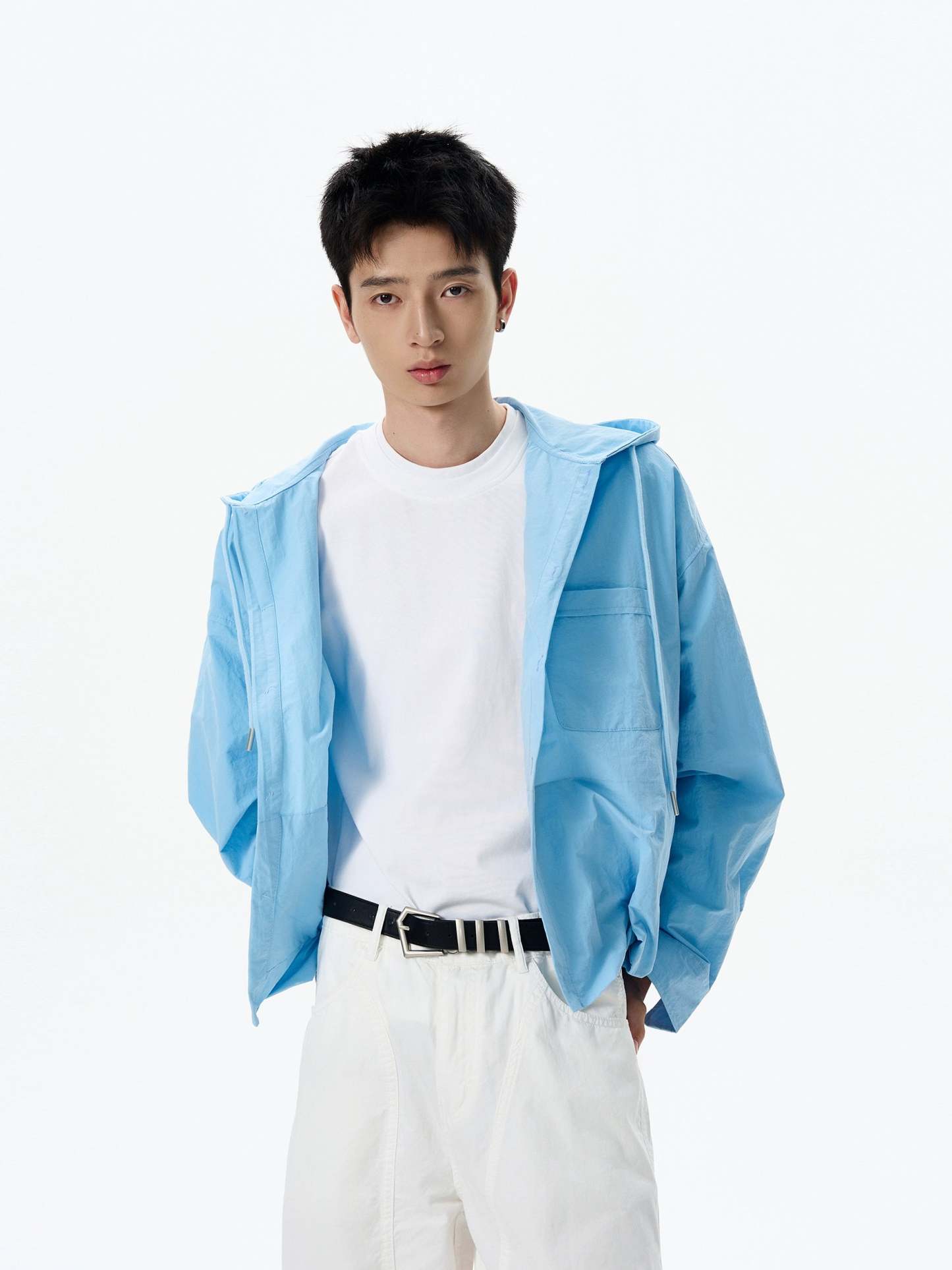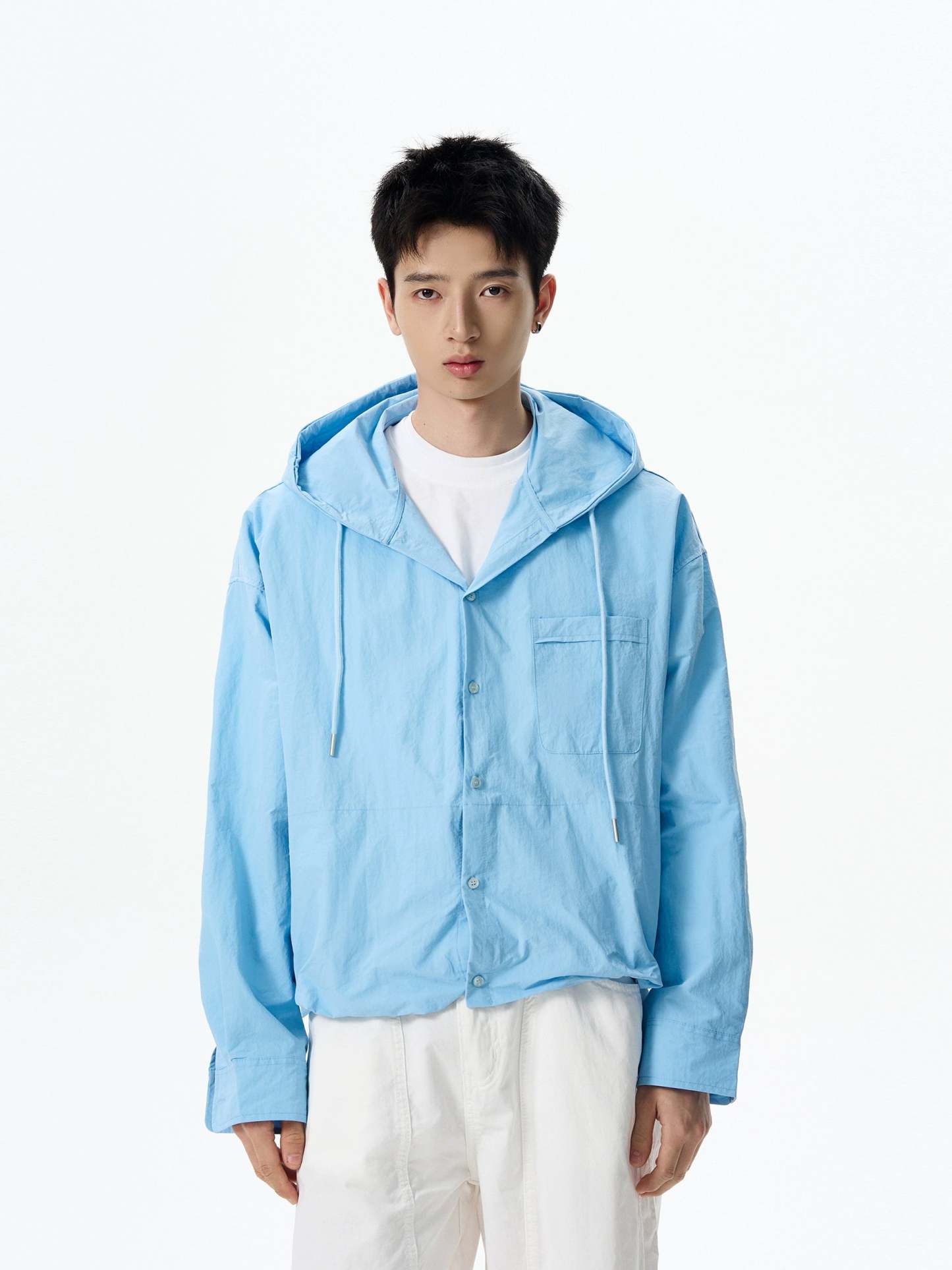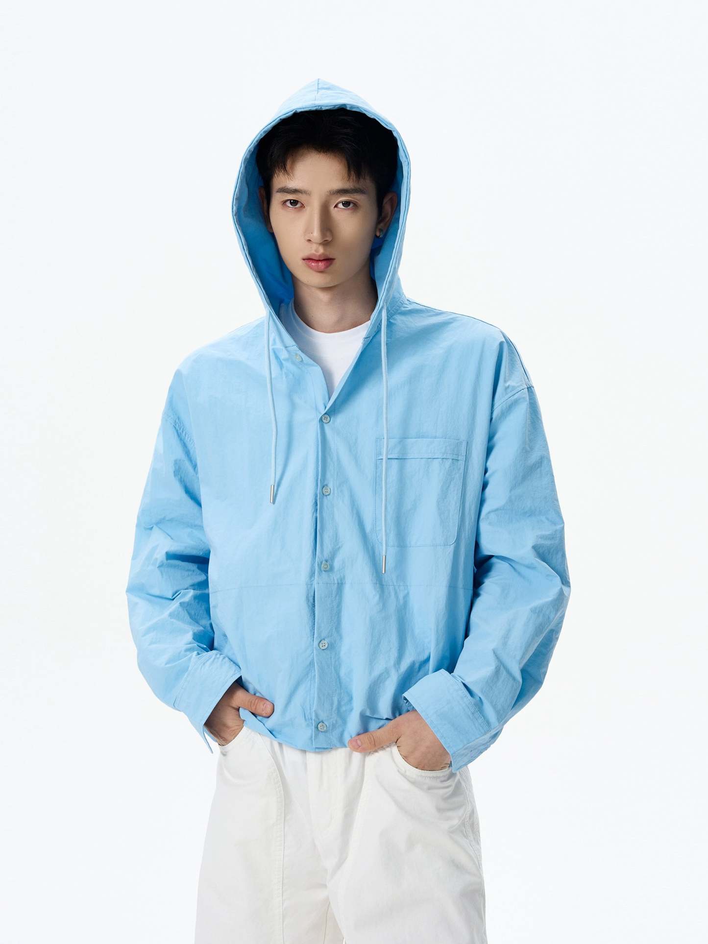 This oversized hooded button shirt stands out with a laid-back structure and a crisp light blue tone that’s easy to wear and even easier to style.