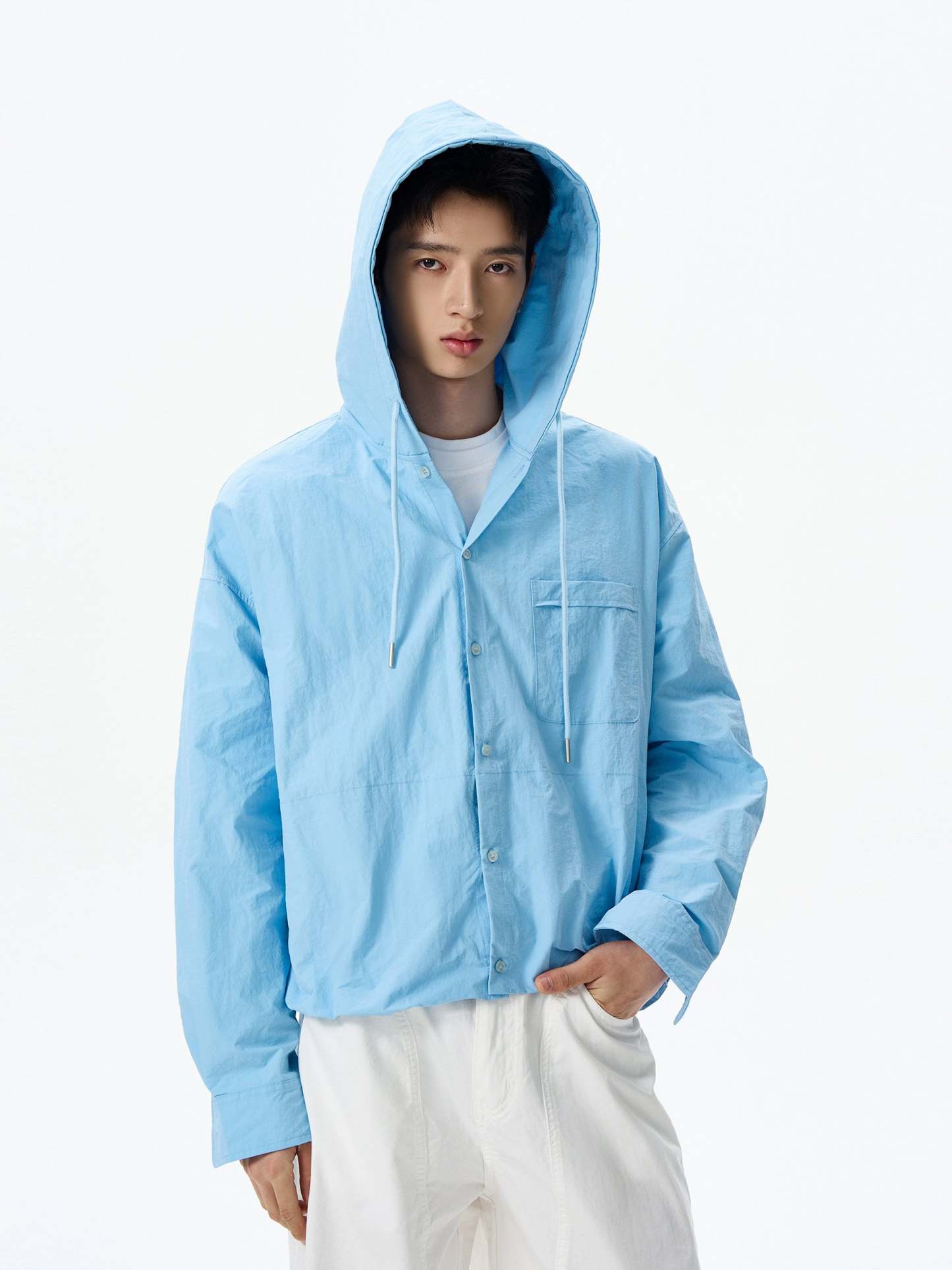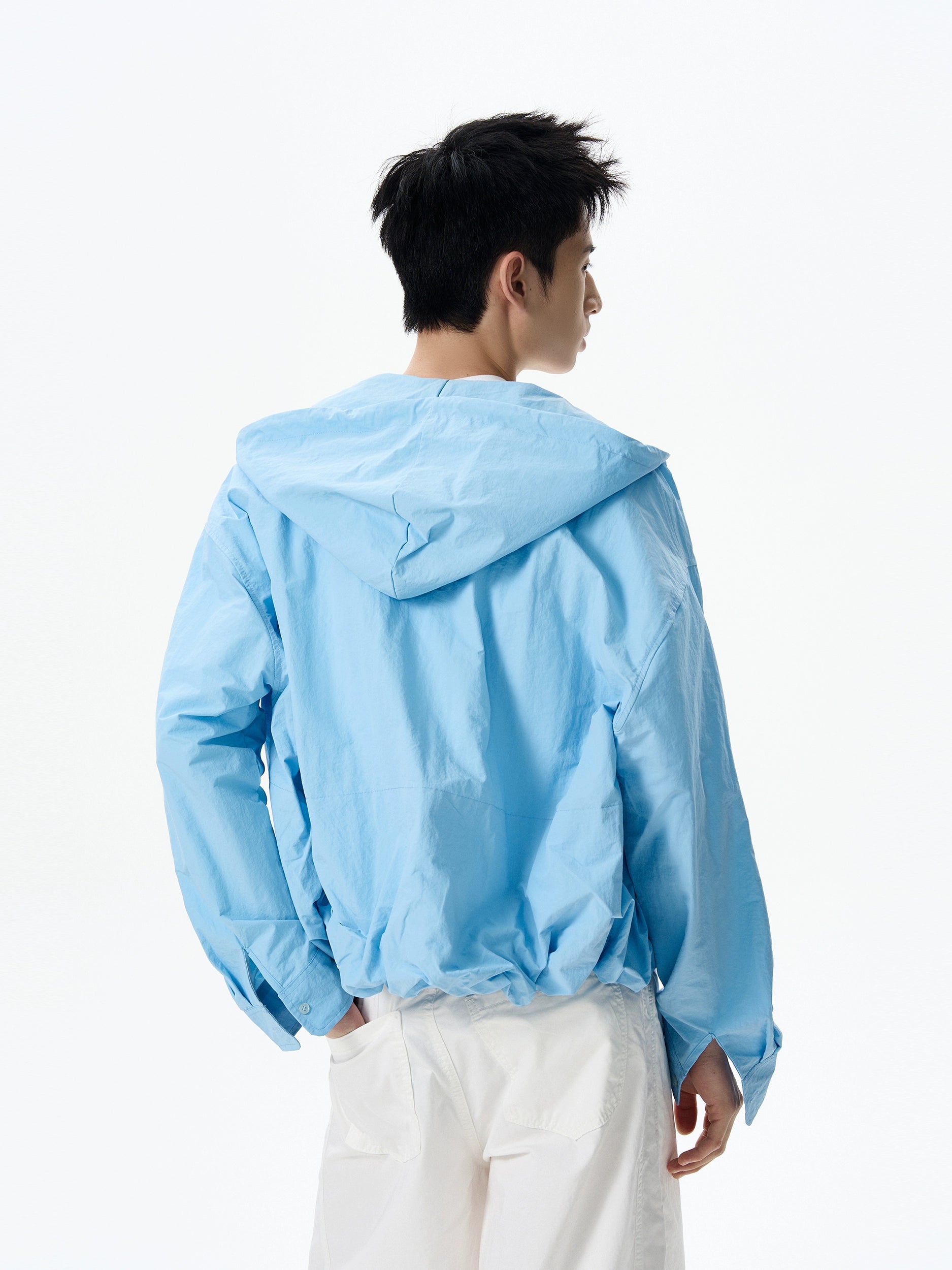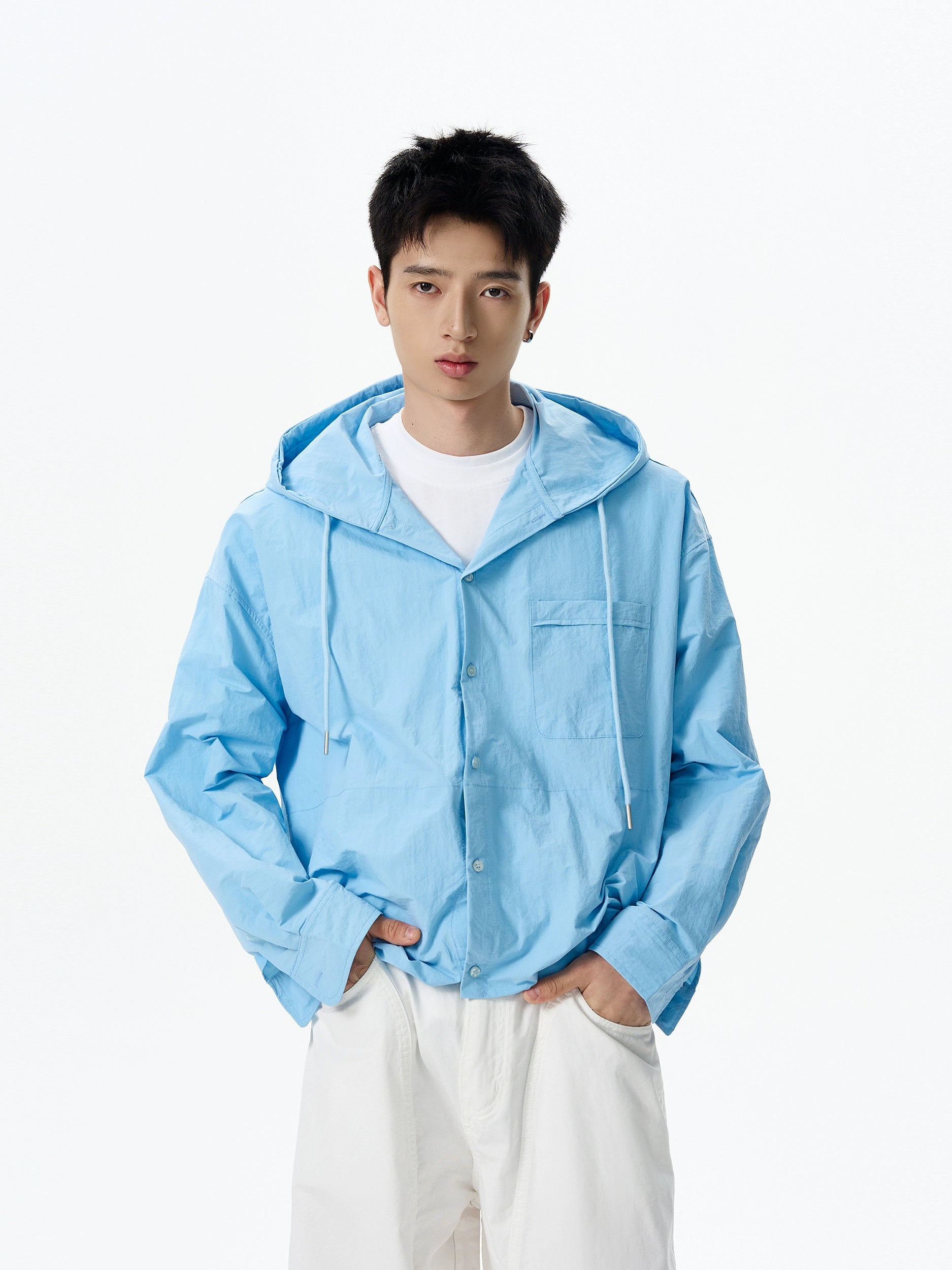 Designed with an easygoing silhouette, it brings the comfort of a hoodie to the clean lines of a shirt. Crafted from a lightweight and breathable fabric, it’s built to keep you covered without overheating. The texture has a subtle crinkle finish for a broken-in feel, while the anti-UV functionality adds a layer of practicality. Button-up closure, drawstring hood, and flap chest pocket complete the minimalist yet wearable design.