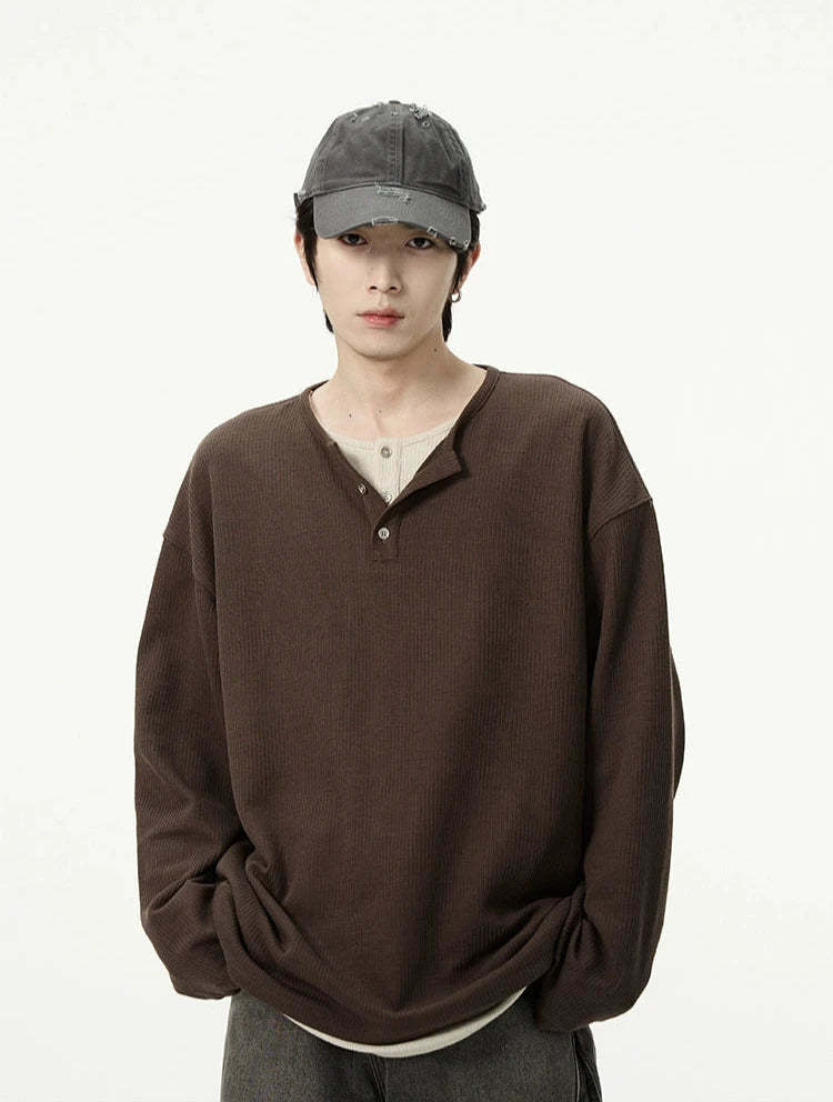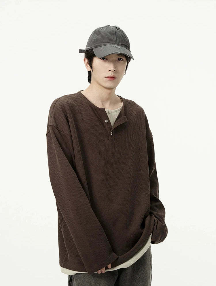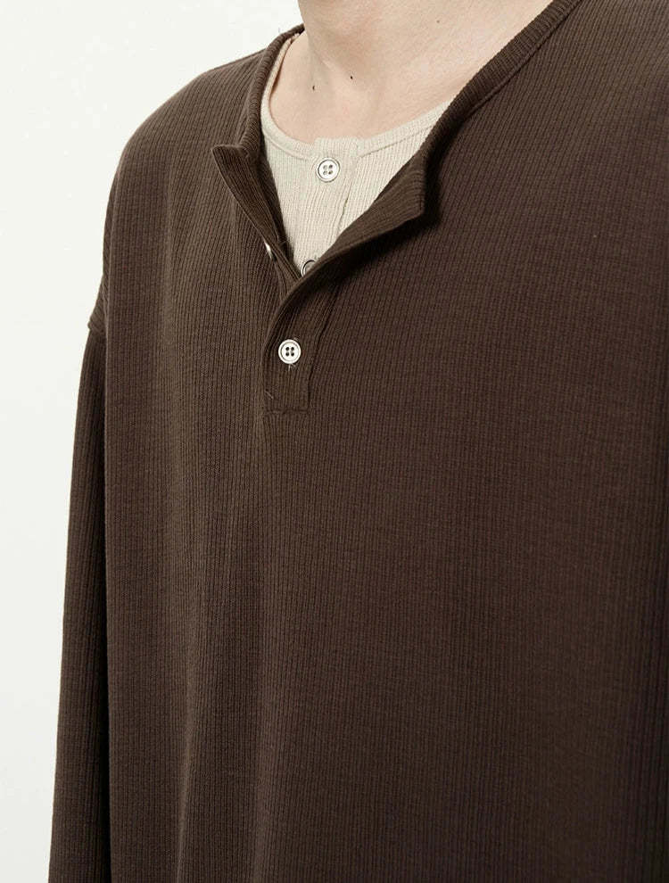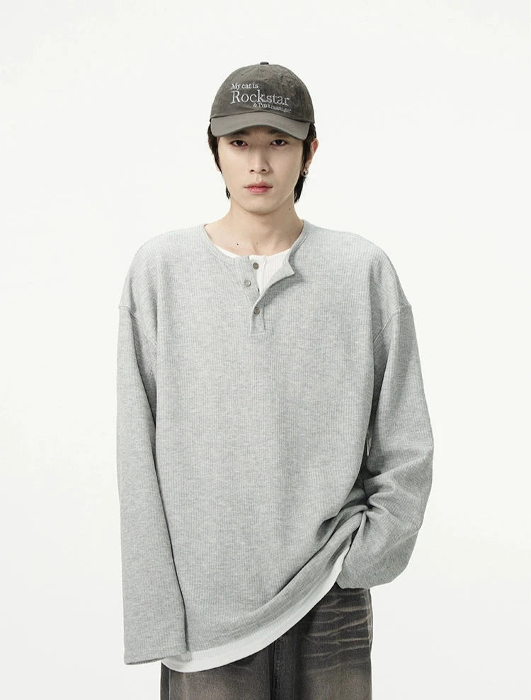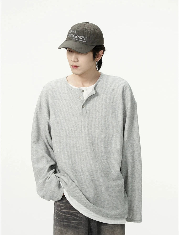 Discover effortless edge with our Oversized Mock-Layered Ribbed Knit Henley Top, designed to add a touch of laid-back sophistication to your wardrobe.