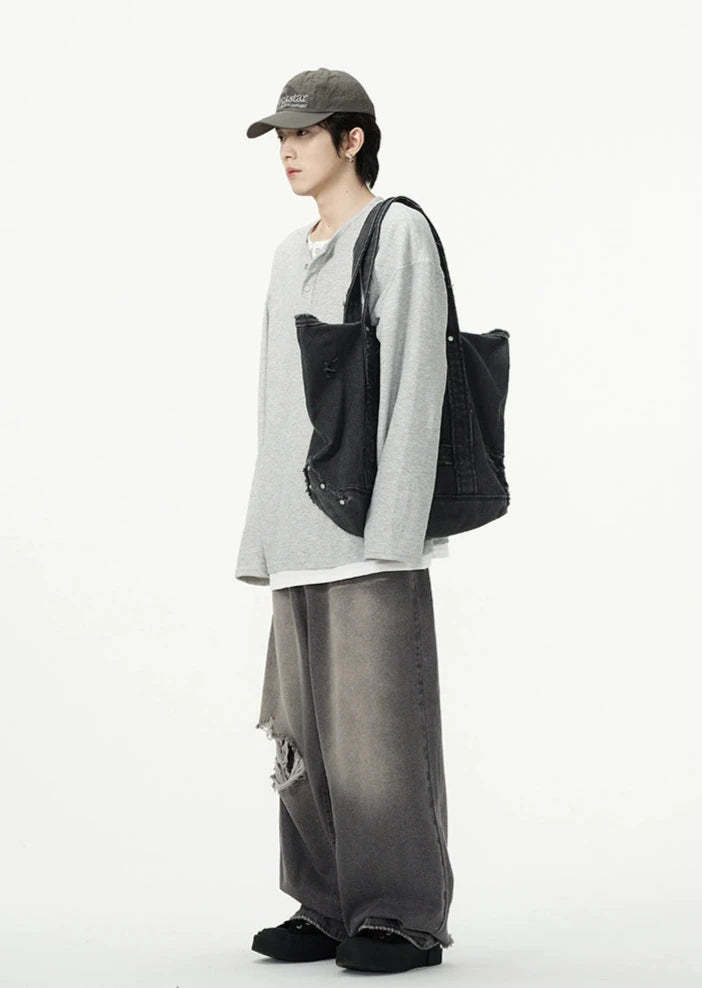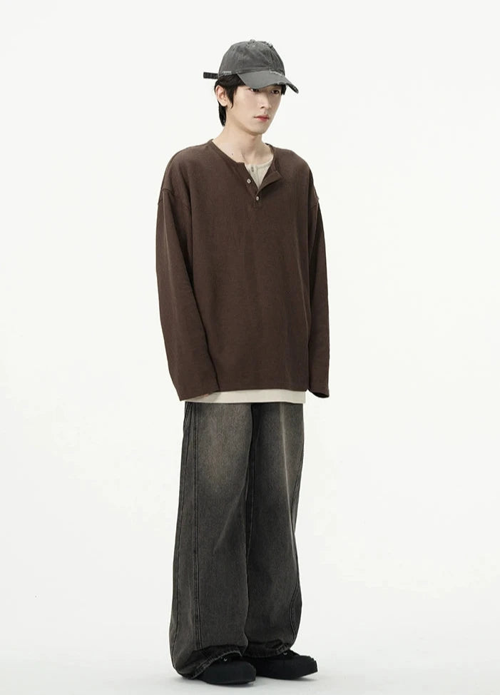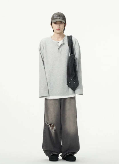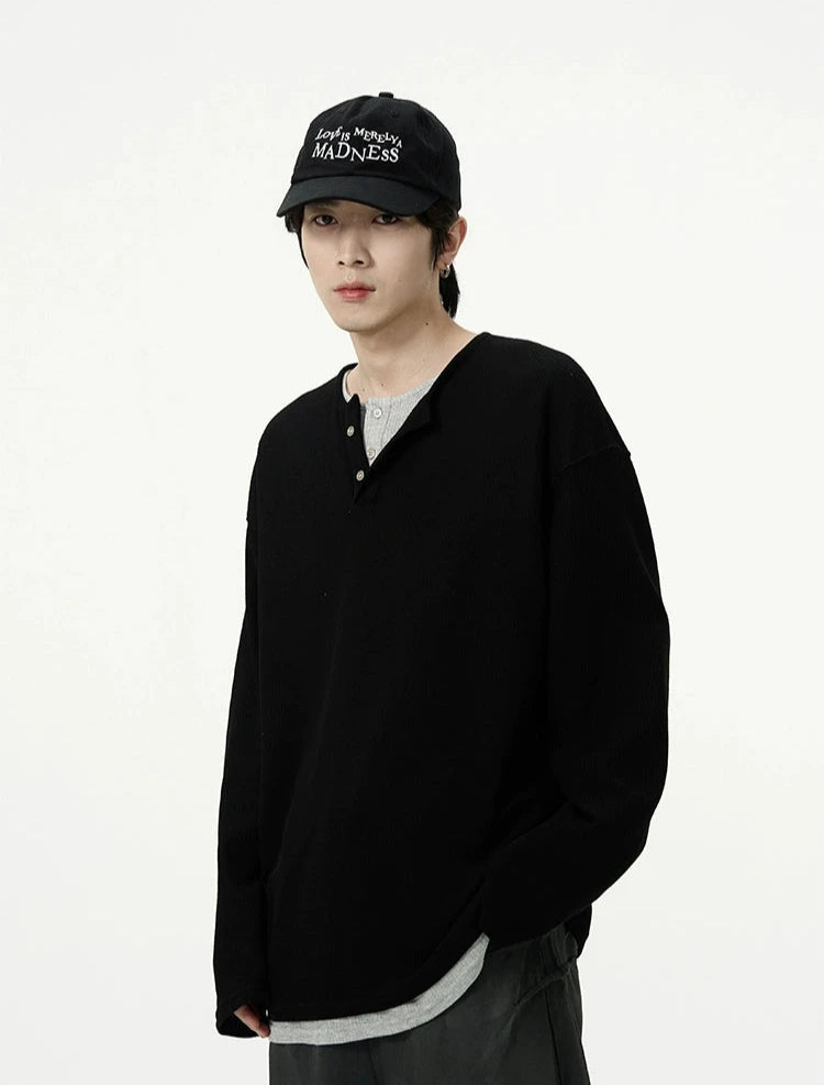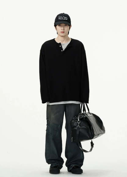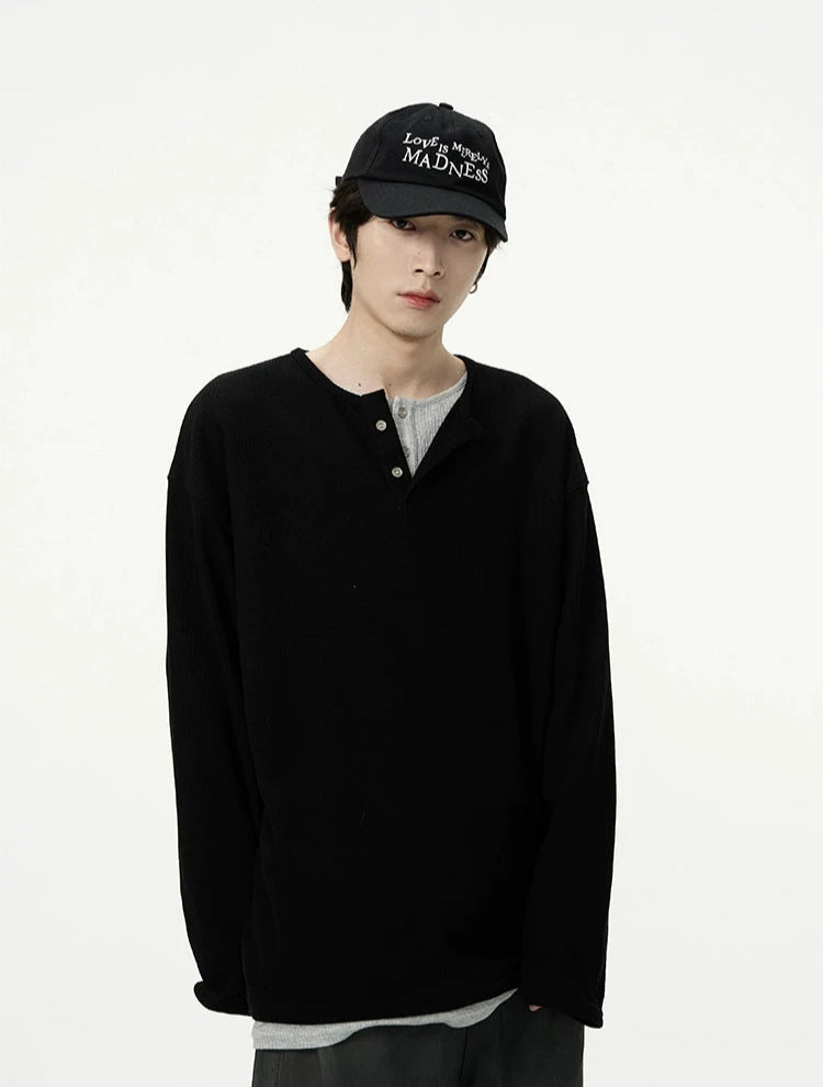 Discover effortless edge with our Oversized Mock-Layered Ribbed Knit Henley Top, designed to add a touch of laid-back sophistication to your wardrobe.