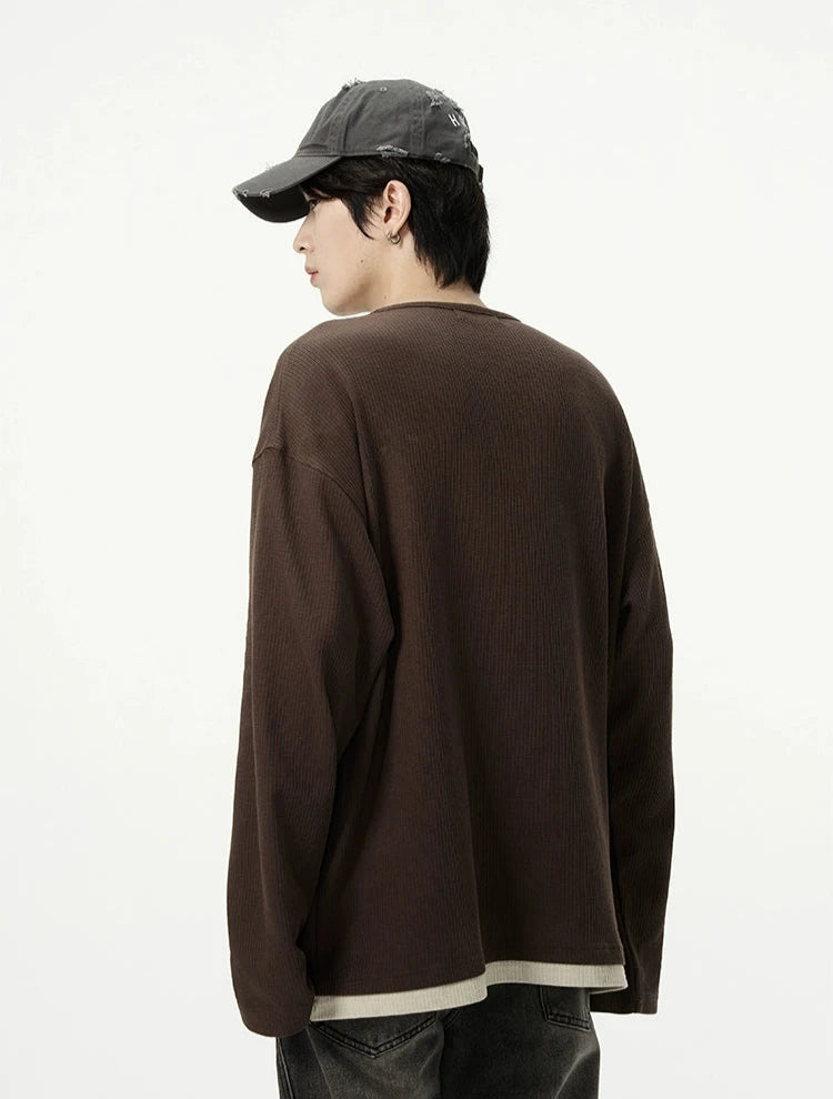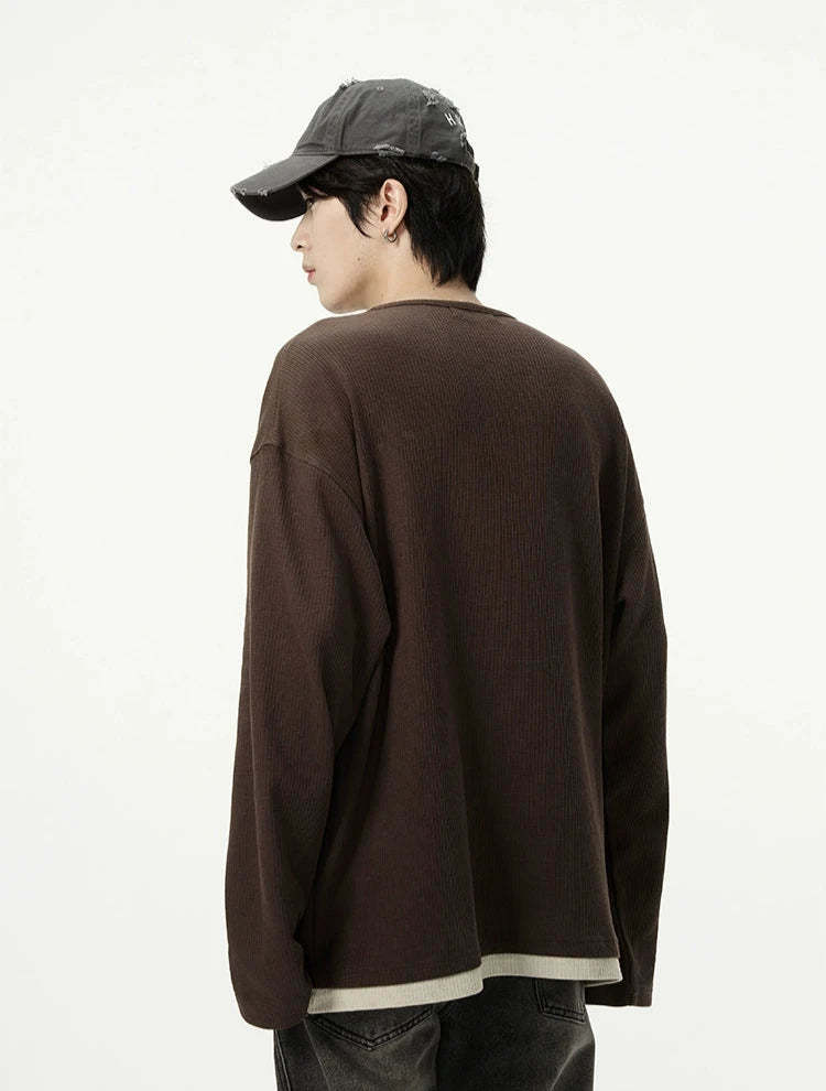 Crafted from premium materials, this top features a unique mock-layered design with a ribbed knit texture that creates a multidimensional look. The round neck and conventional thickness make it an ideal choice for transitional weather, while the loose fit ensures all-day comfort.