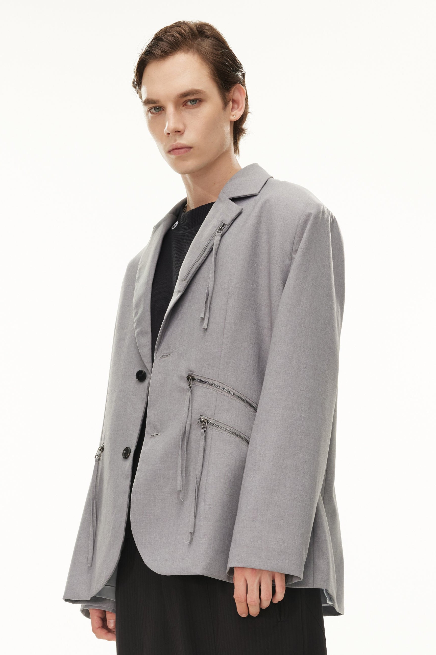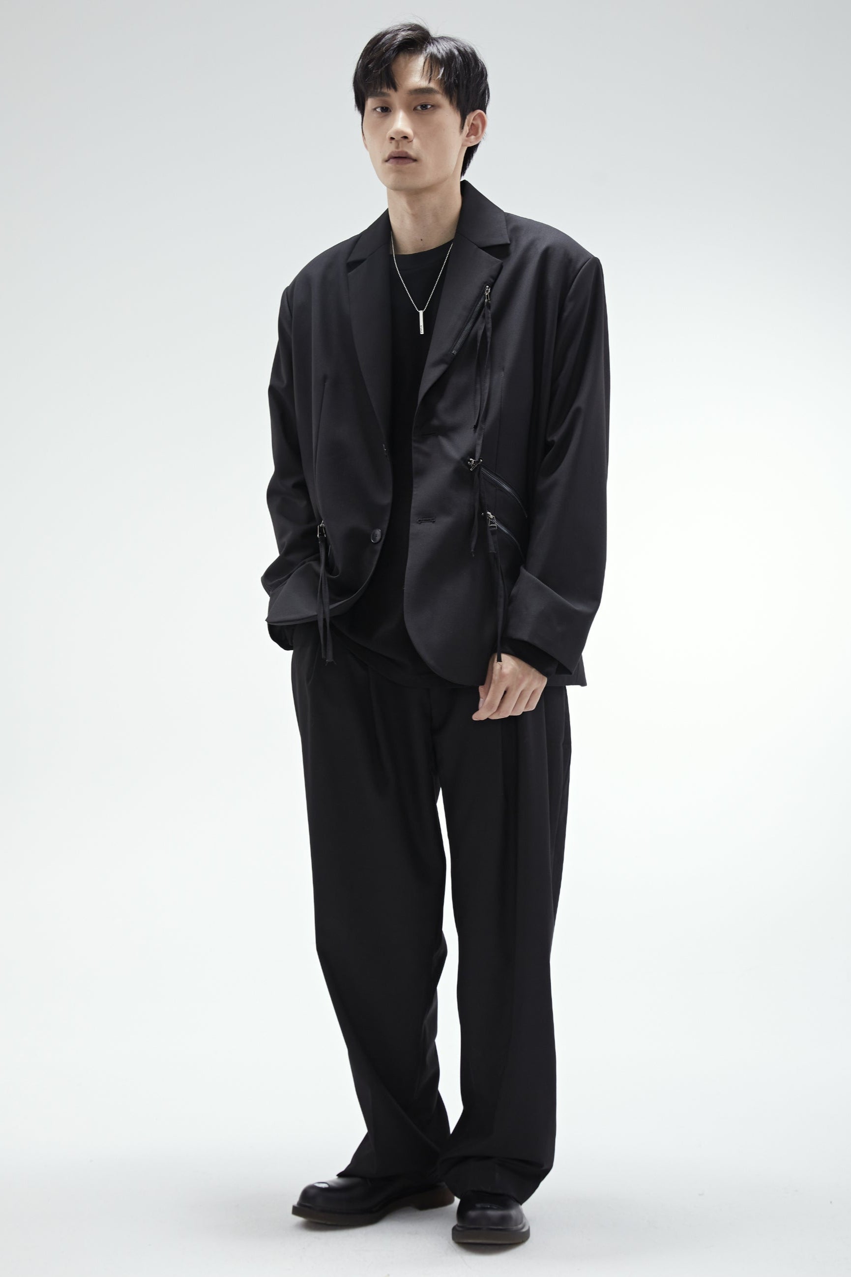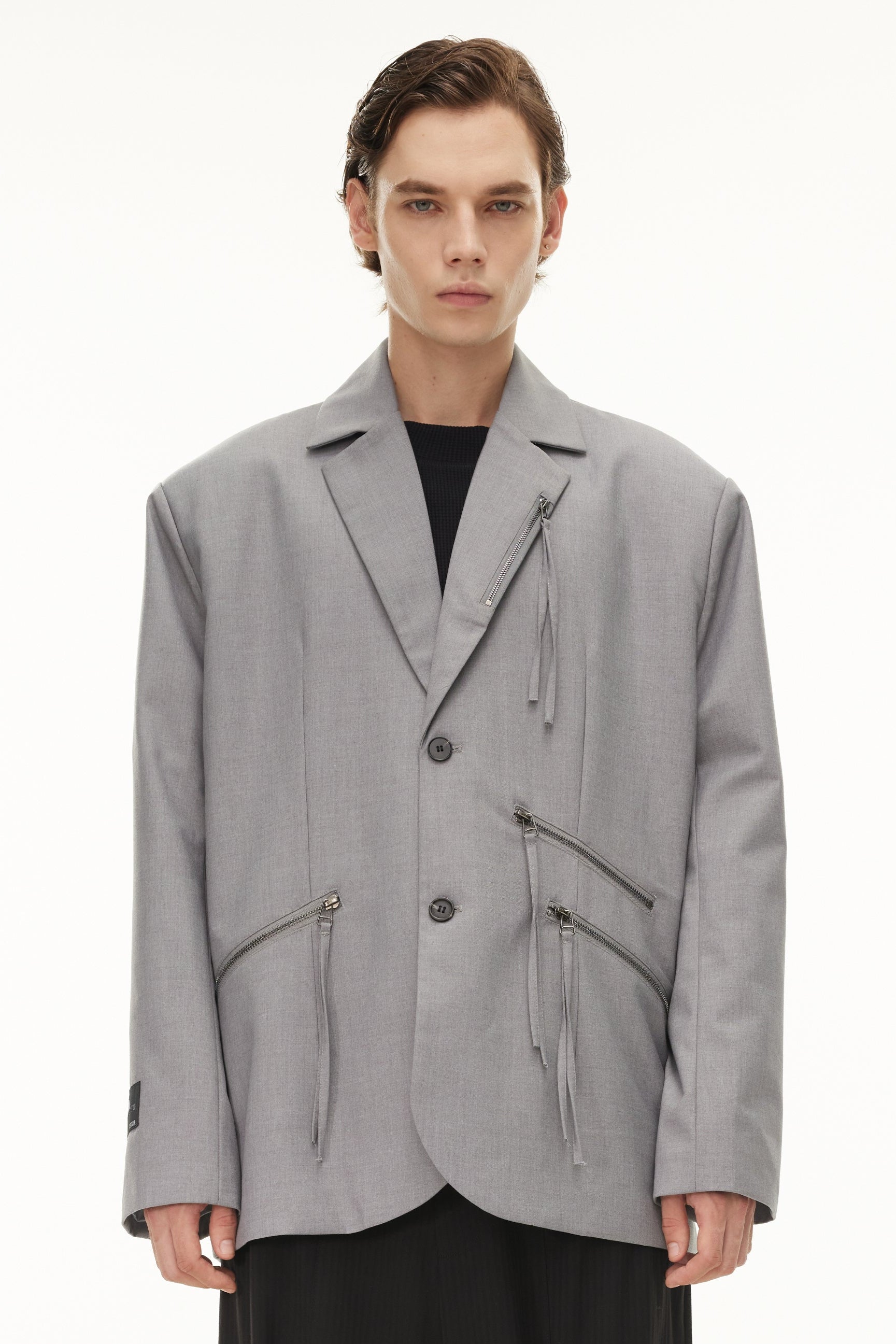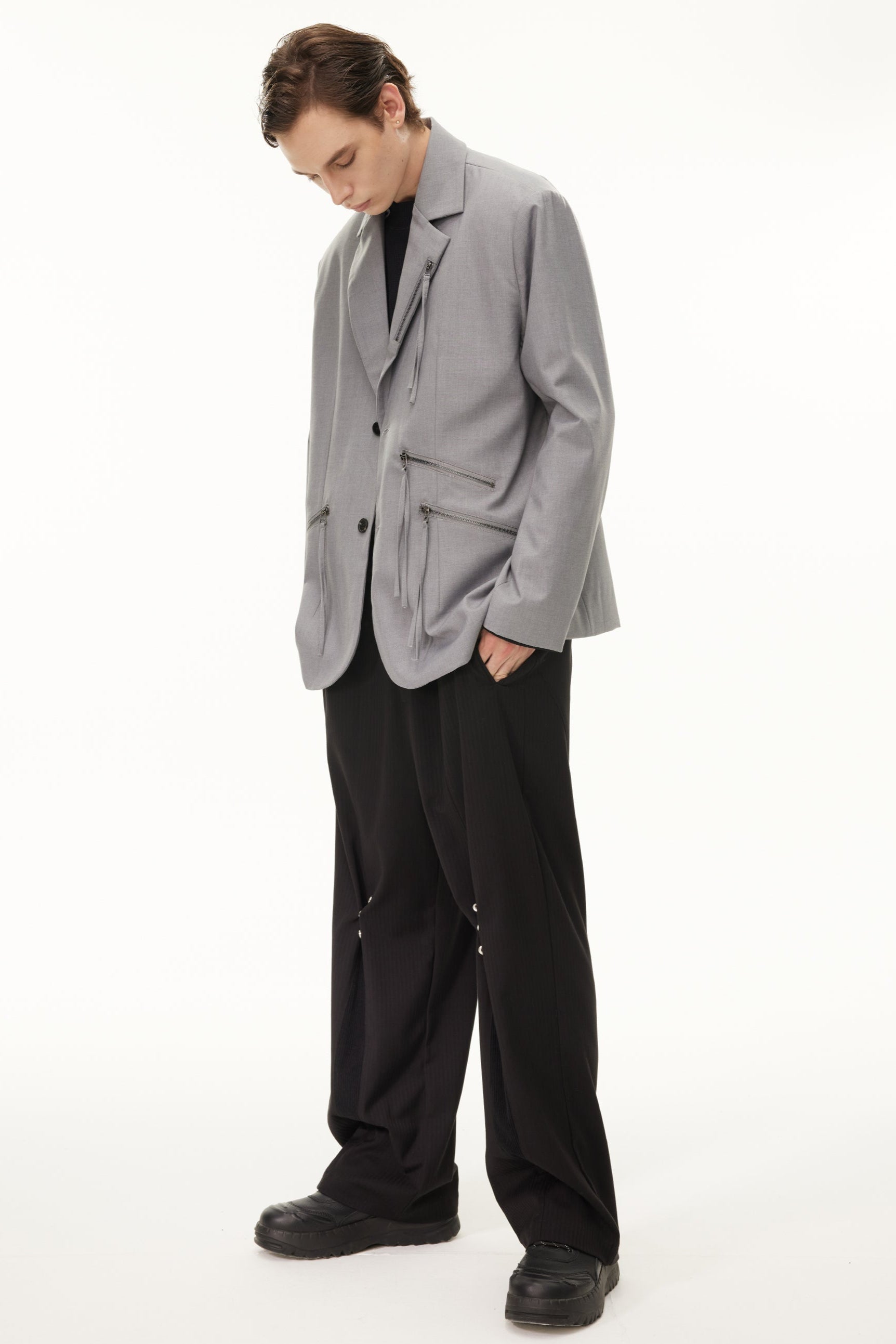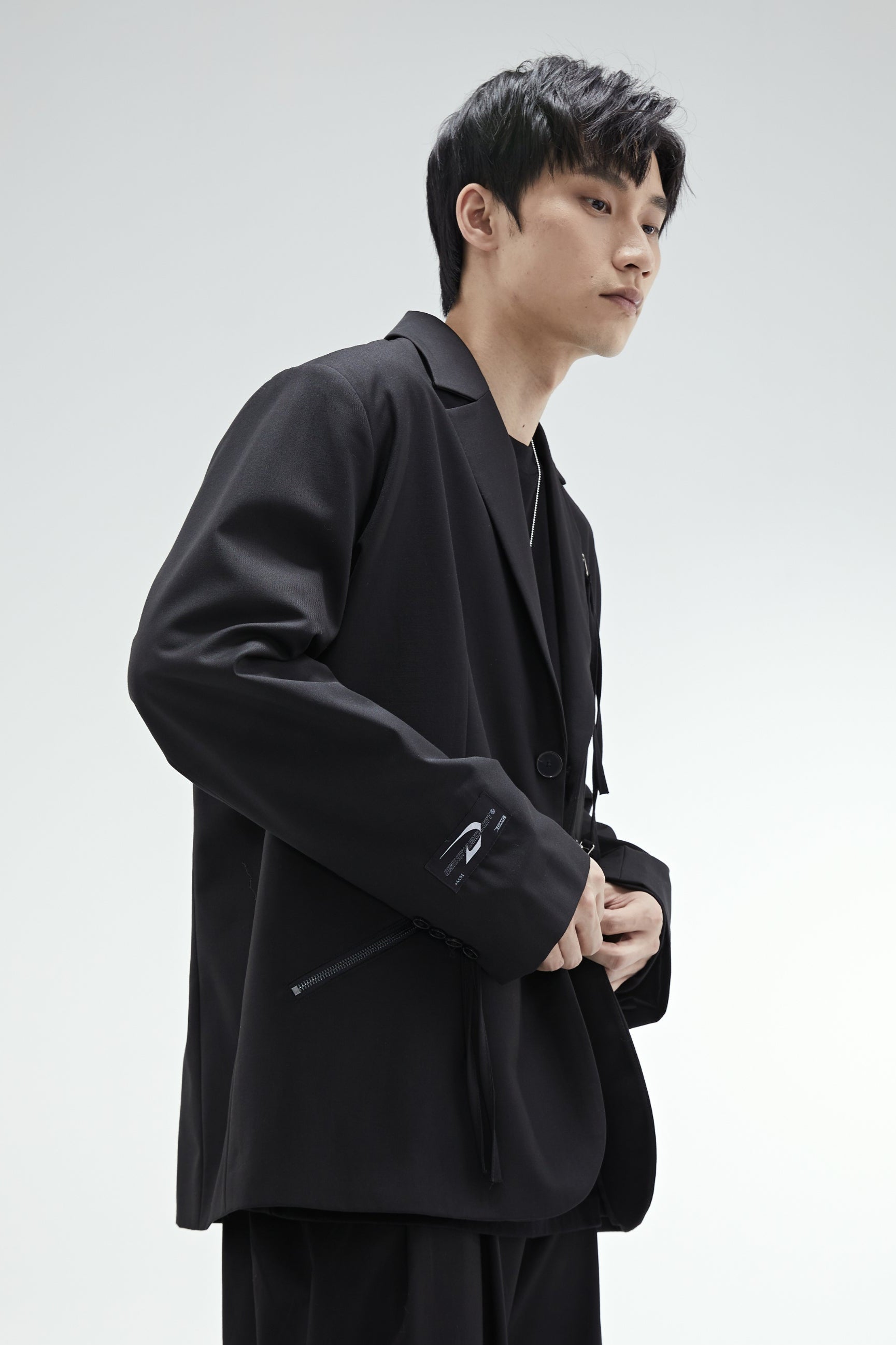 Cut from a smooth, matte-finish polyester blend with subtle stretch, this blazer features a single-breasted closure, narrow notch lapels, and distinctive decorative zip details with loose tassels that elevate its clean structure. The loose fit and padded shoulders give it a confident drape that’s both modern and effortless, while the back slit adds movement and breathability.