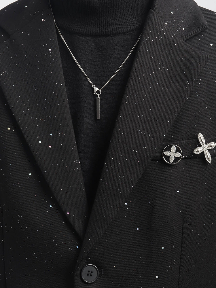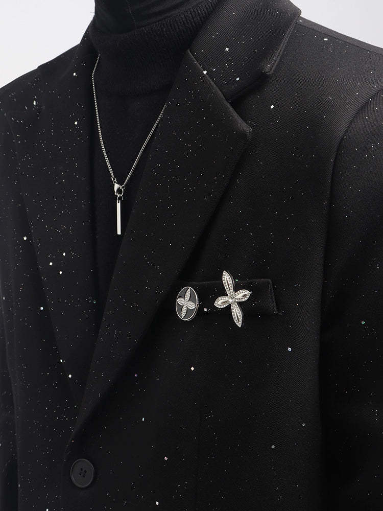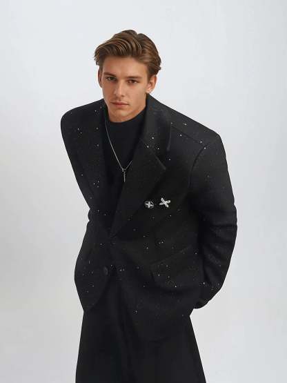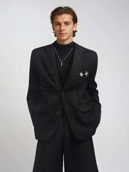 Tailored for modern streetwear sensibilities, it makes a bold impression while staying grounded in versatility. Crafted from a textured black fabric with scattered speckle accents, it’s detailed with flap pockets and subtle metallic pin accessories for just the right amount of edge.