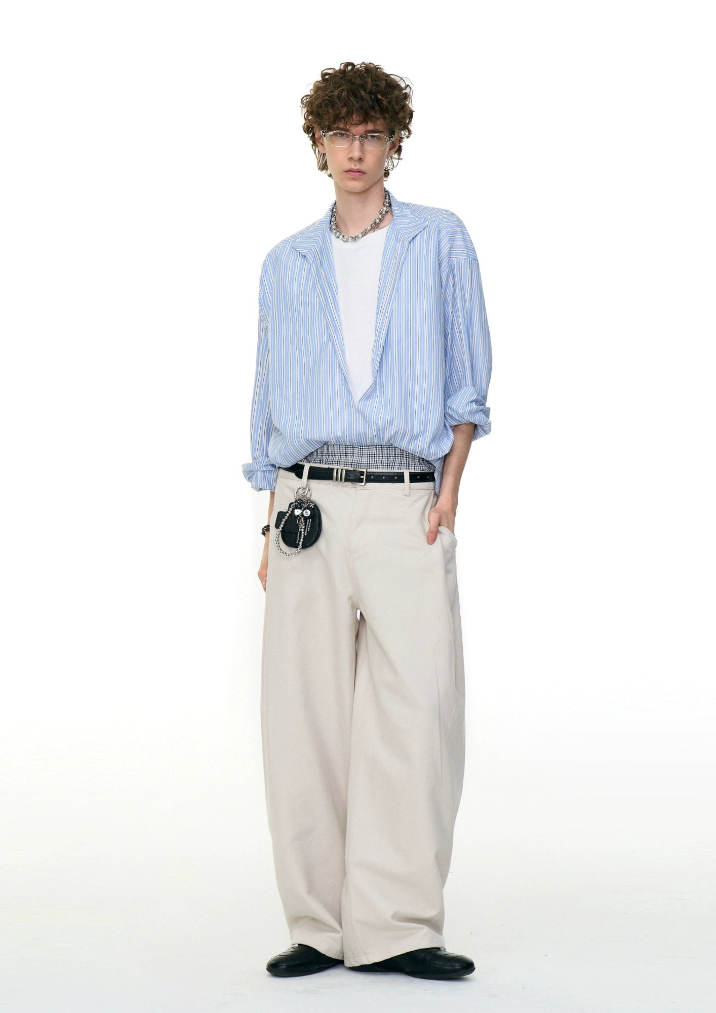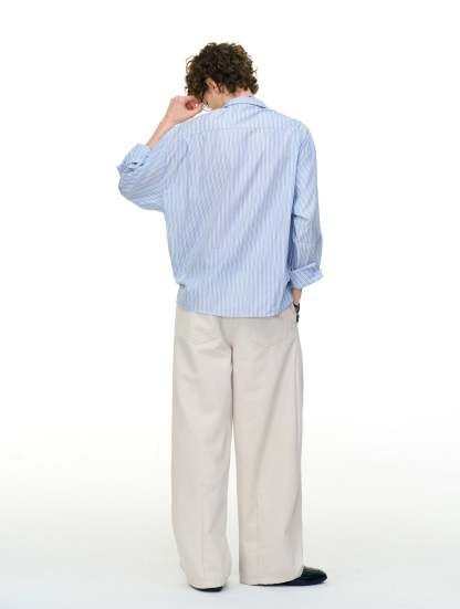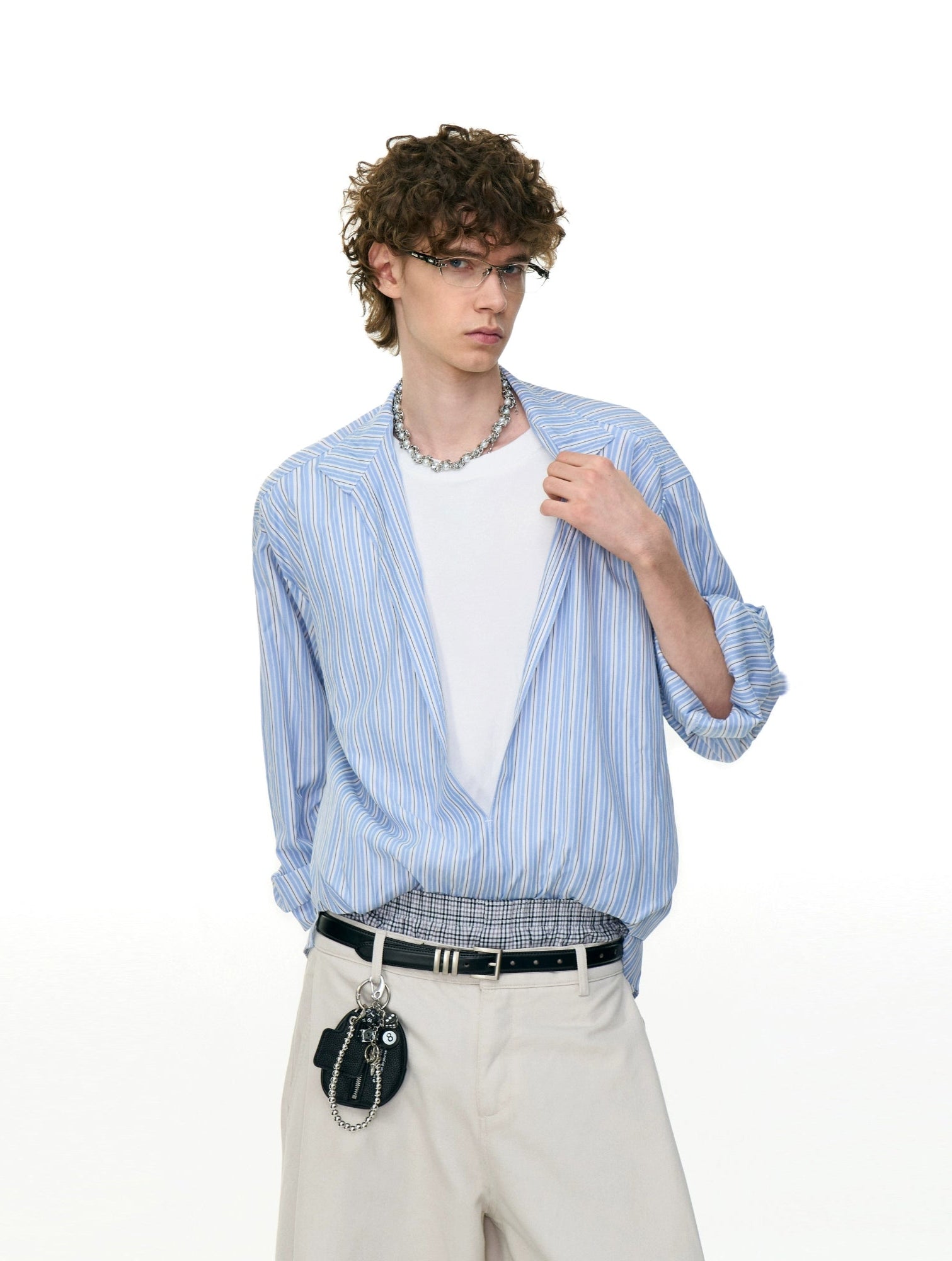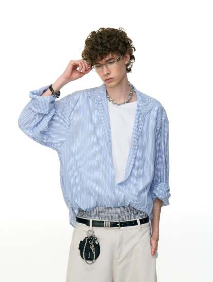 It’s built for easy layering or solo wear when you want your outfit to feel put-together without looking overdone. Crafted from a breathable blend of 65% polyester and 35% cotton, the fabric is soft, lightly washed, and features subtle contrasting stripe patterns that nod to vintage American styles. Its loose fit and unstructured silhouette give it a naturally offbeat balance between crisp and casual—ready for low-key city days, coffee runs, or laidback nights out.