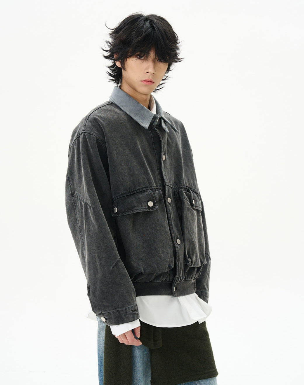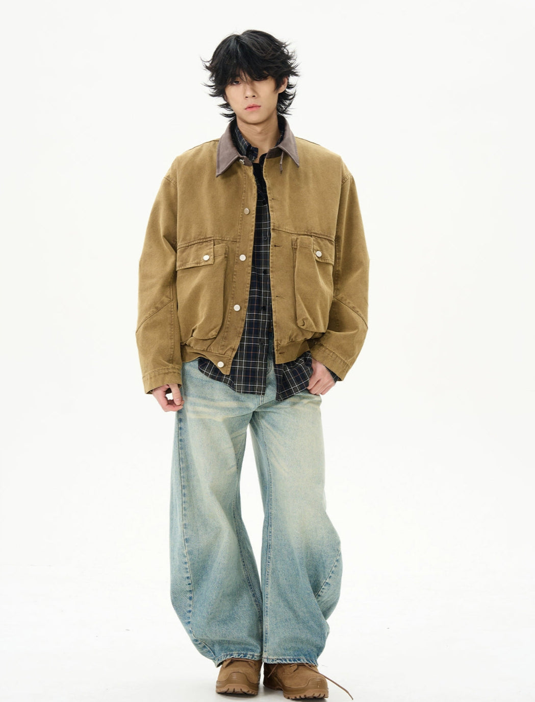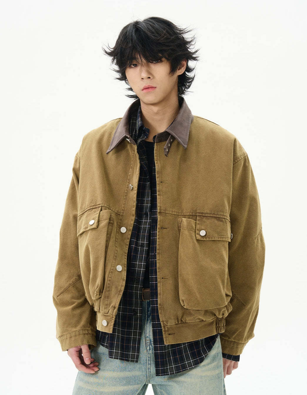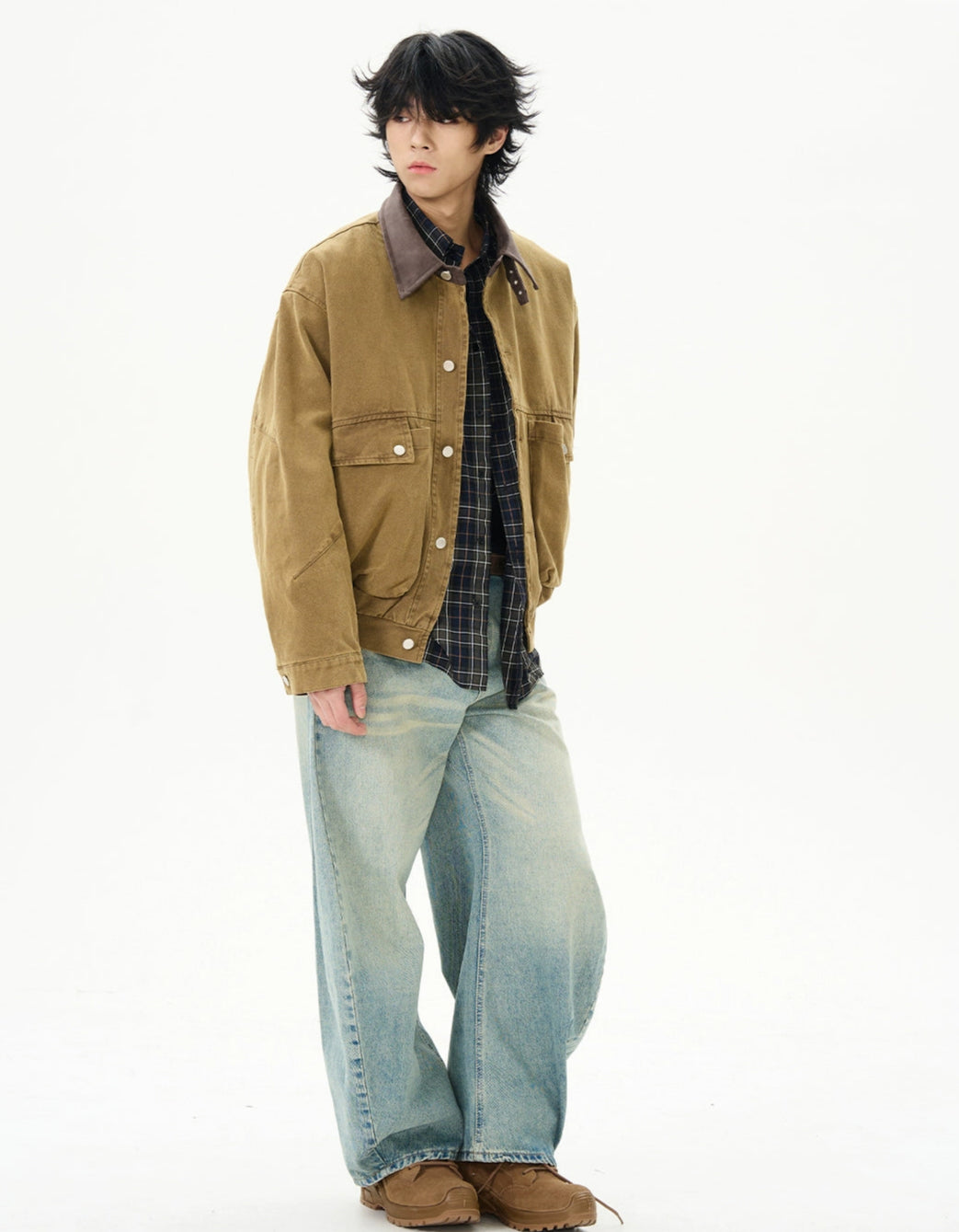The Oversized Worker Button Jacket with Contrast Collar strikes the perfect balance between rugged workwear aesthetic and laid-back, contemporary style.