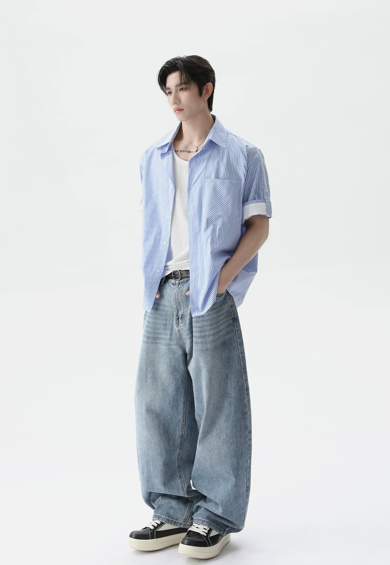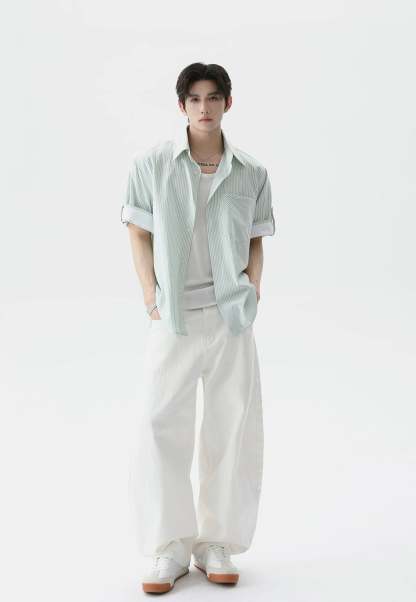 The subtle pinstripe pattern and contrast cuff inner lining add a clean edge that works with the shirt’s laid-back, oversized silhouette. Crafted with attention to texture and comfort, this shirt blends breathable combed cotton with polyester for a lightweight but durable fit that hangs just right.