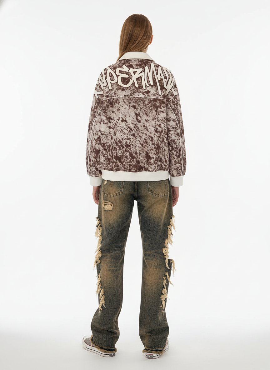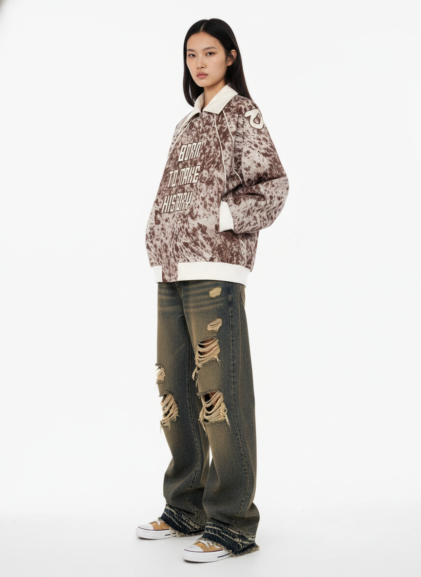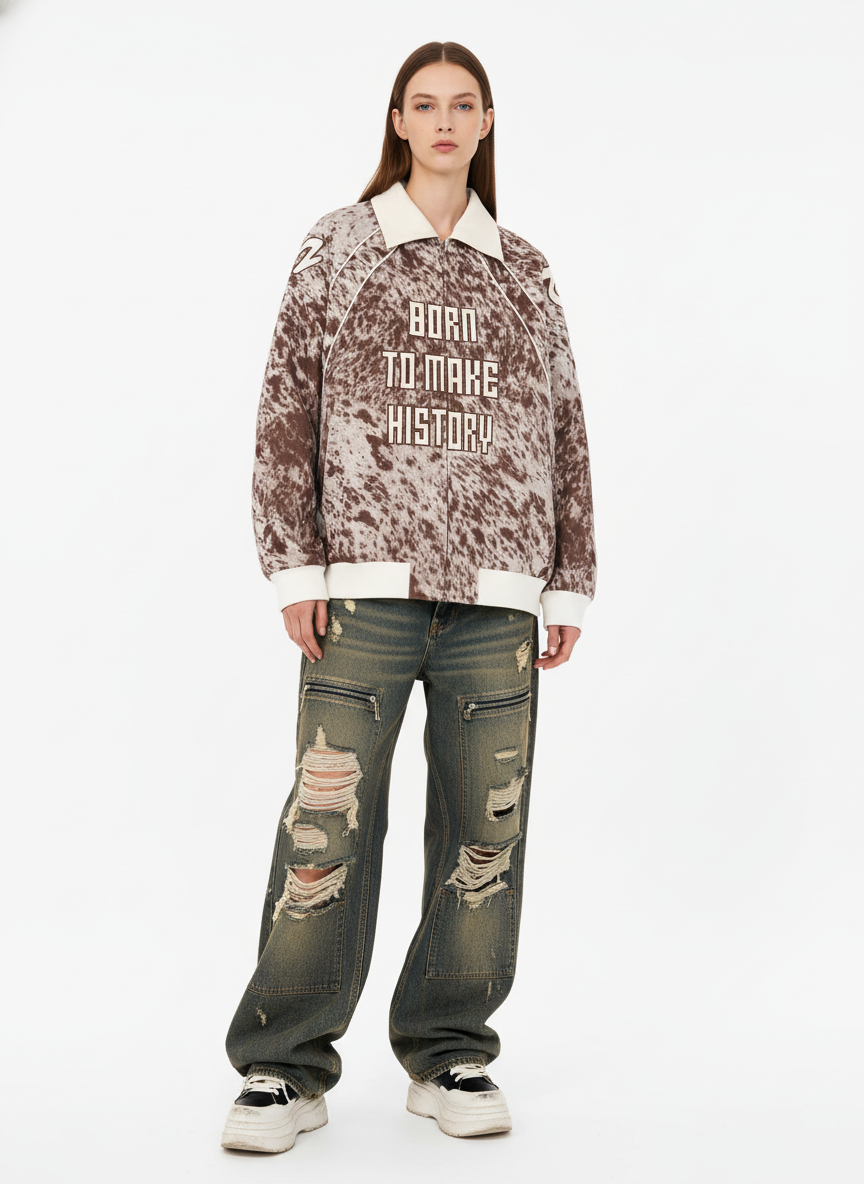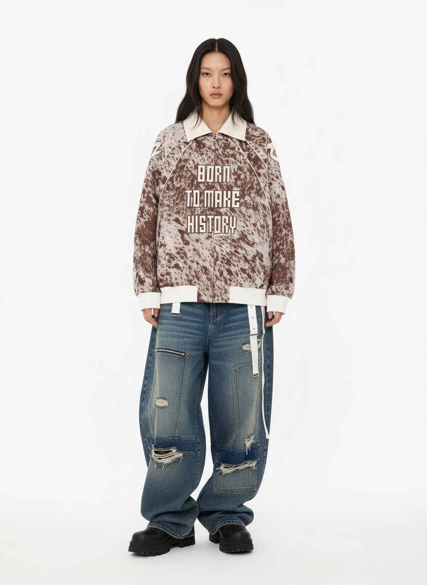 • Design Elements: Bold "Born to Make History" text print, cow print pattern, relaxed fit jeans
