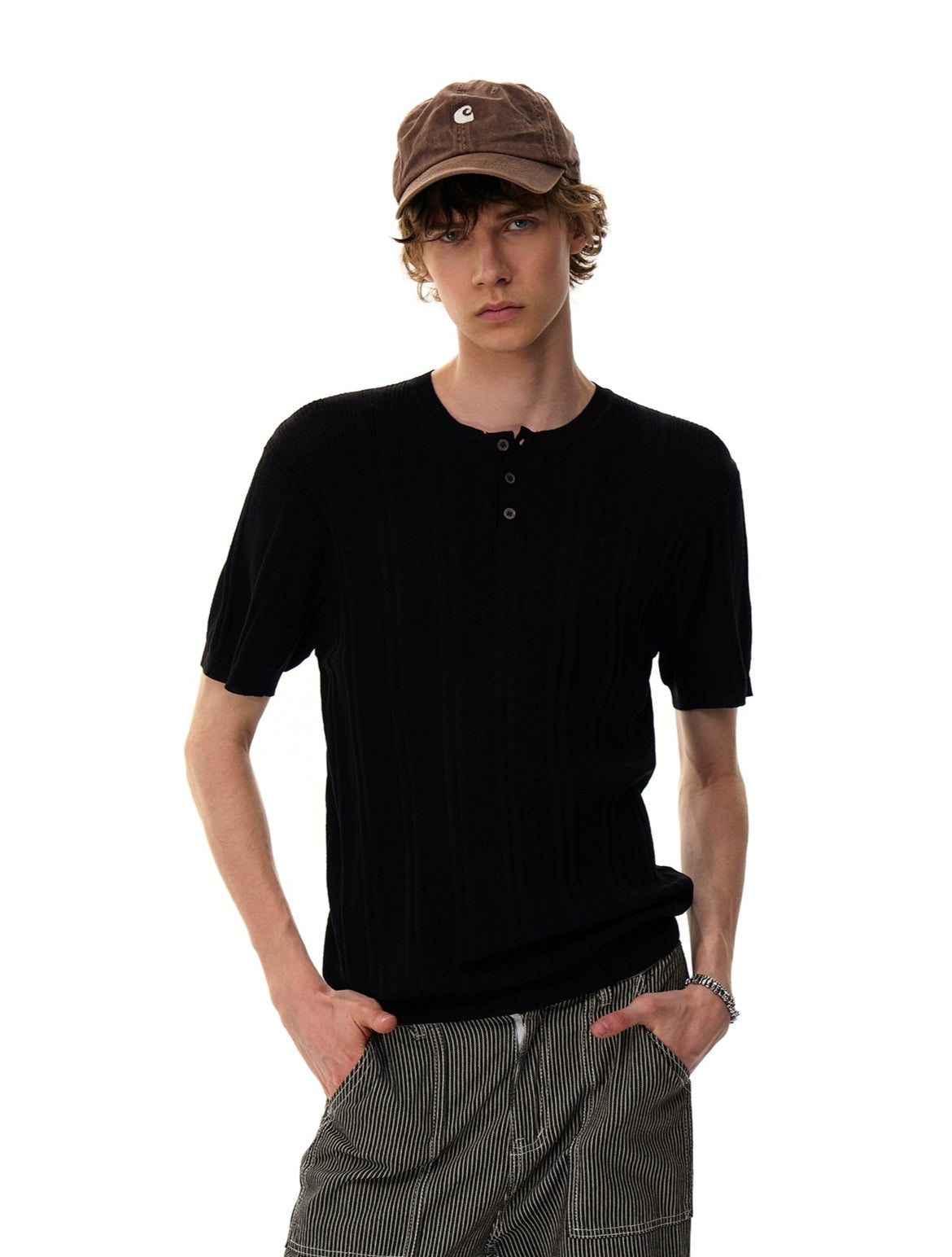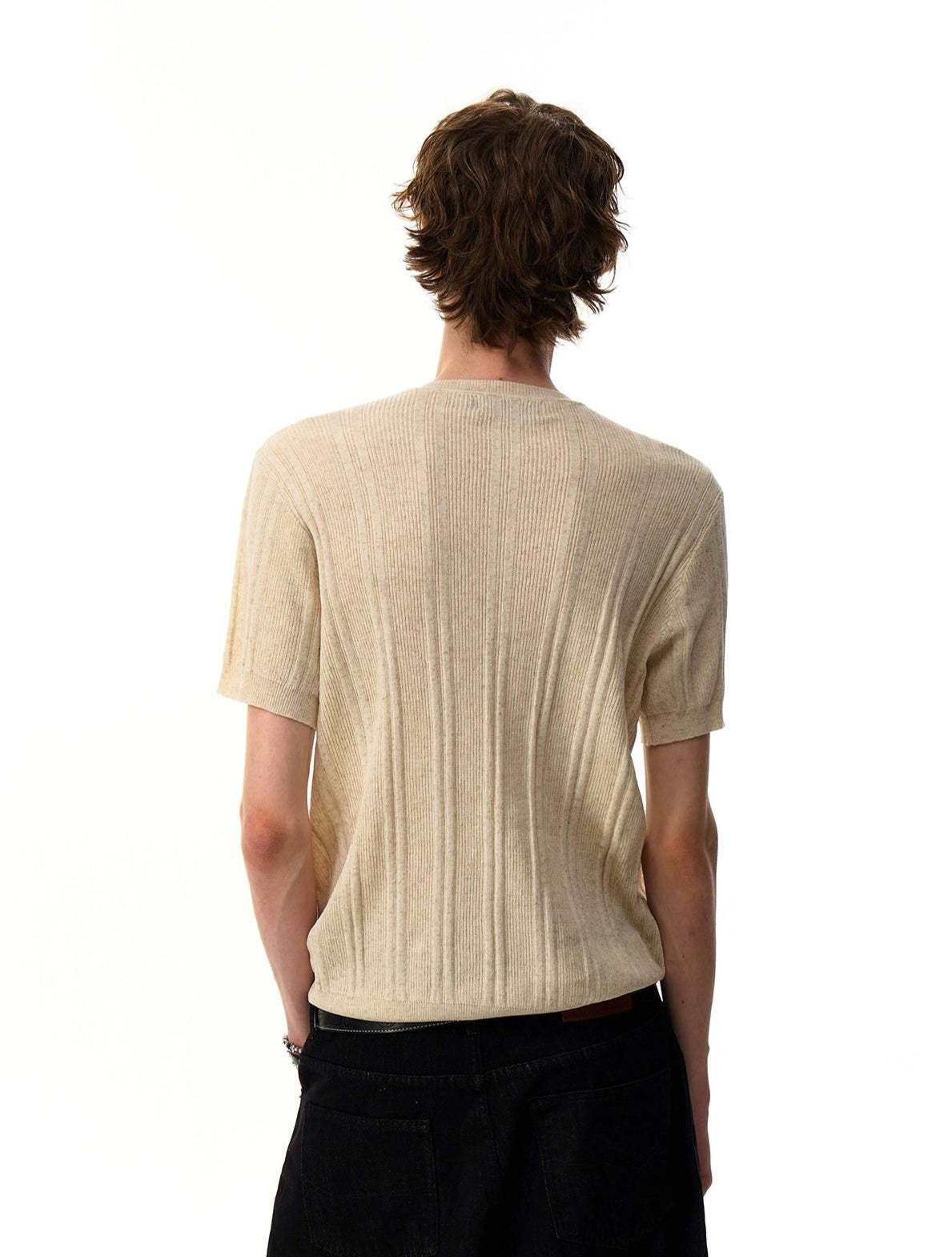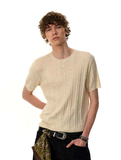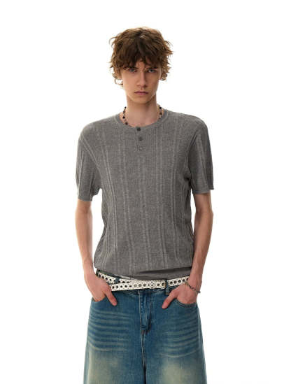 The Ribbed Knit Half Button Short Sleeve Shirt stands out with its subtly structured texture and laid-back finish, offering a clean look with just enough edge to stay interesting.