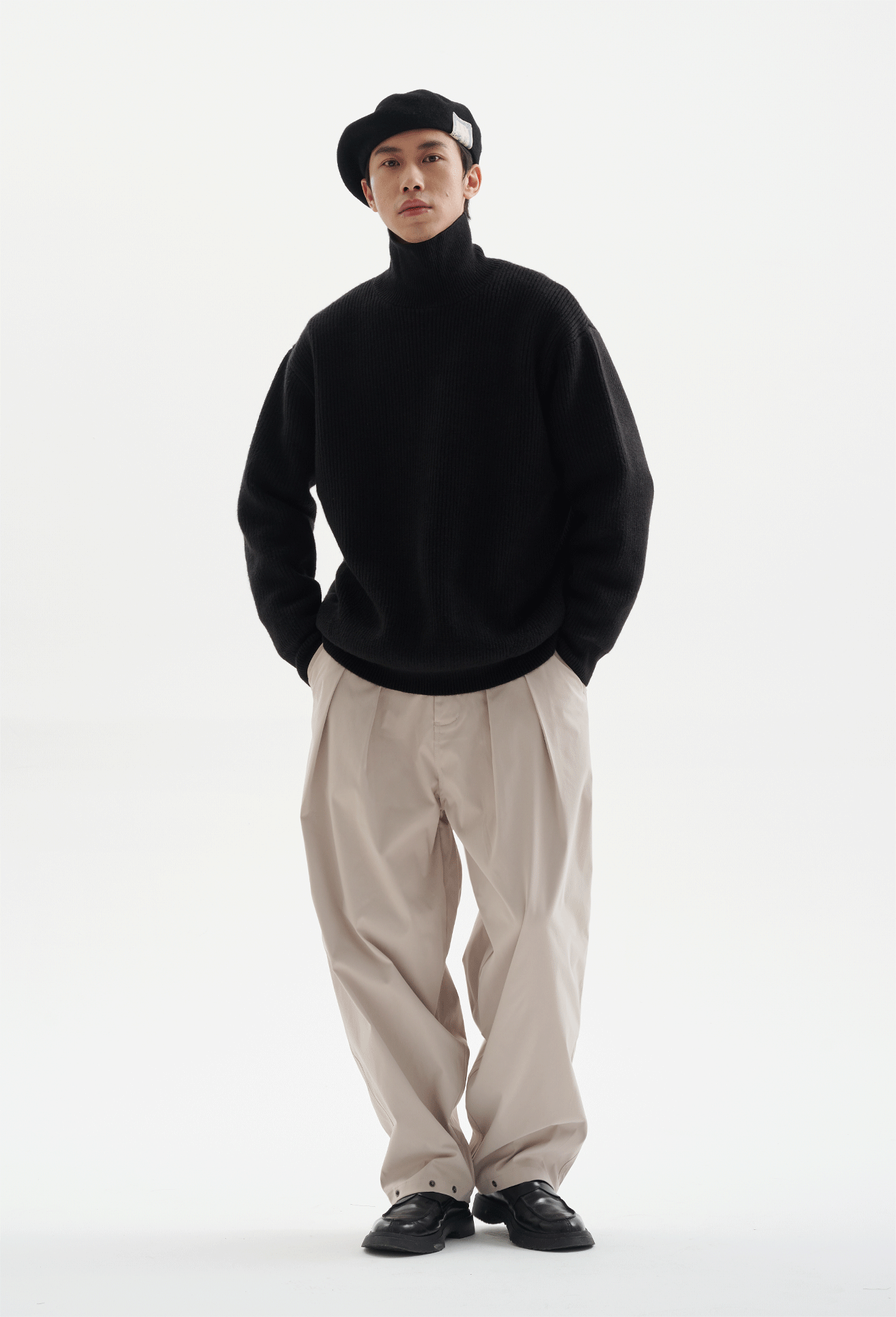 Crafted from premium synthetic fibers, this heavyweight 830G knit sweater boasts a tactile ribbed texture, providing a cozy, soft-to-touch experience. A relaxed, oversized cut merges with the distinctive Japanese-inspired high funnel neck for a harmonious blend of nonchalance and sophistication, ready to layer over any ensemble for added warmth and detail.