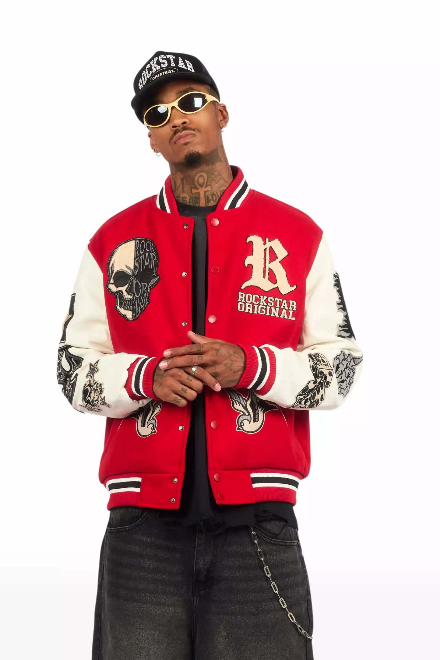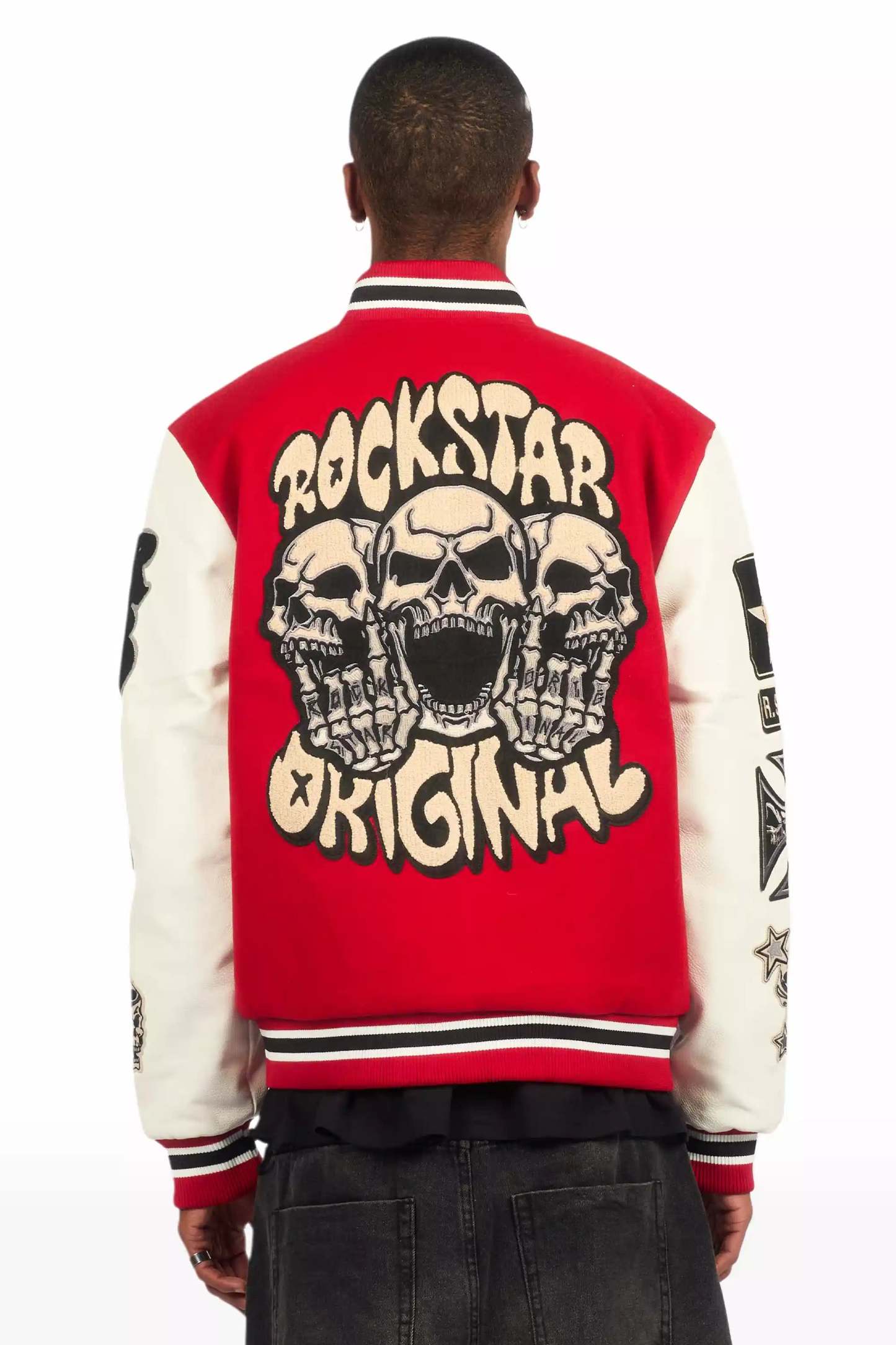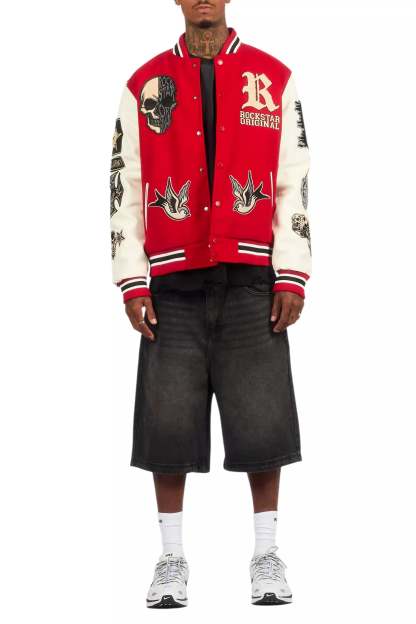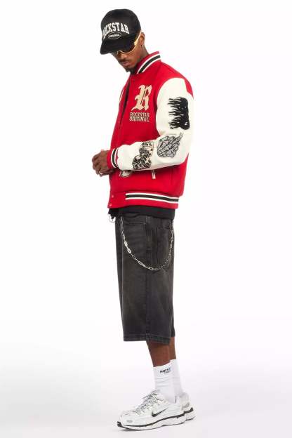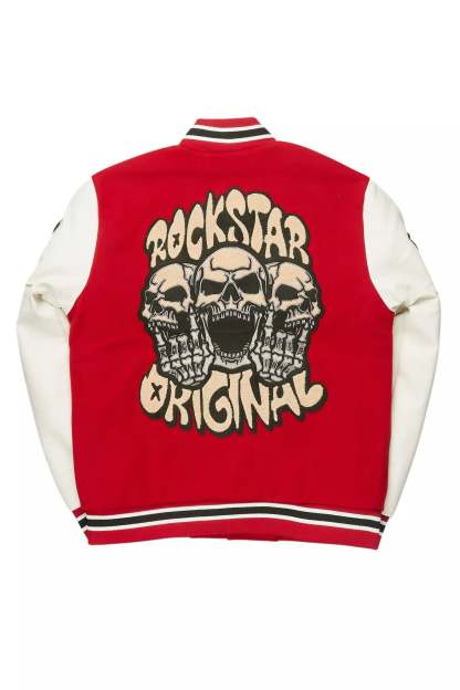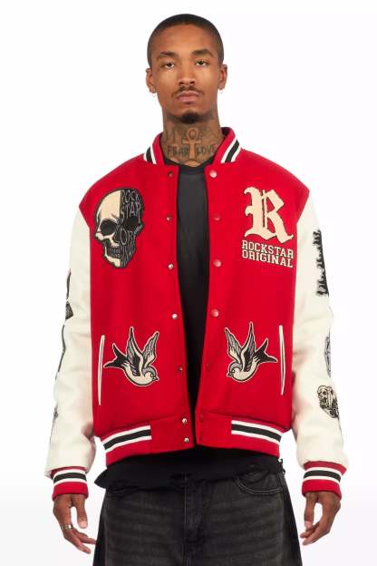 A collegiate varsity jacket for men in red. Designed with an ultra soft fleece body and contrast faux leather sleeves for a dope outerwear style.