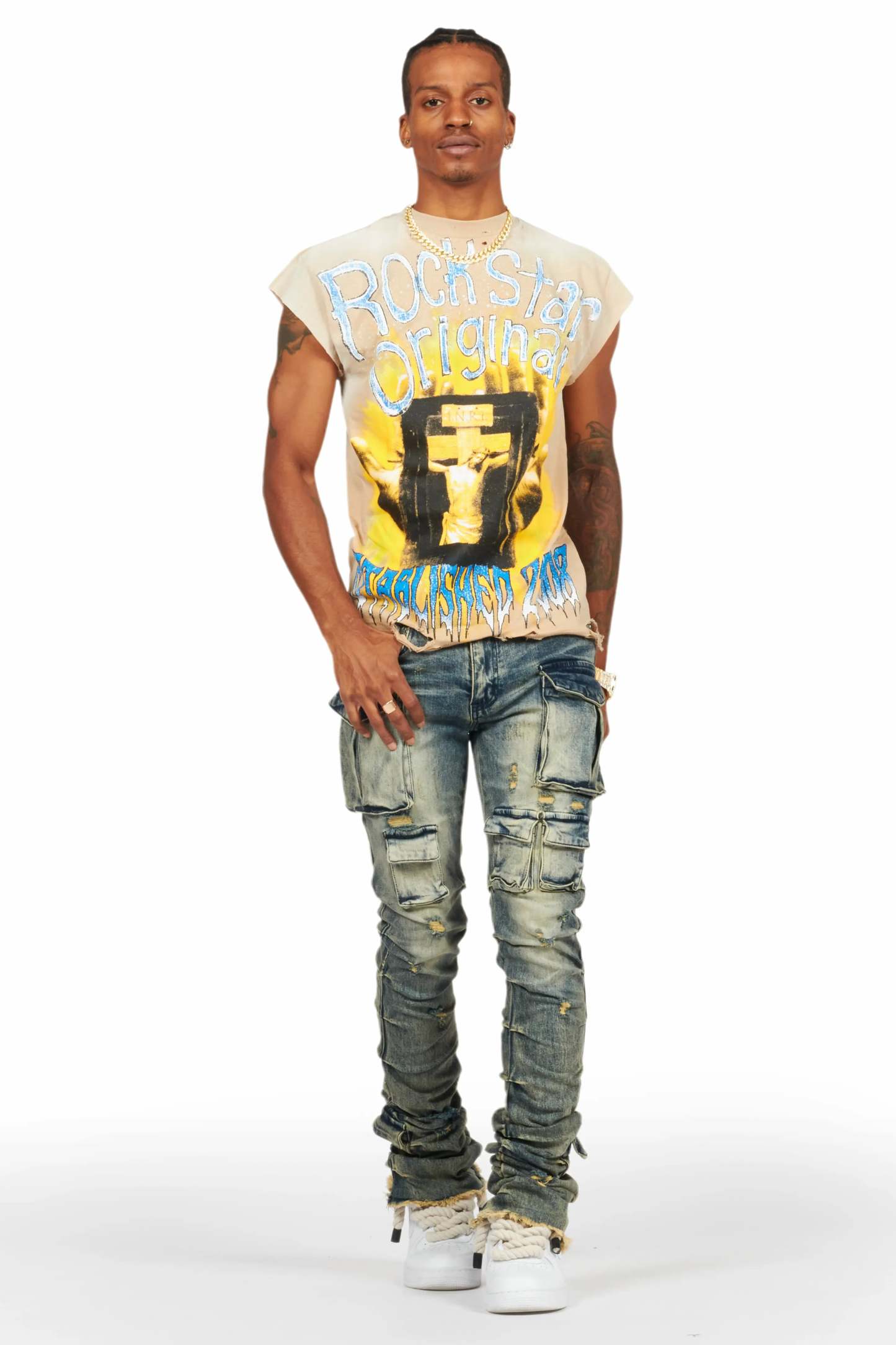 An urban stack denim cargo jean for men in tint blue. Designed with organic cotton and extra long legs for an essential streetwear style.
