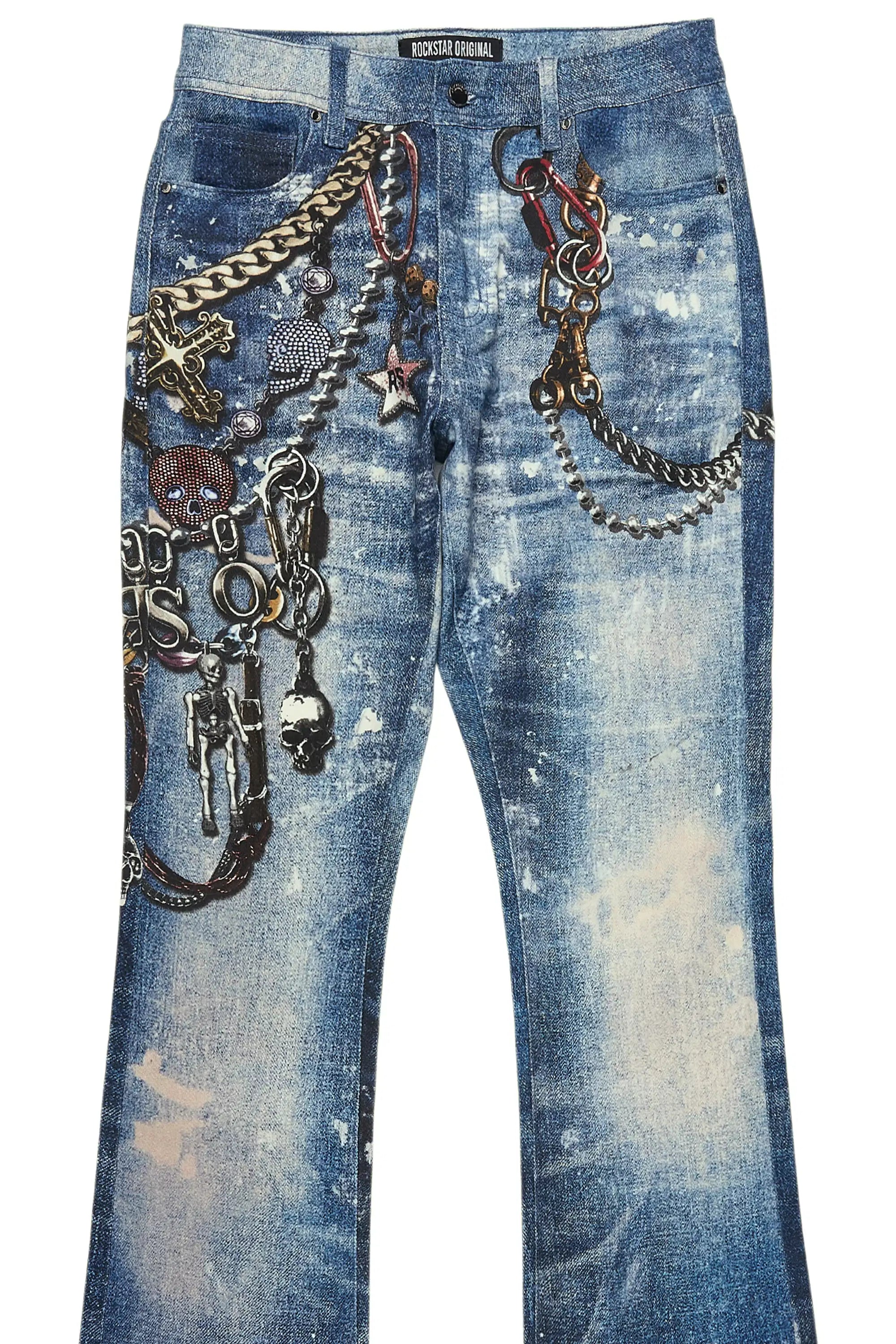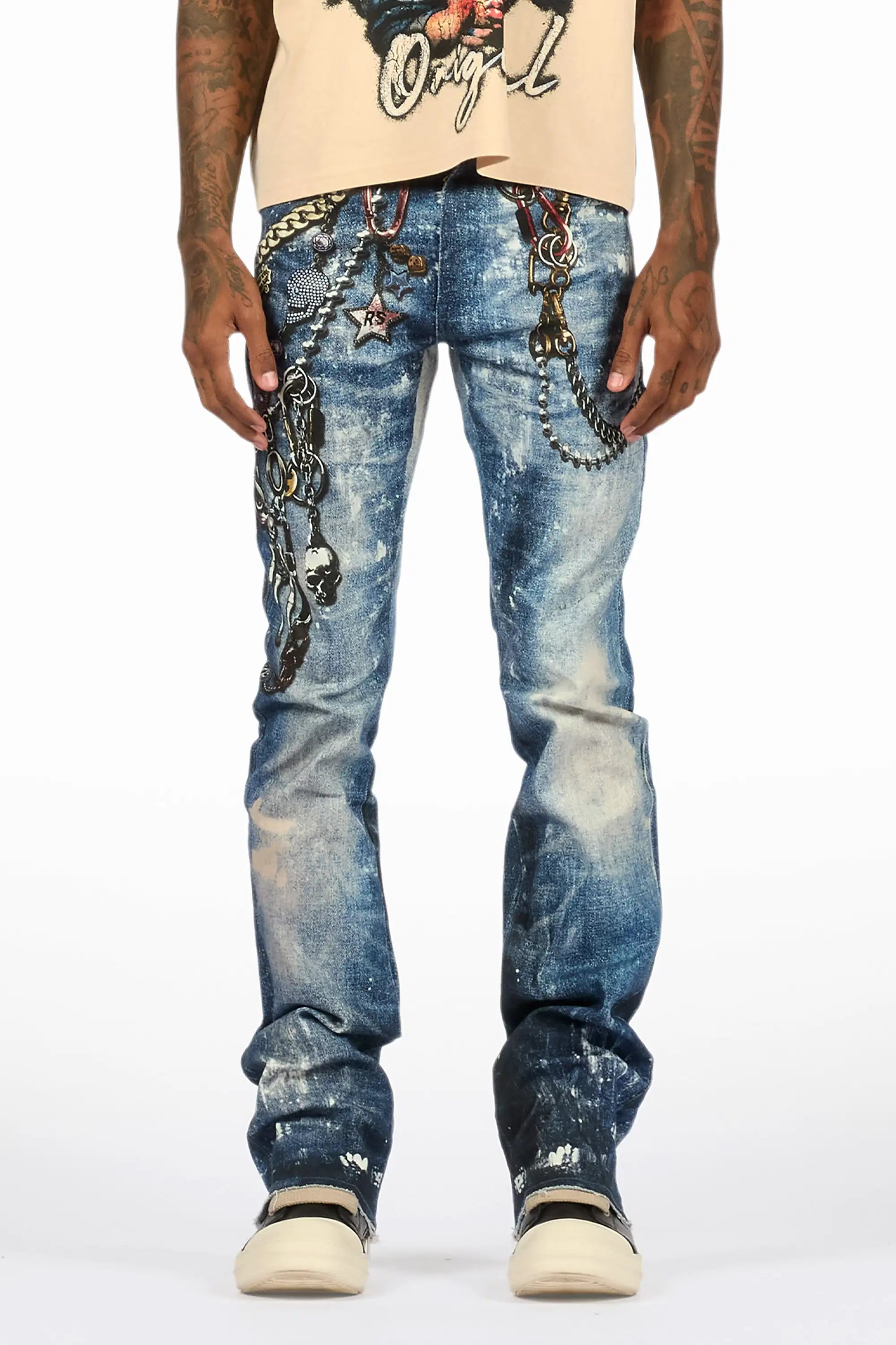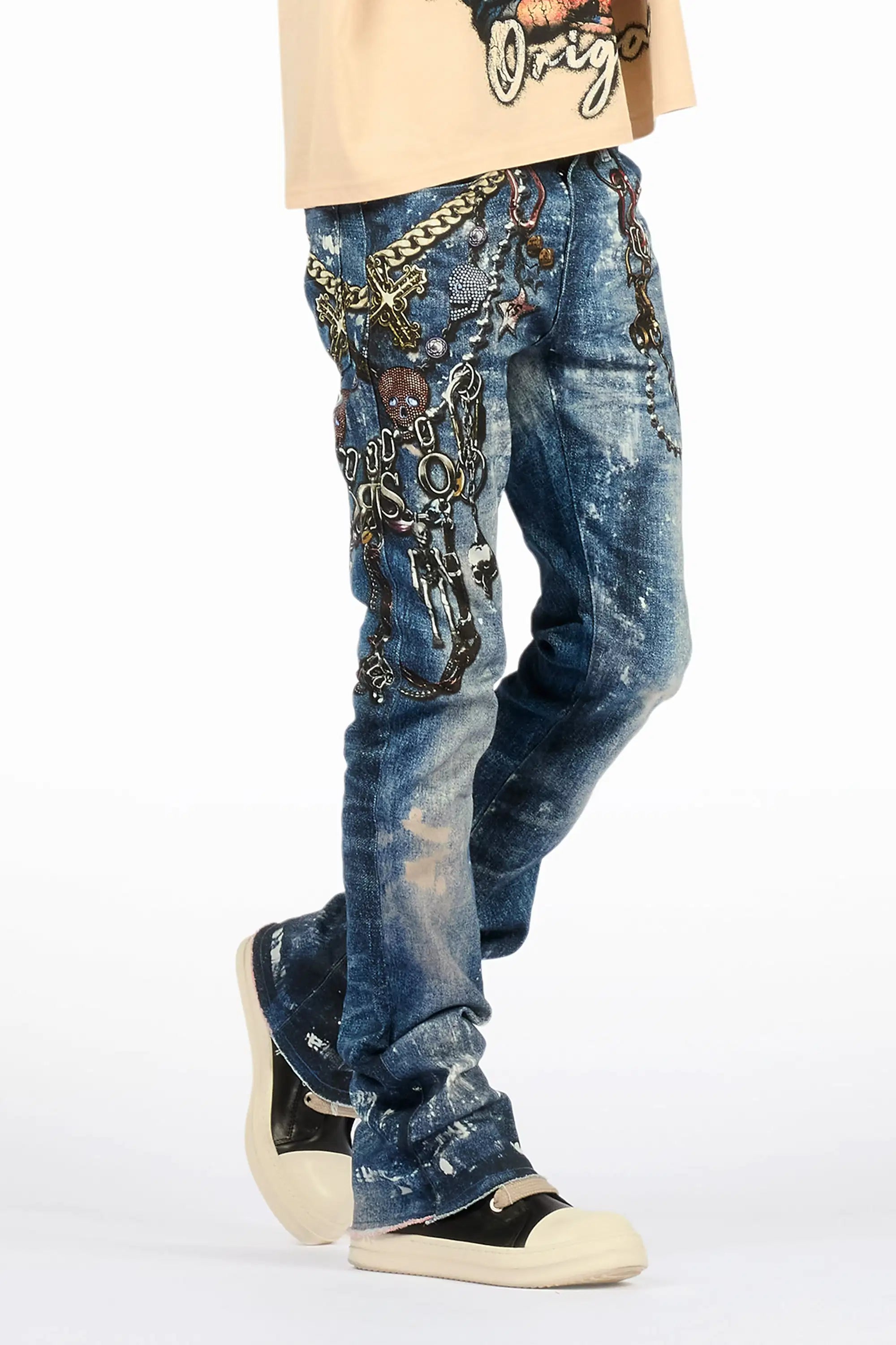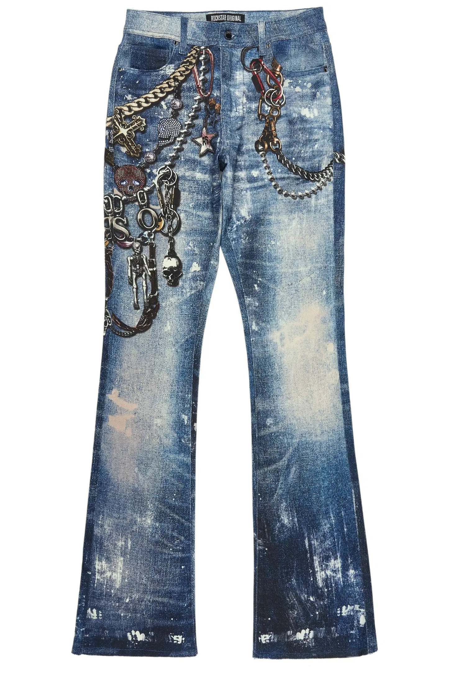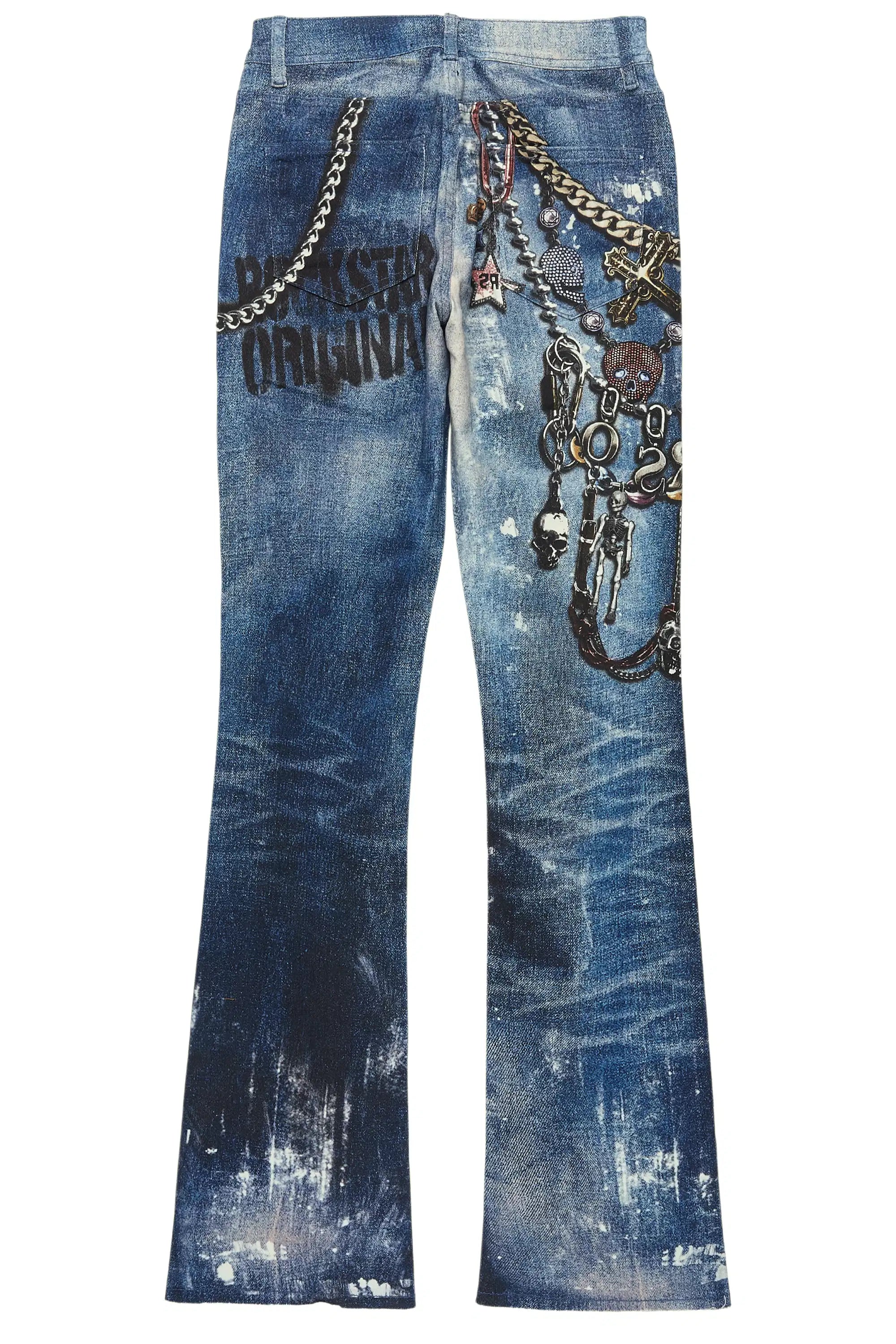 An urban stacked flare denim jean for men in blue. Designed with organic cotton and extra long legs for a must-cop streetwear staple piece.