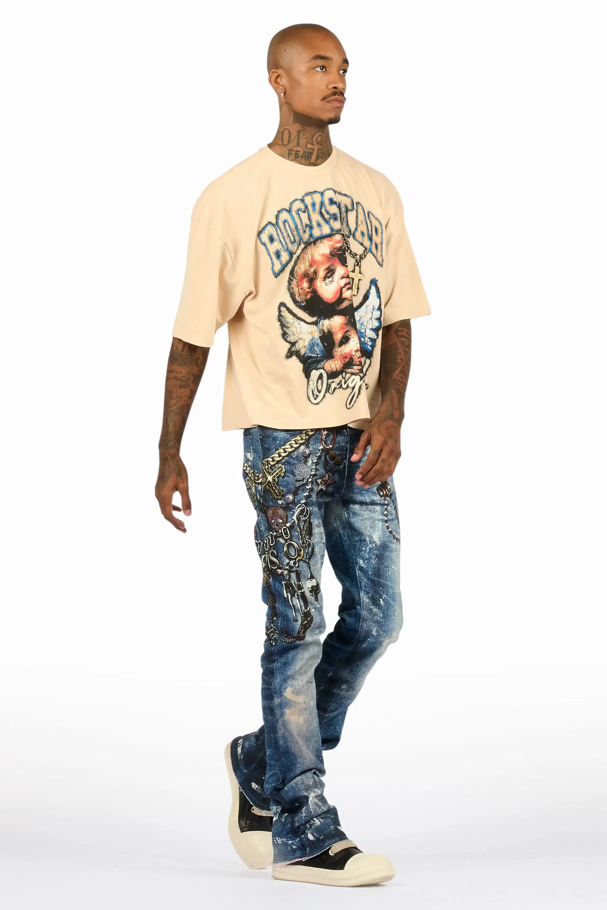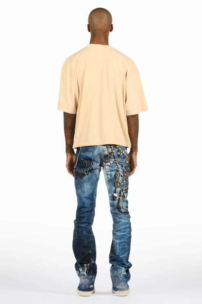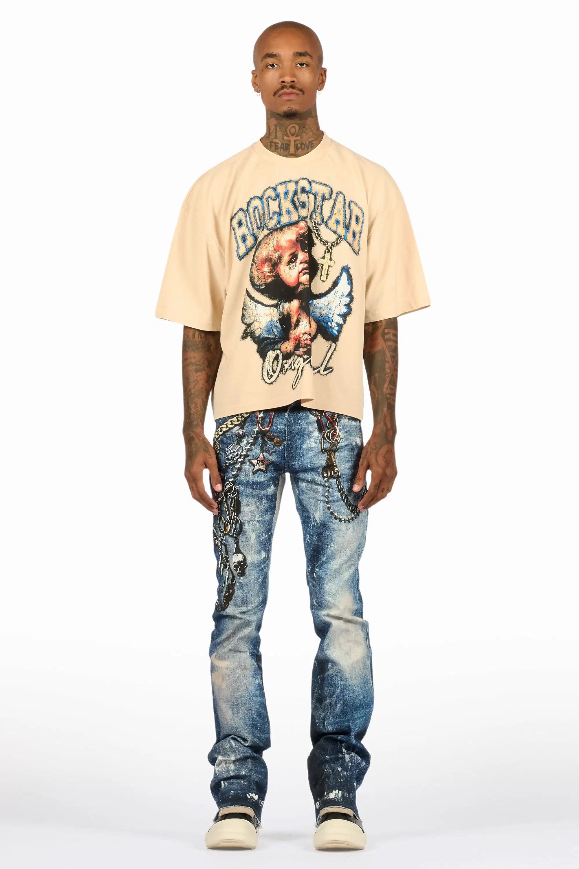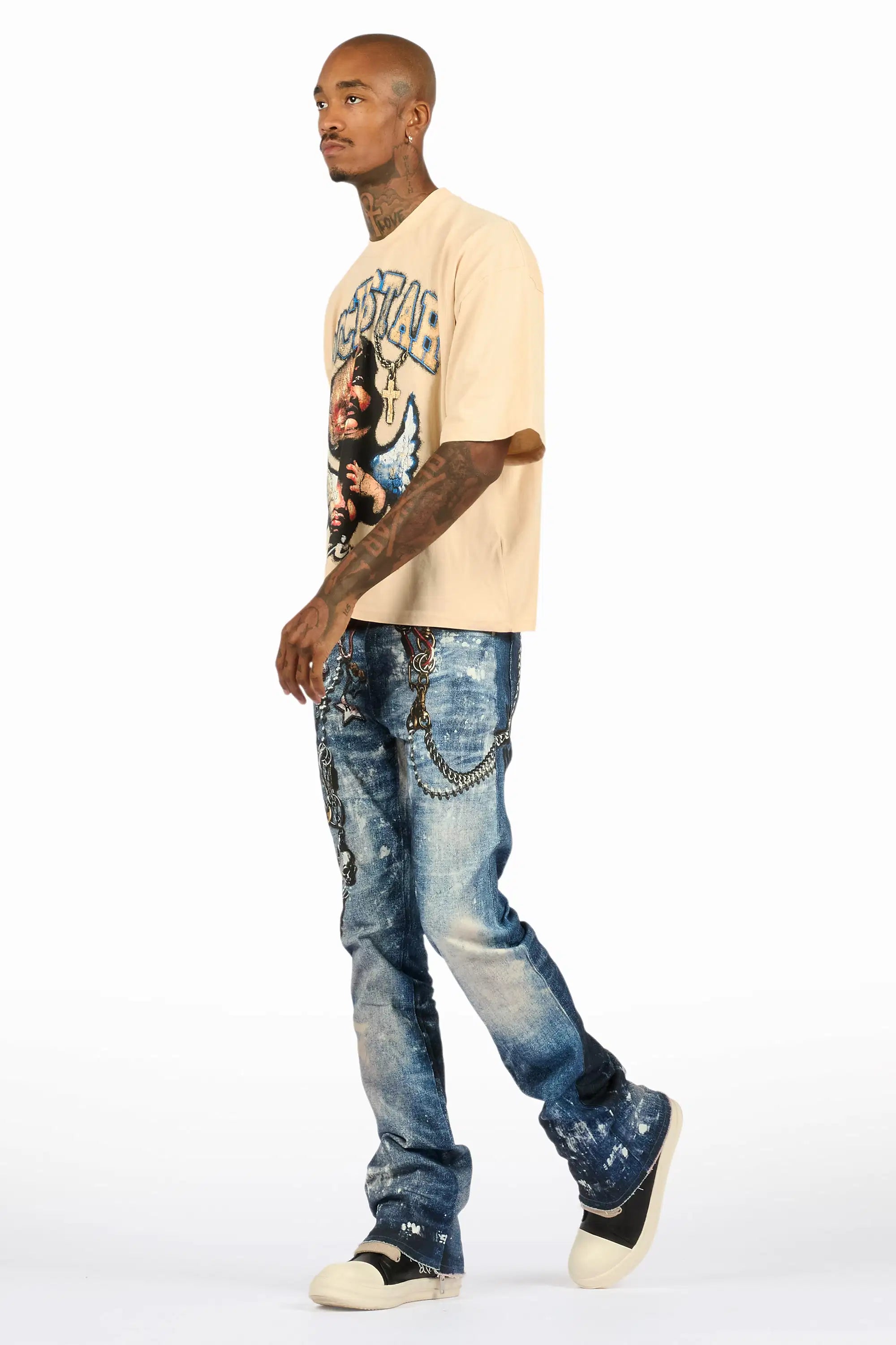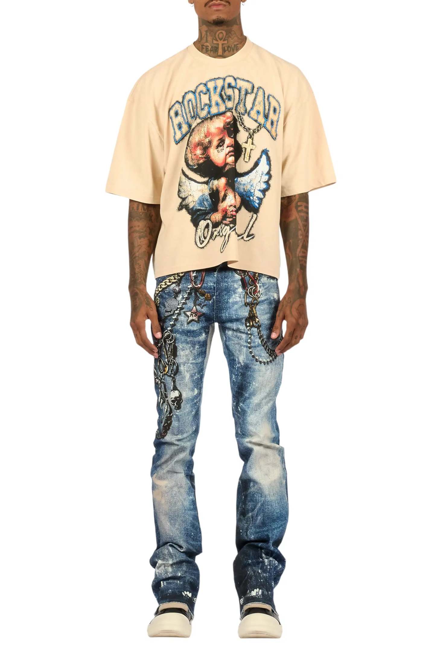 An urban stacked flare denim jean for men in blue. Designed with organic cotton and extra long legs for a must-cop streetwear staple piece.