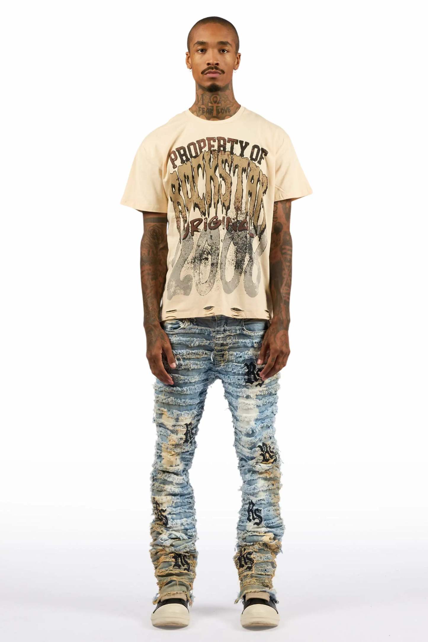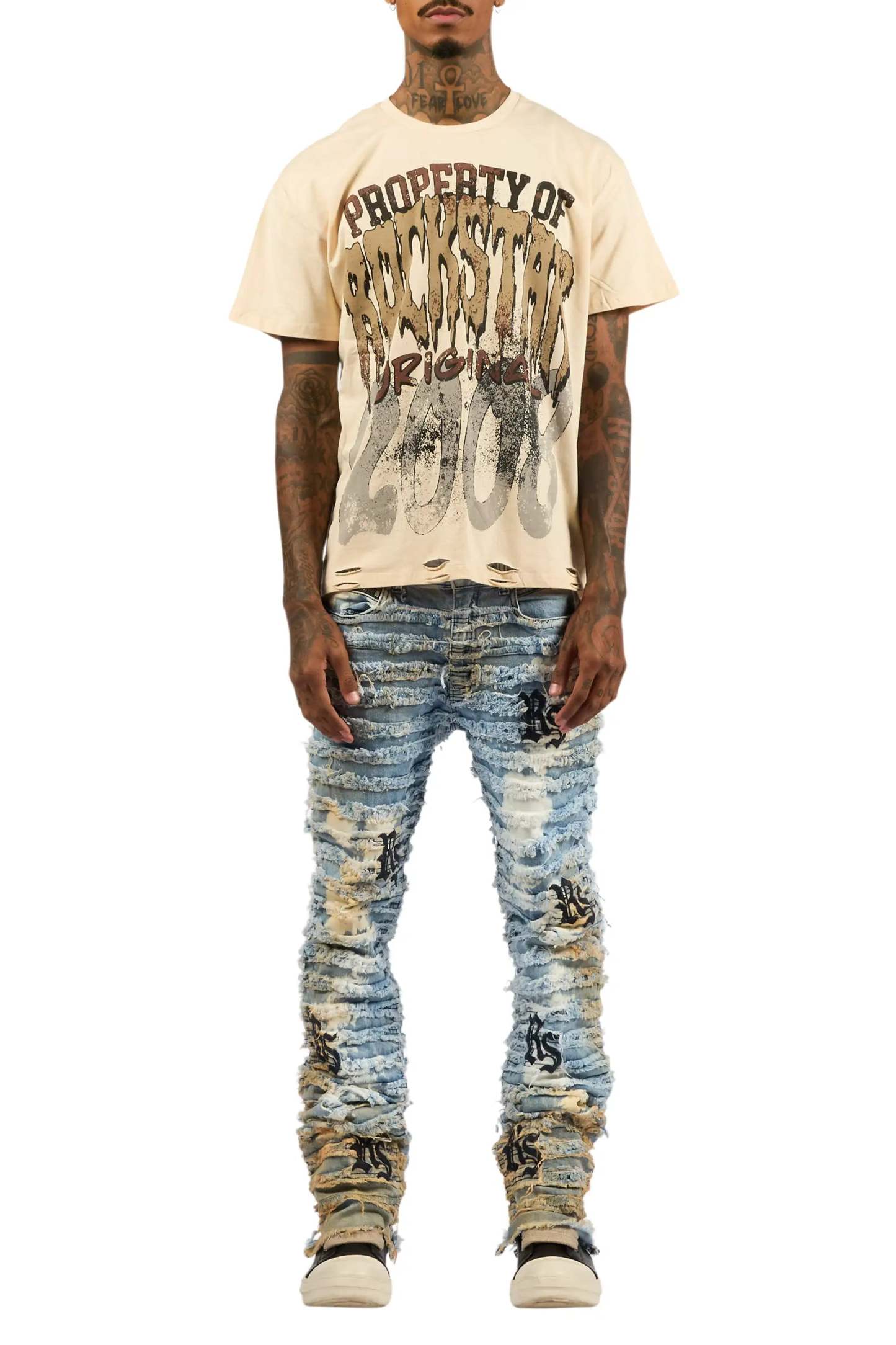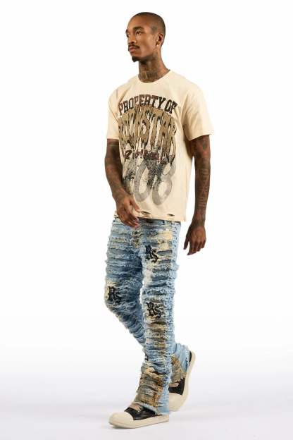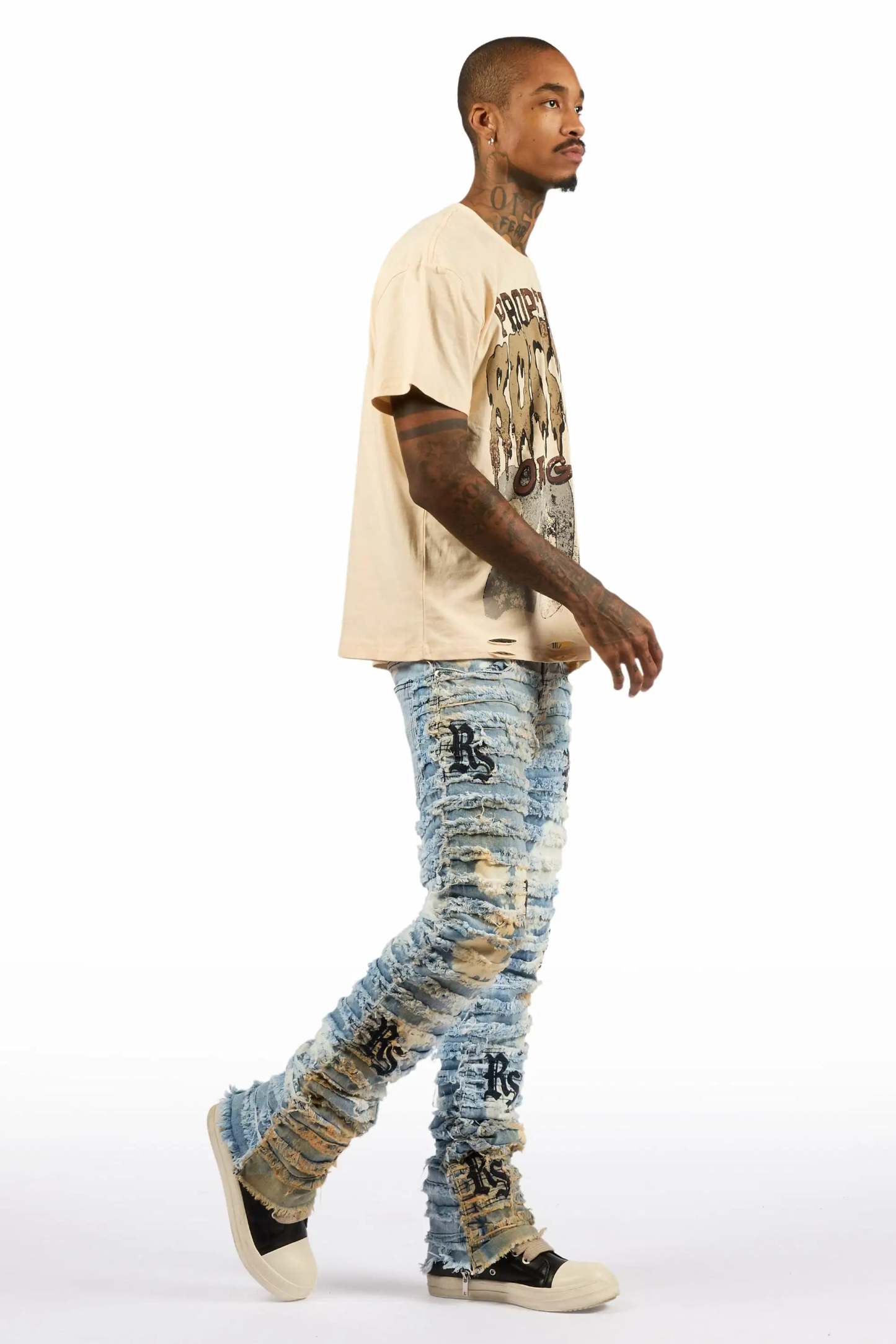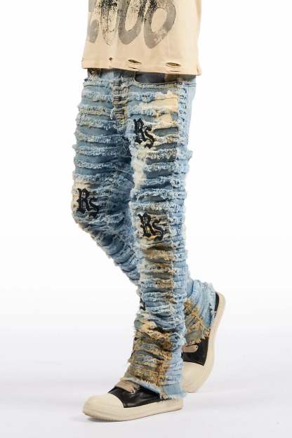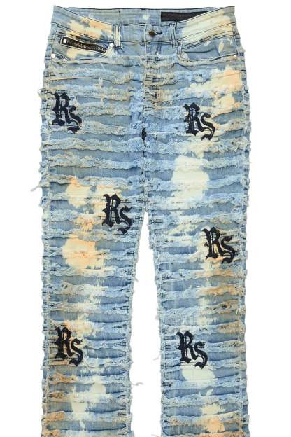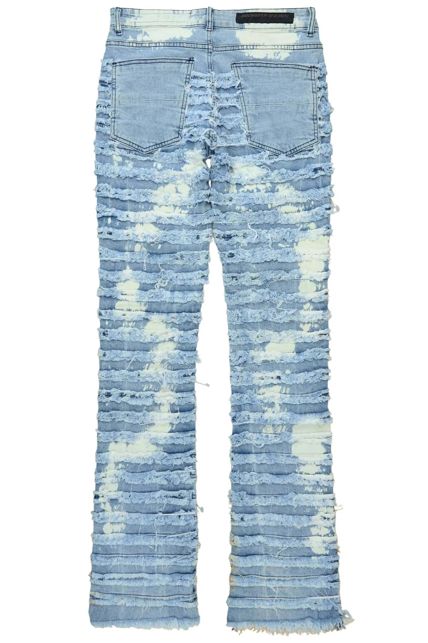 An urban stacked denim jean for men in blue. Designed with organic cotton and a modern bootcut flare fit for a must-cop staple piece.