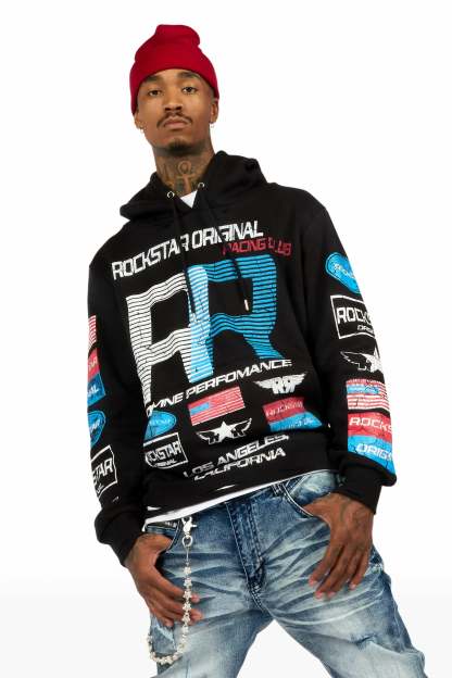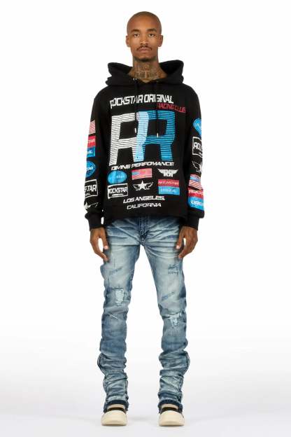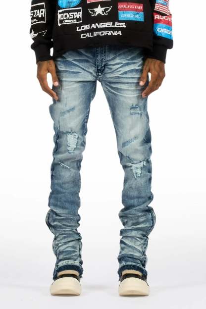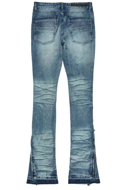 A basic urban stacked flare jean for men in dark blue. Designed with organic cotton and custom detailing for an essential denim style.