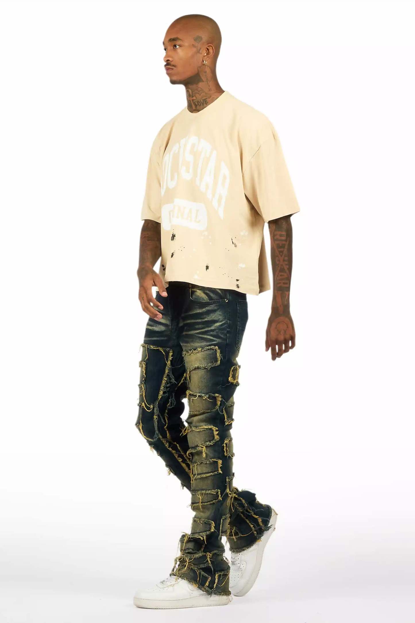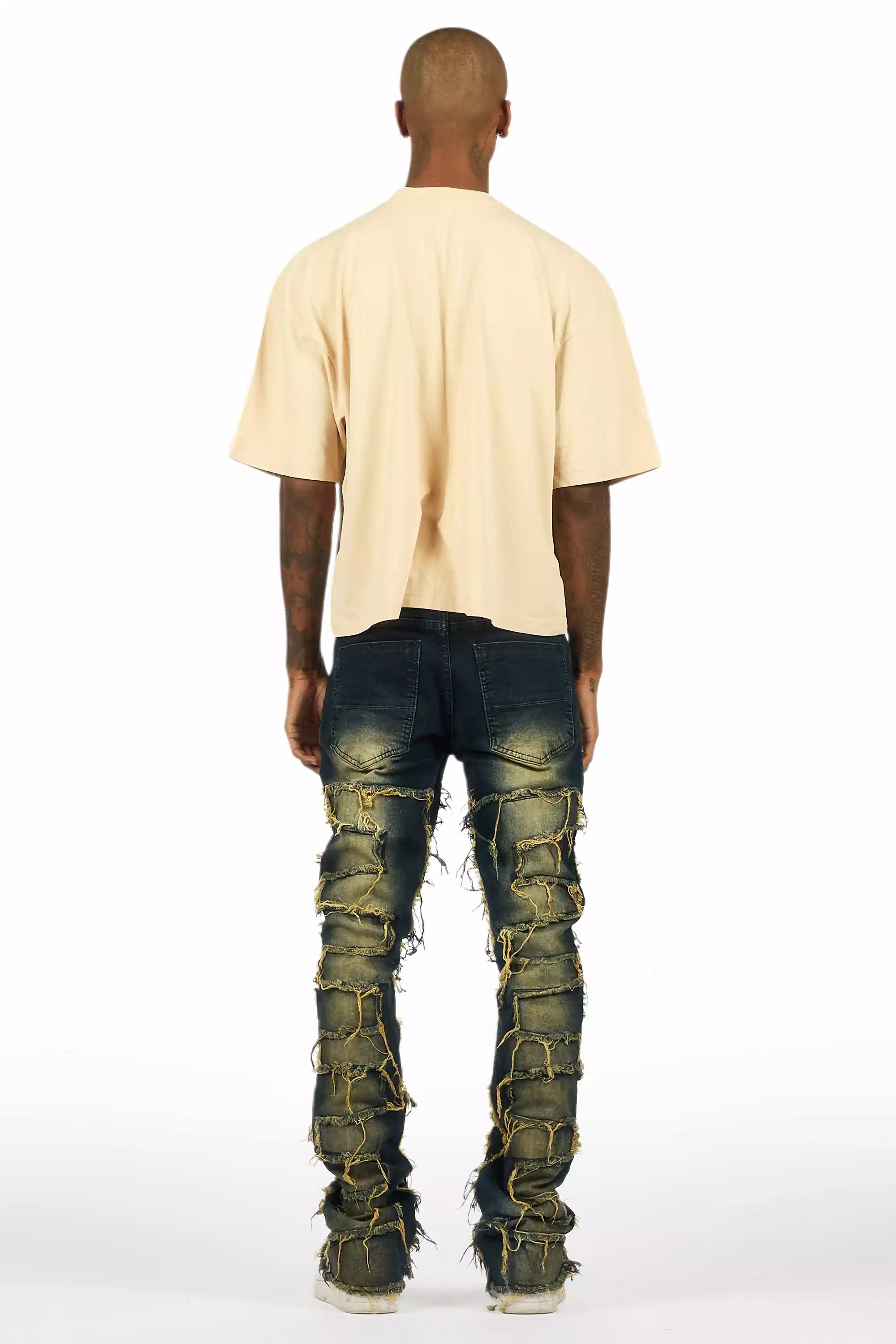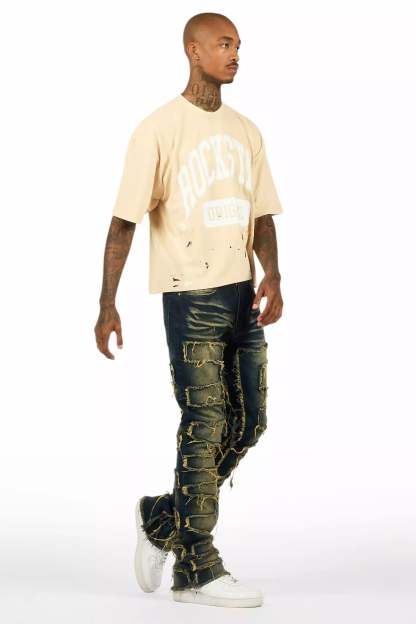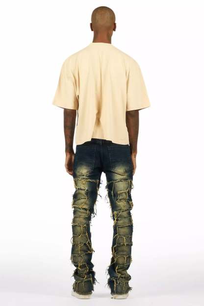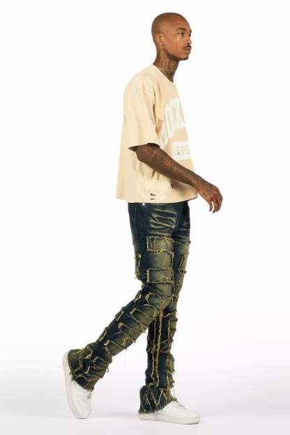 An organic cotton denim jean for men in dark blue. Designed with patterned stitching and a modern bootcut flare fit for a must-cop staple piece.