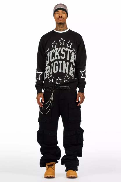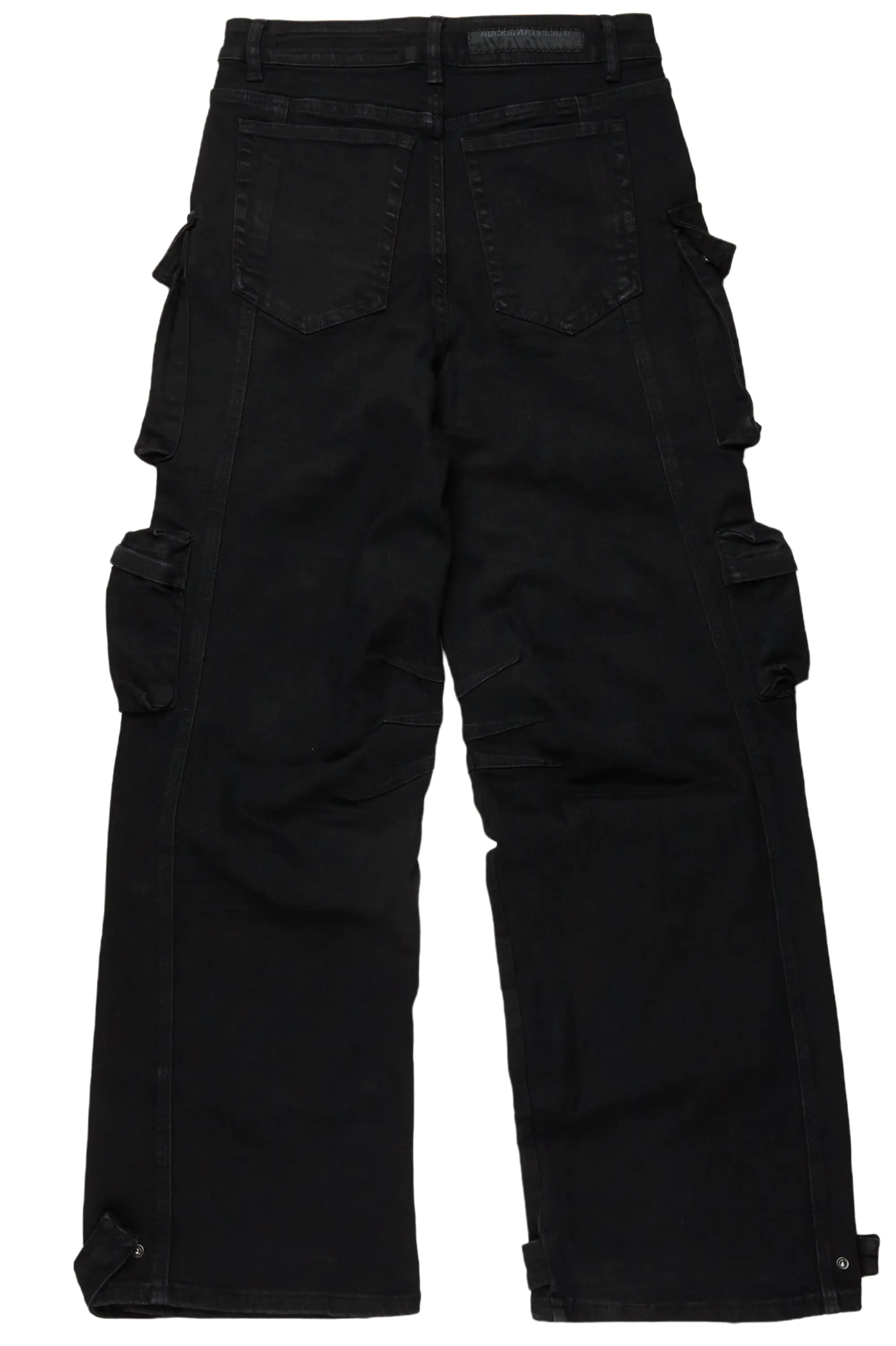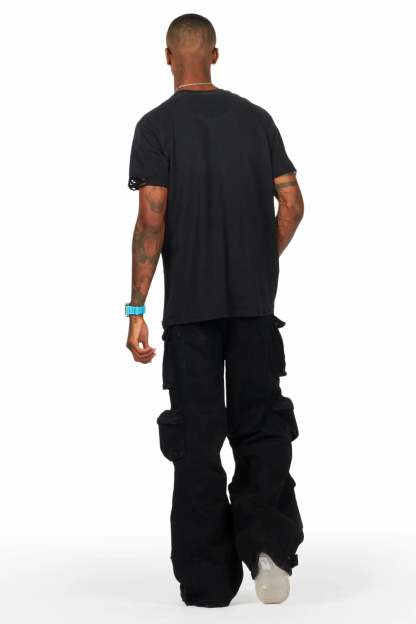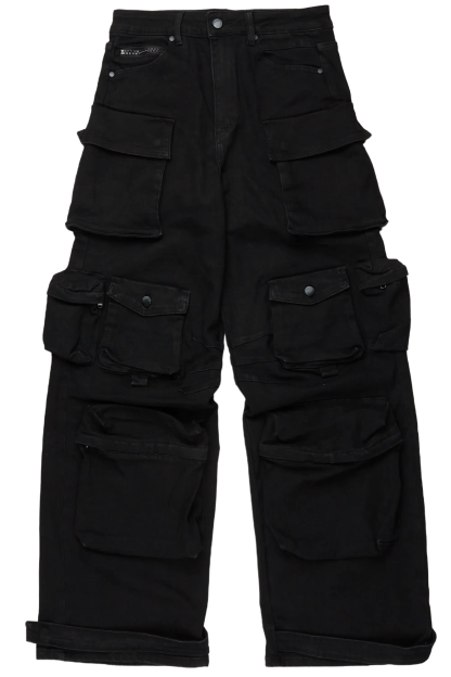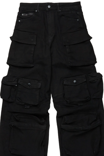 An urban baggy stack cargo jean for men in black. Designed with organic cotton and extra long legs for an essential streetwear style.