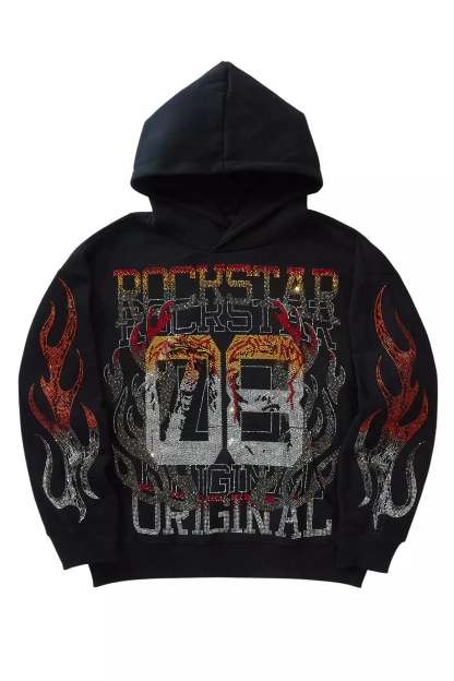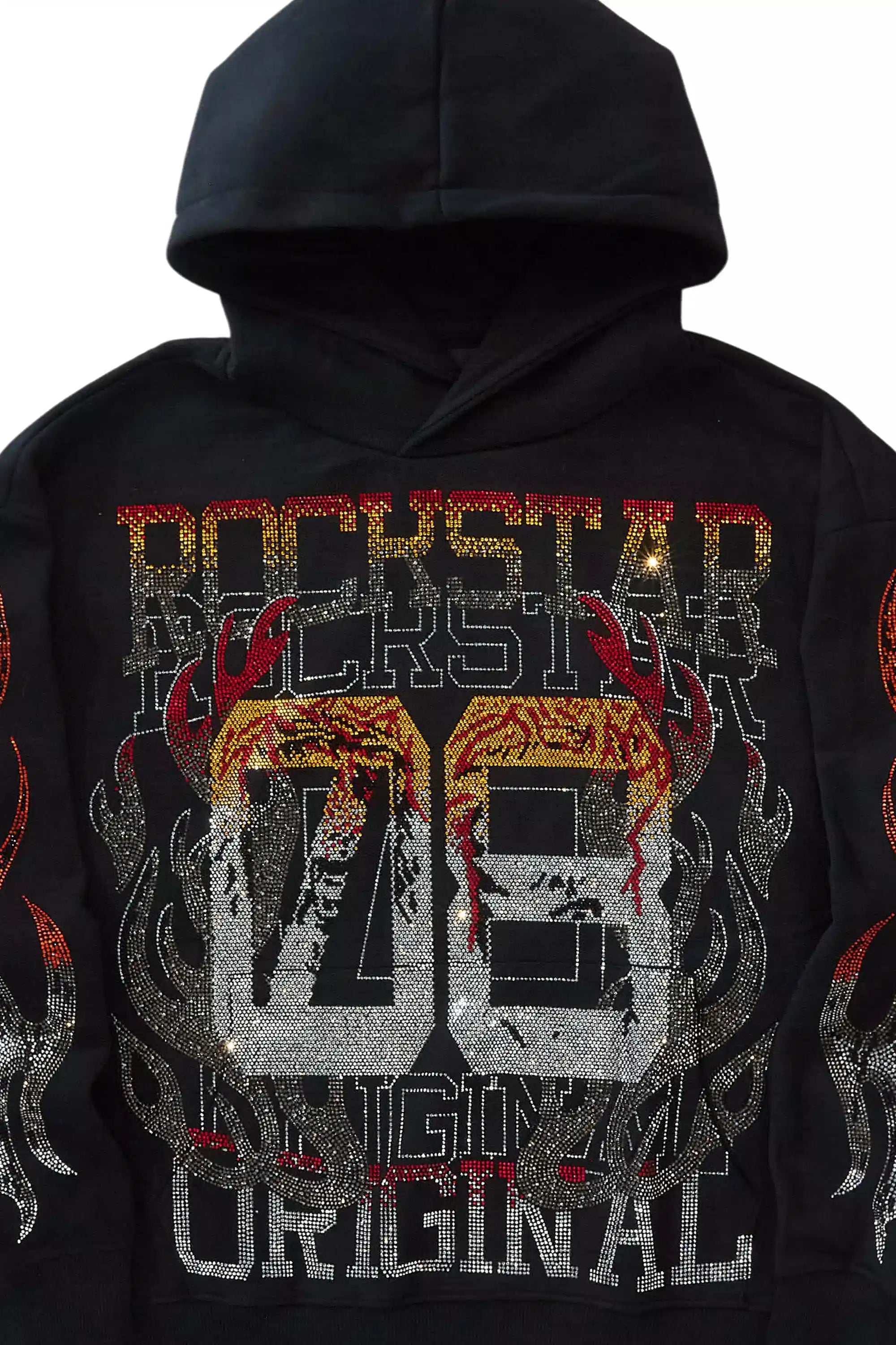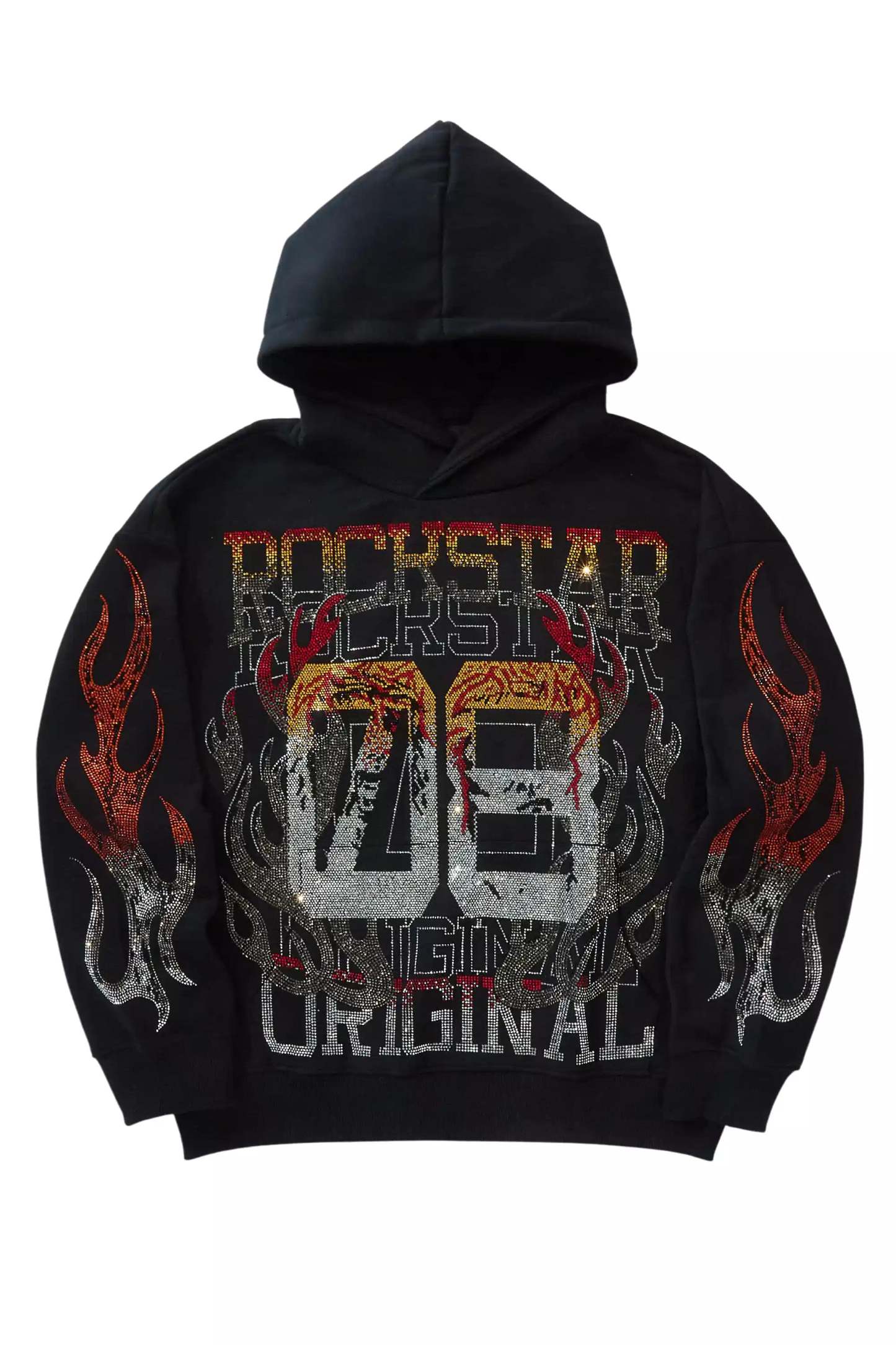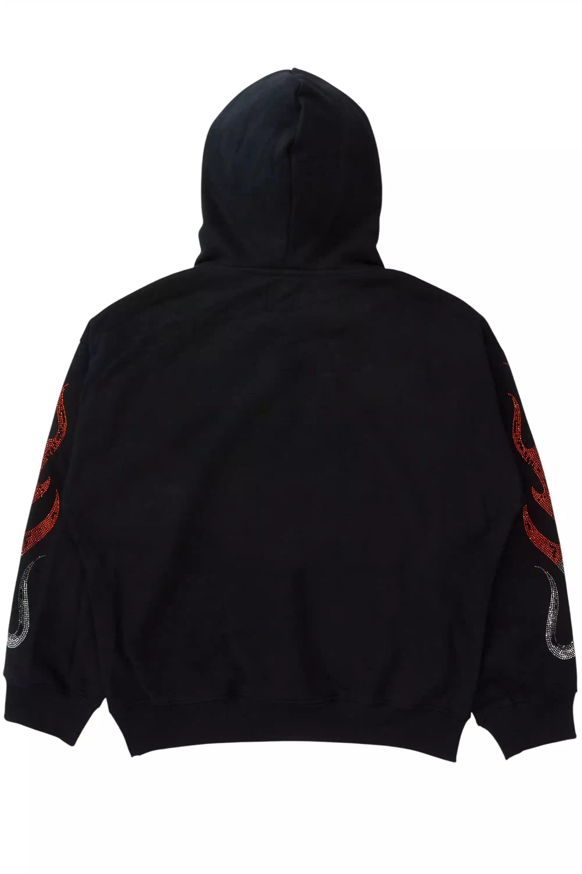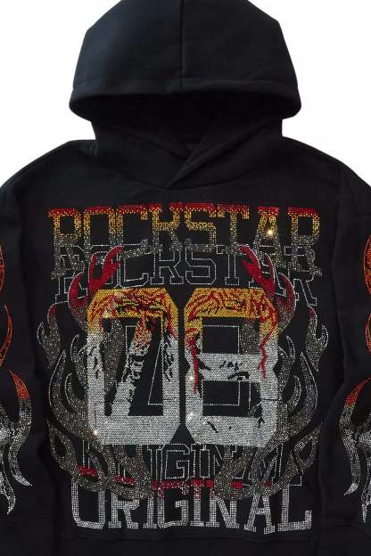 An urban streetwear hoodie for men in black. Designed with organic cotton and custom studded rhinestone detailing for a dope everyday style.