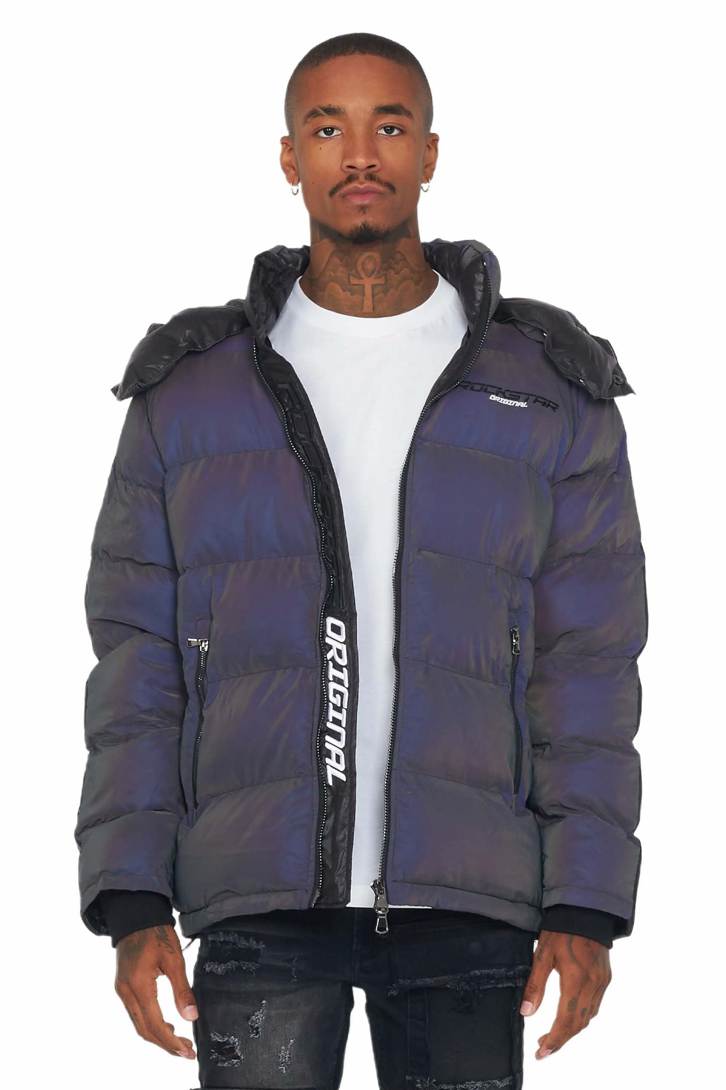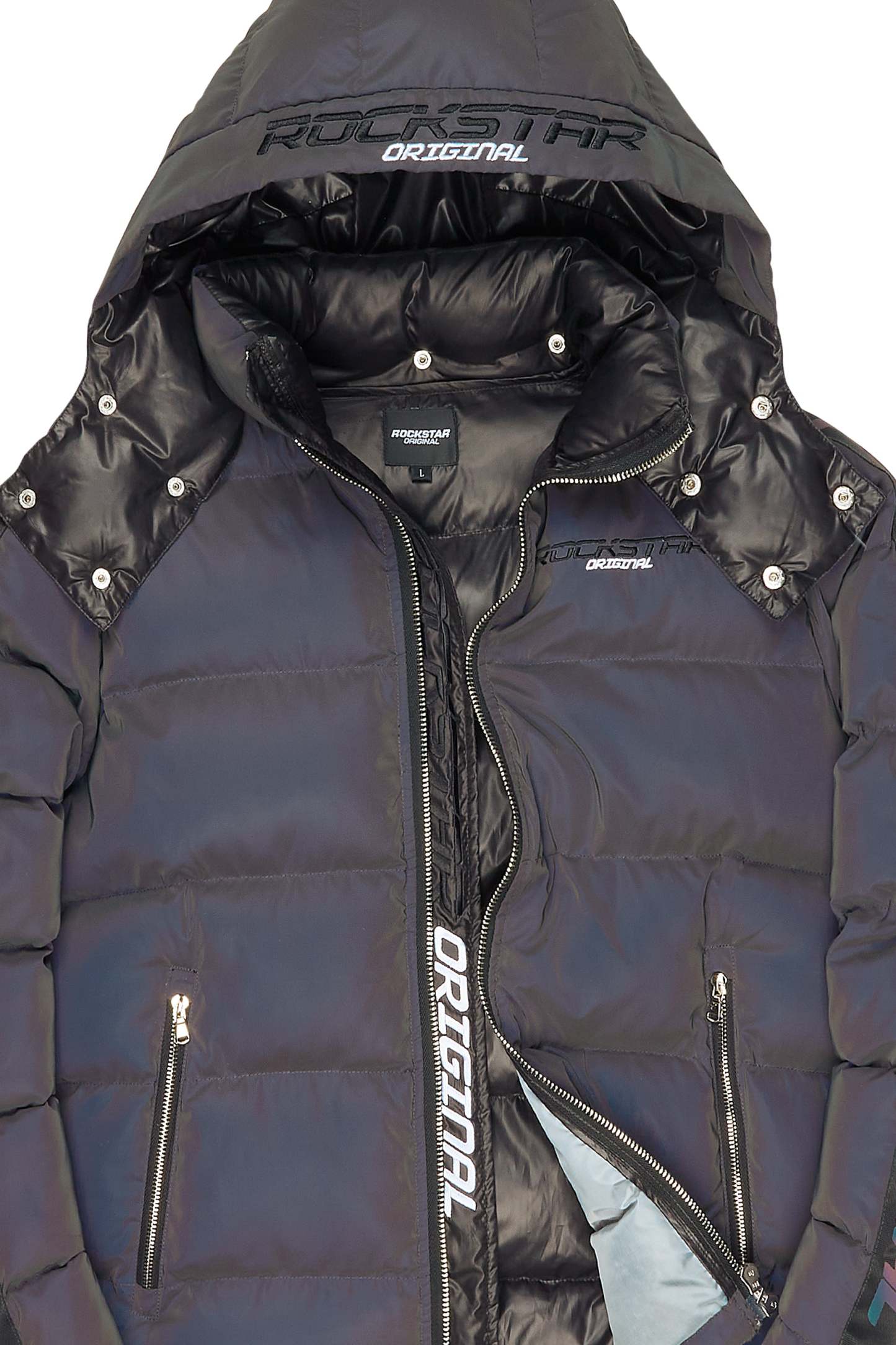 An urban quilted puffer jacket for men in reflective black. Designed with water-resistant fabric for optimal warmth.